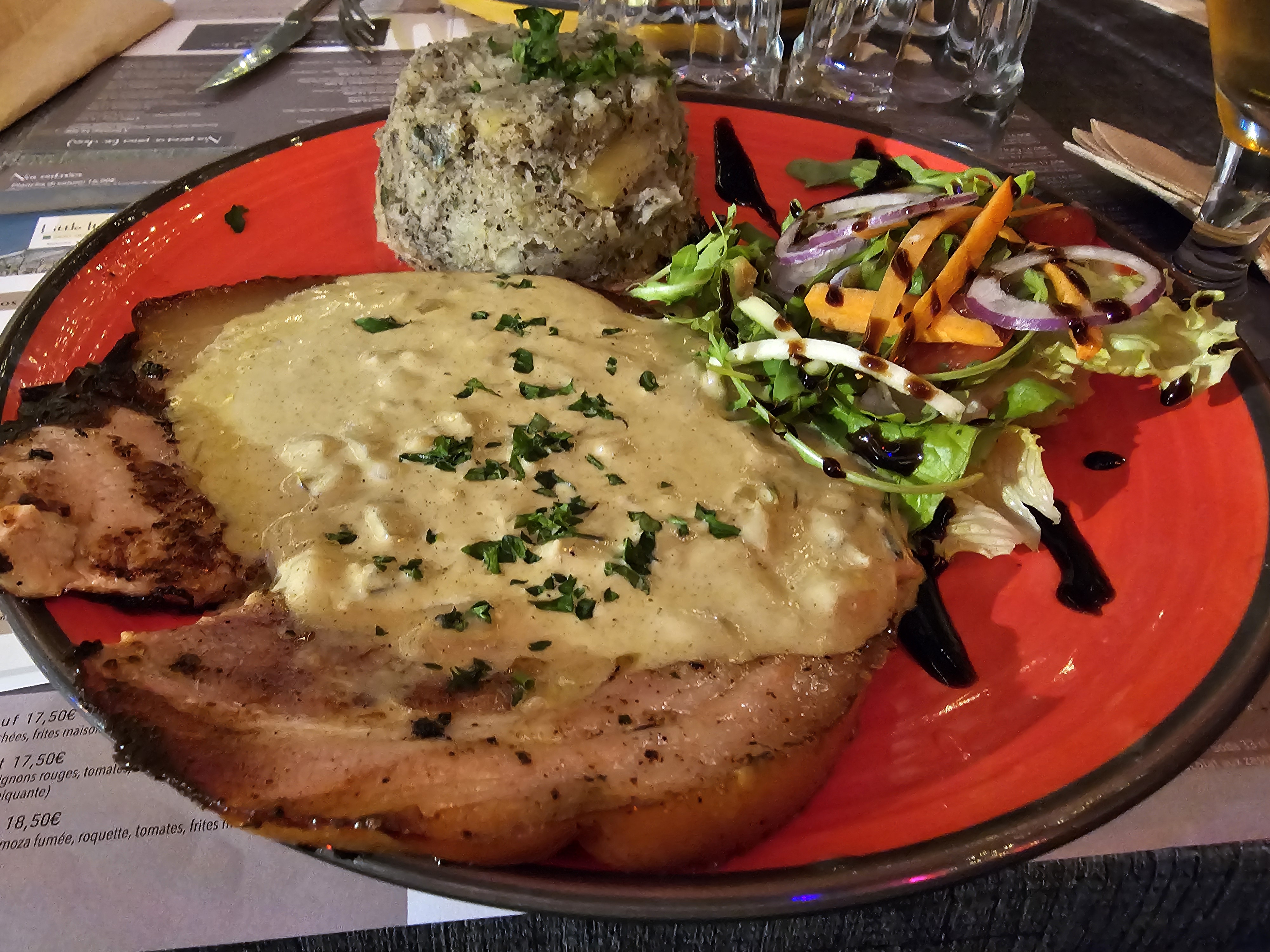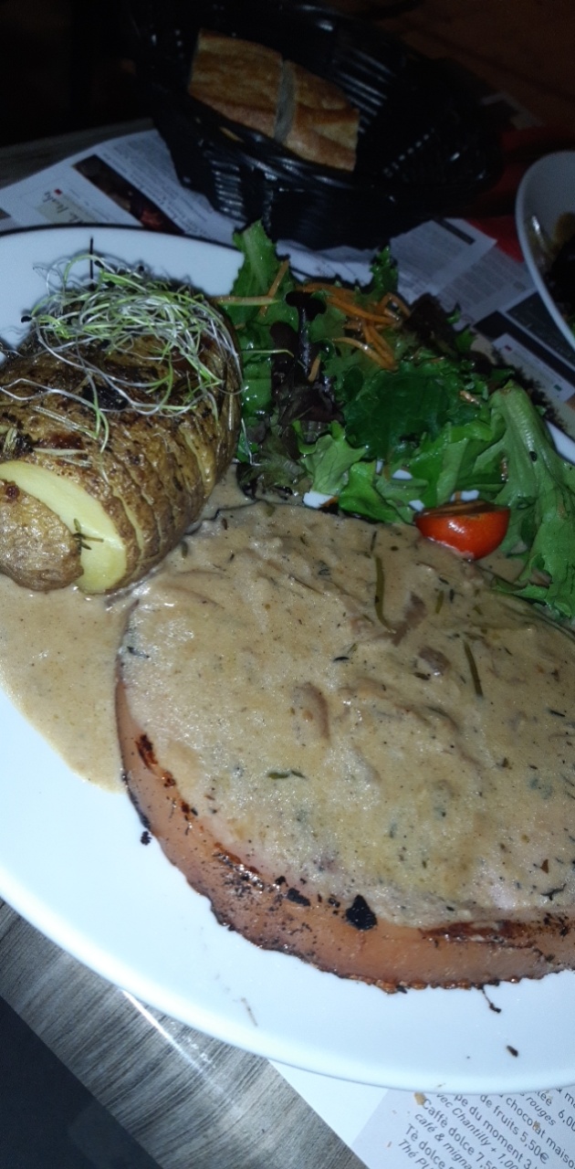 Après plusieurs passages devant ce petit restaurant, nous avons décidé de nous arrêter et vraiment pas déçu de l'accueil, le service mais surtout la qualité des plats, un duo de brochette de bœuf et ses frites Bio, et la classique escalope milanaise accompagnée de ses fusilli sur u'e sauce au truffes.