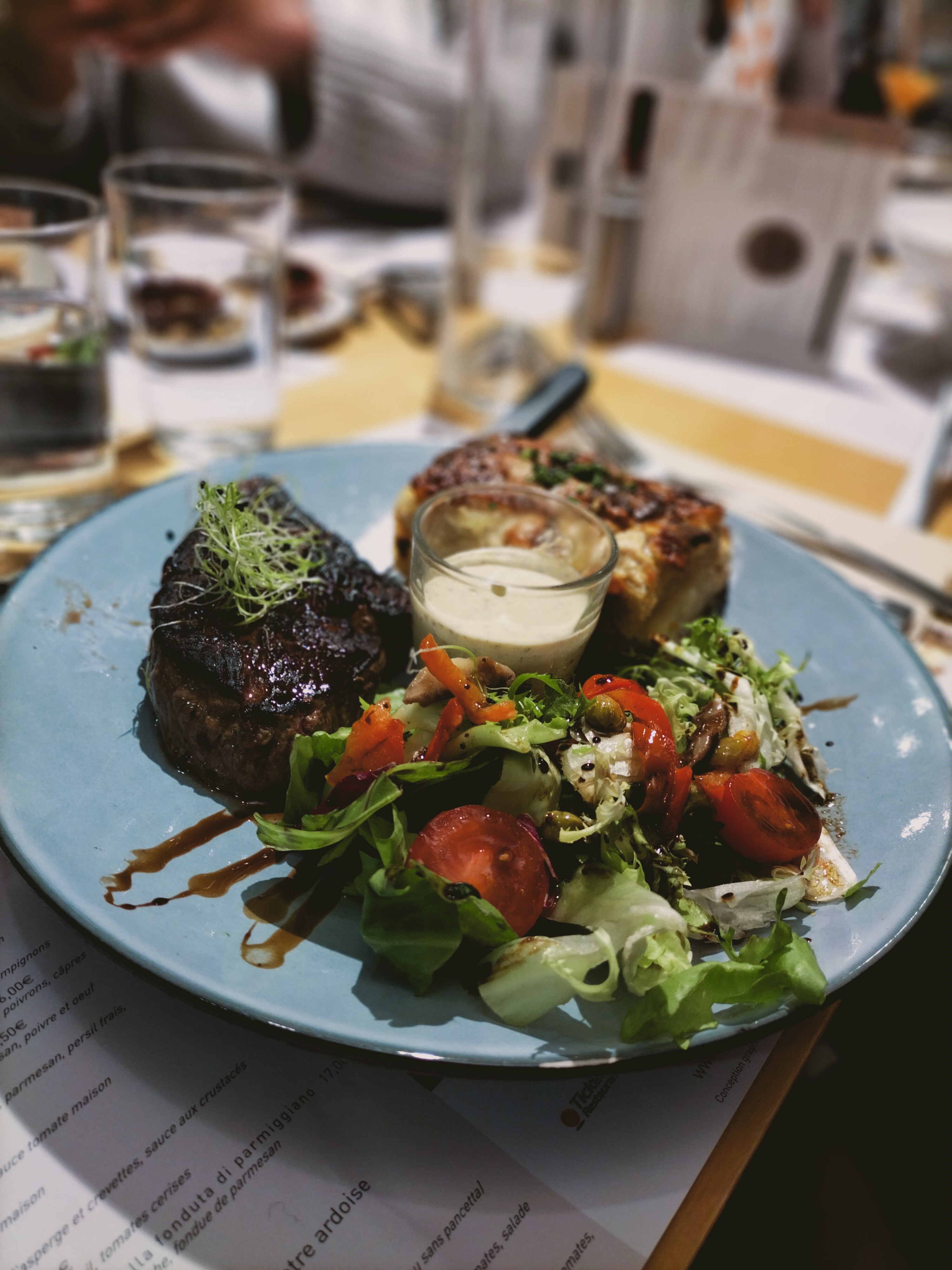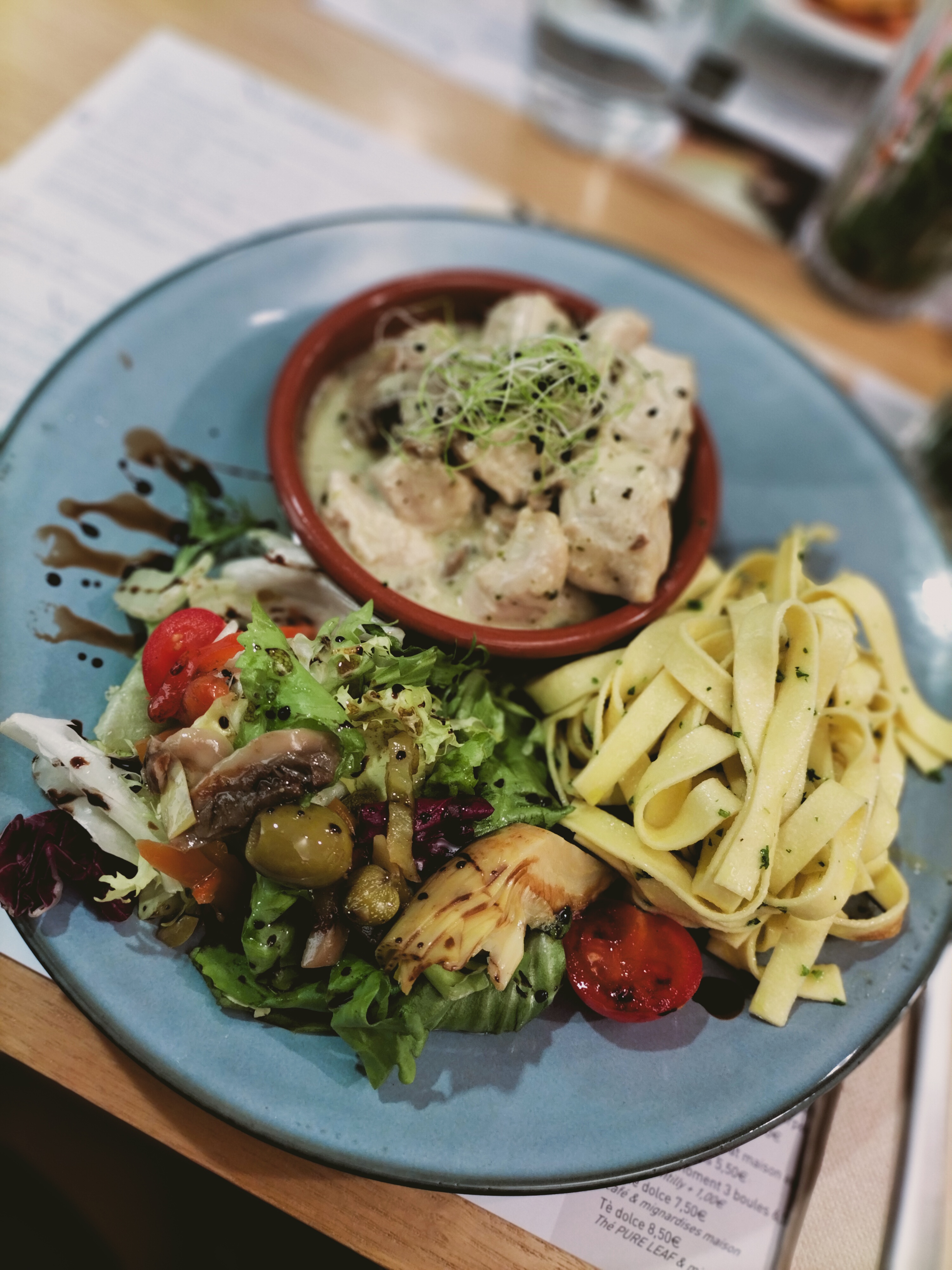 Le concept pourrait être sympathique, si les assiettes étaient des assiettes pour adultes. J'ai compté 13 ravioles. J'ai insisté pour avoir du pain et une carafe d'eau. Je n'ai pas pris de dessert, car j'ai vu la serveuse s'éclater un bouton entre le bar et l'espace où elle récupère les plats. Je précise que c'est la serveuse blonde et elle parle vraiment mal à l'autre serveuse. J'espère que l'autre va se rendre compte que ce secteur recrute vraiment en ce moment et qu'elle doit partir au lieu de se faire pourrir. Manque d'hygiène de la serveuse et son attitude avec ses chaussures de plage est déplorable. Elle traîne des pieds, on supporte le bruit de ses chaussures à lacets tout le temps qu'on mange.
