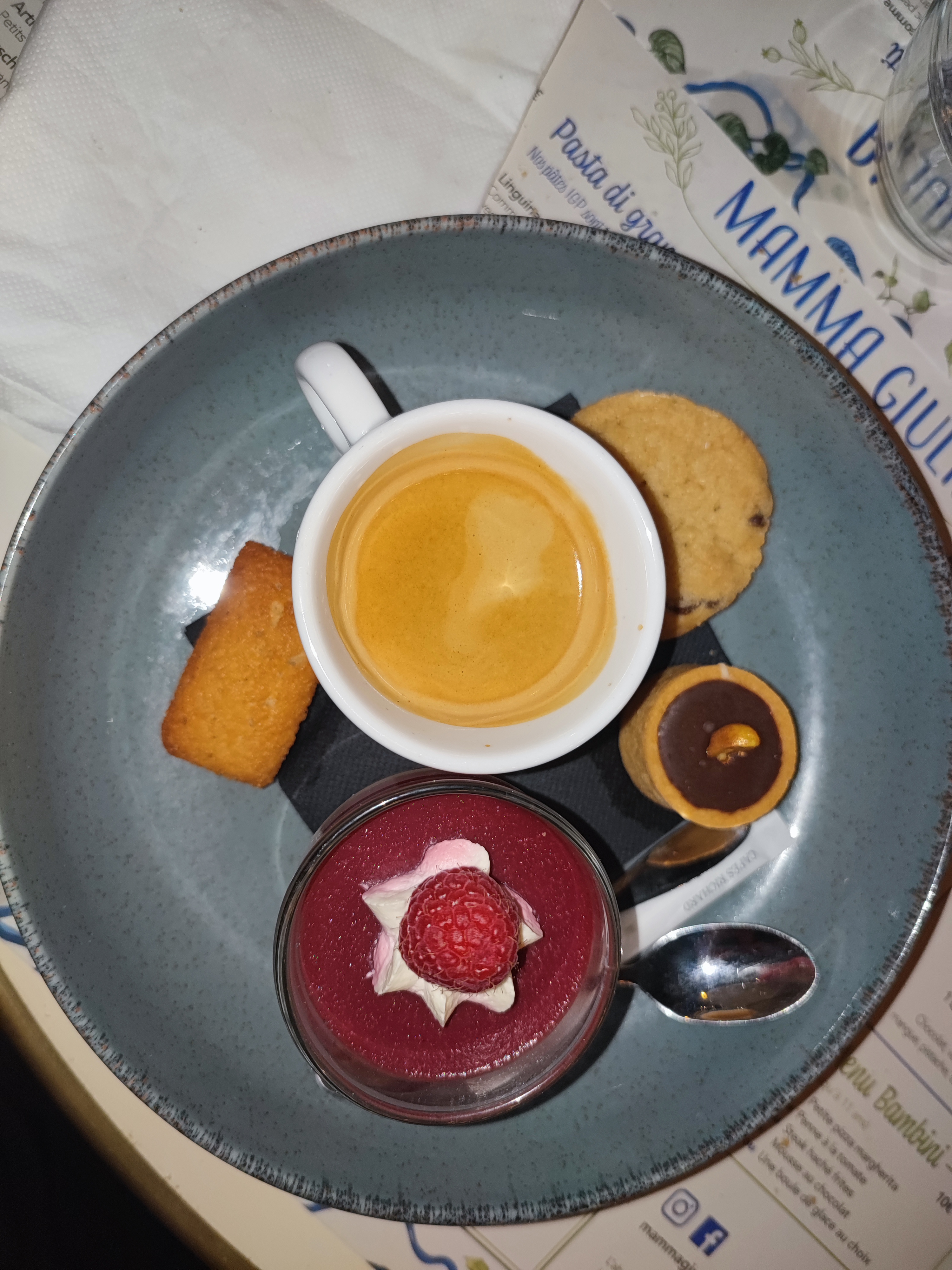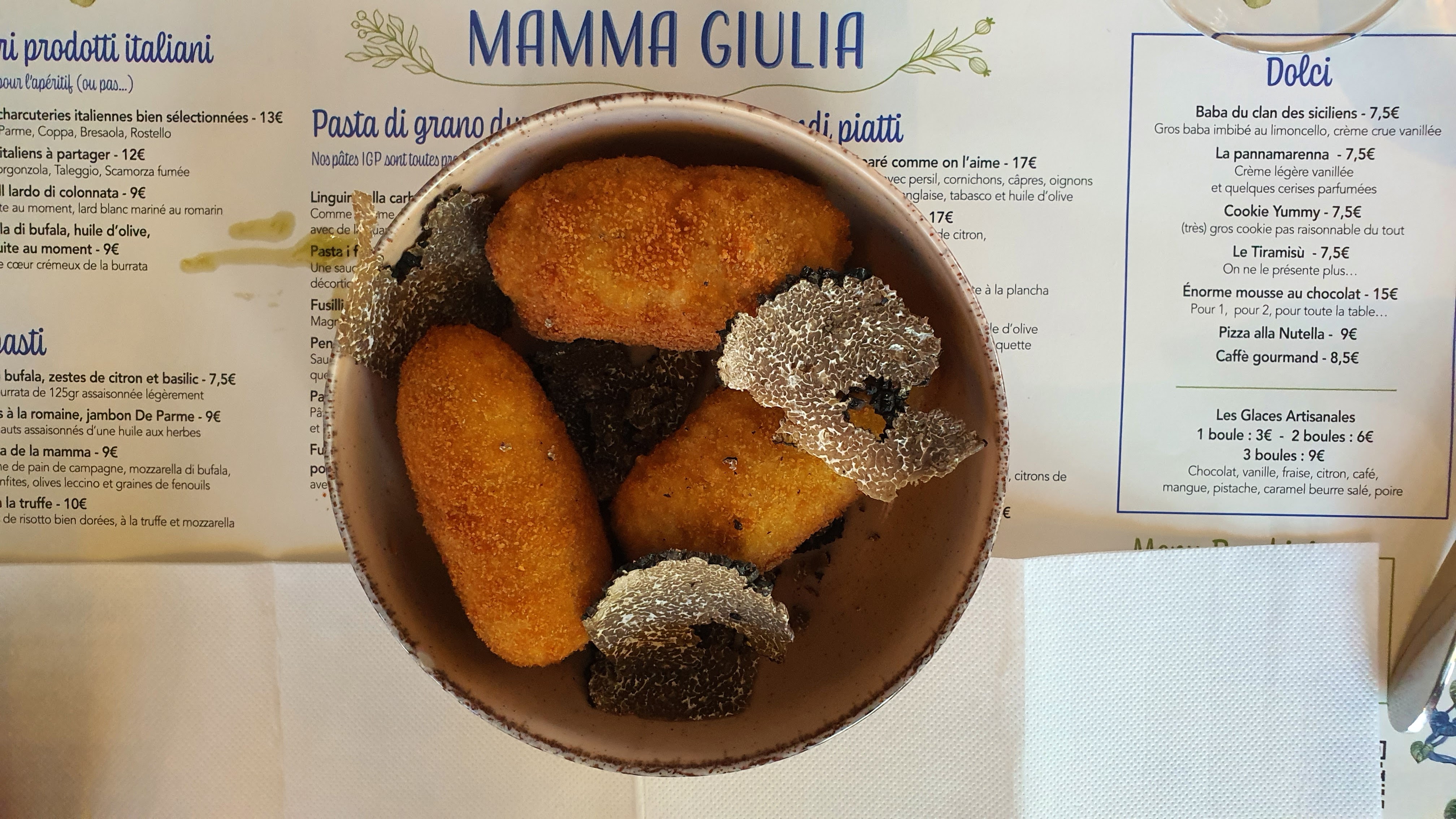 Apéro, entrée, plat et dessert tout était au top. Le service impeccable, et on a eu le droit aux super conseils d'Athina. On s'est régalé ! Ne soyez pas pressé, il y a un peu d'attente, mais normal, pas la peine de râler comme nos voisins de table, parce qu'il faut prendre en compte que tout est fait minute et maison. Merci à toute l'équipe du Mamma Giulia !