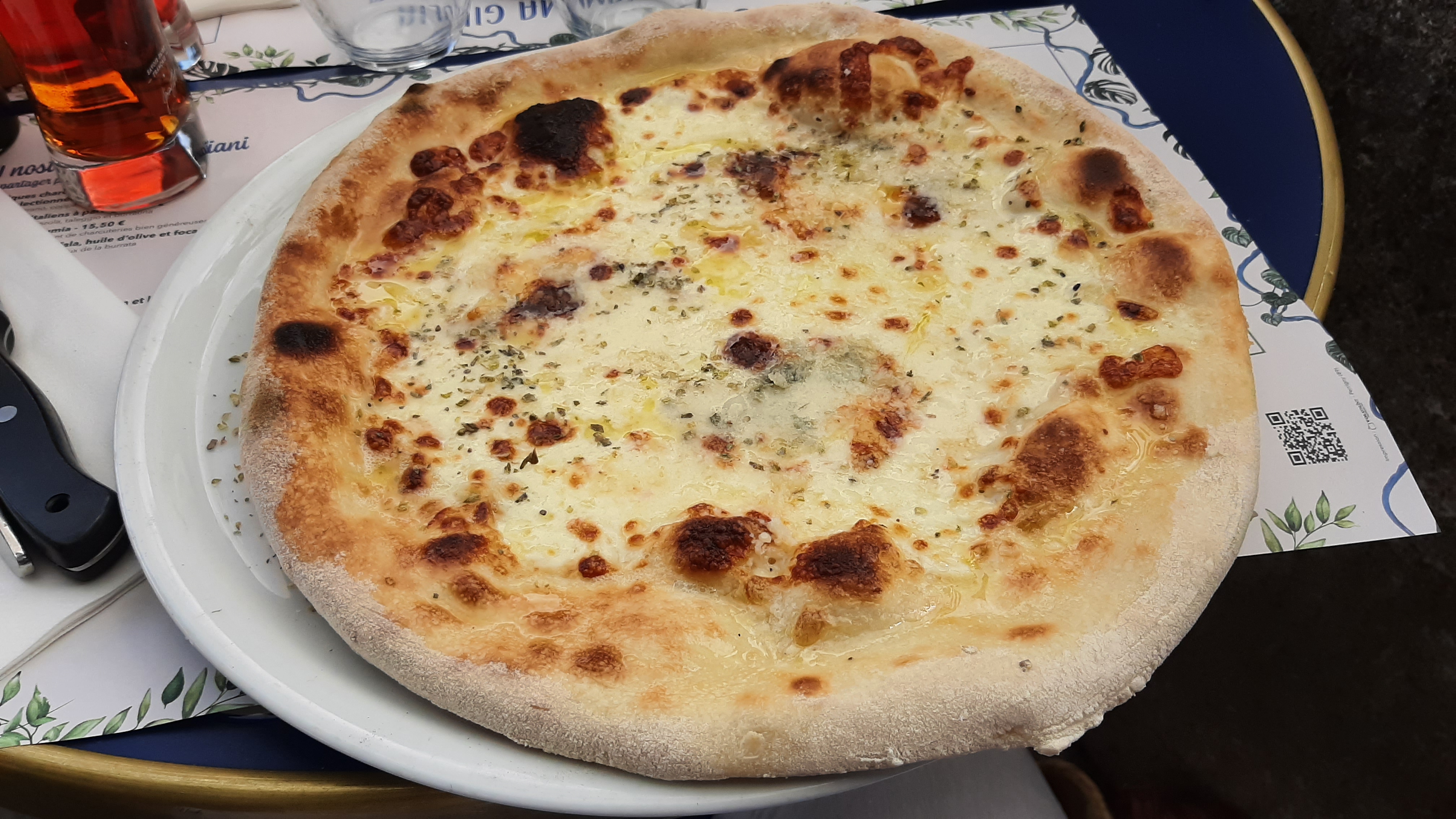 Nayant pas le menu du restaurant sous les yeux, j'ai commandé 2 pizzas en choisissant les ingrédients. Verdict : 1 parma et 1 végétarienne. Je passe récupérer et payer ma commande, et là, surprise du chef : 35,50€ pour 2 pizzas classiques à emporter. La pâte brûlée était offerte.