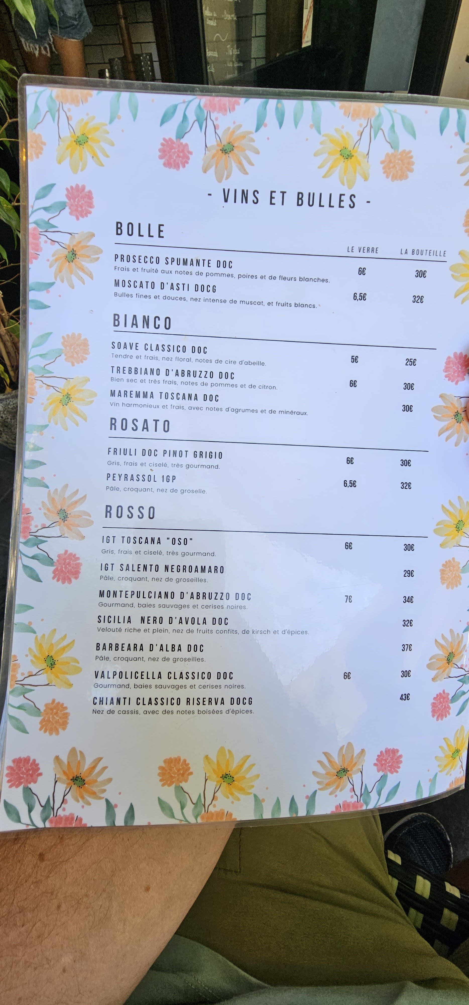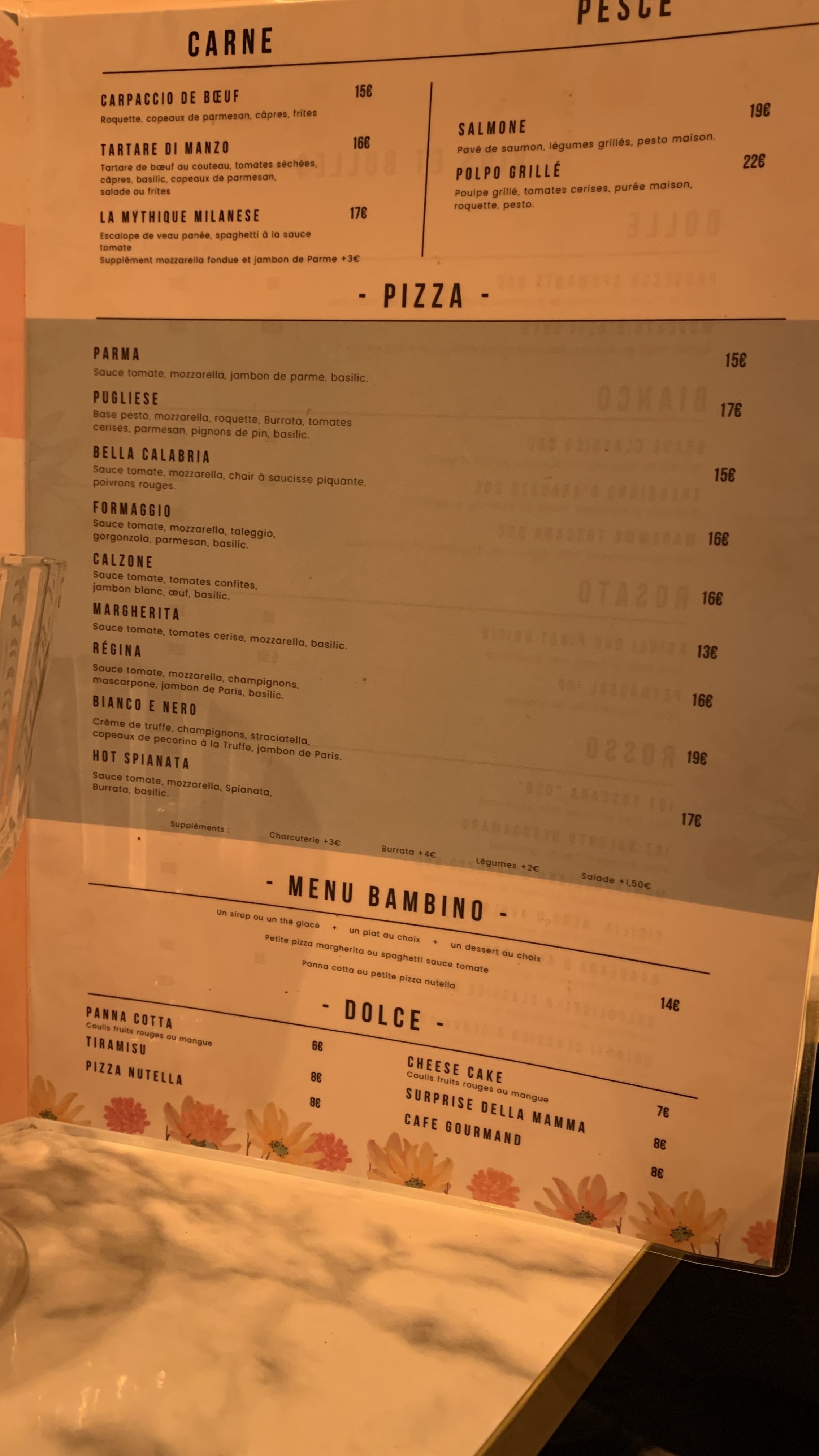 Carte avec un choix assez large , pâtes/pizzas et plats Italiens. Accueil et service agréable. Peu de restau' rue de Bordeaux, cela est agréable aussi.