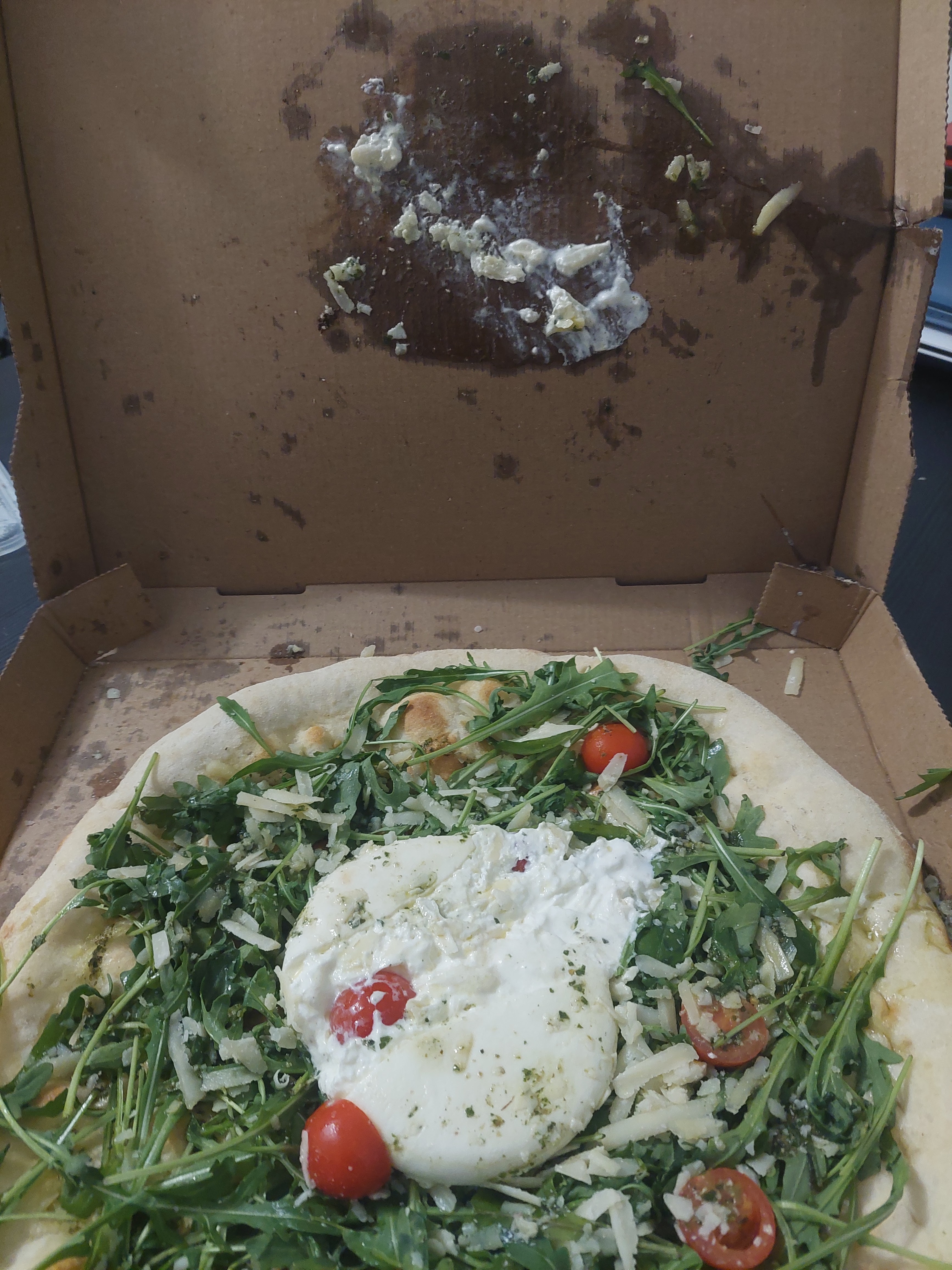 Nous avons commandé aujourd'hui une pizza Pugliese et une lasagna al forno. La lasagne n'est pas mal mais la pizza est livrée froide, mal cuite et en plus la burrata ecrasée (comme le montre la photo). Ce n'est pas du tout sérieux de la part du restaurant ainsi que le livreur qui a écrasé la pizza. Très déçu