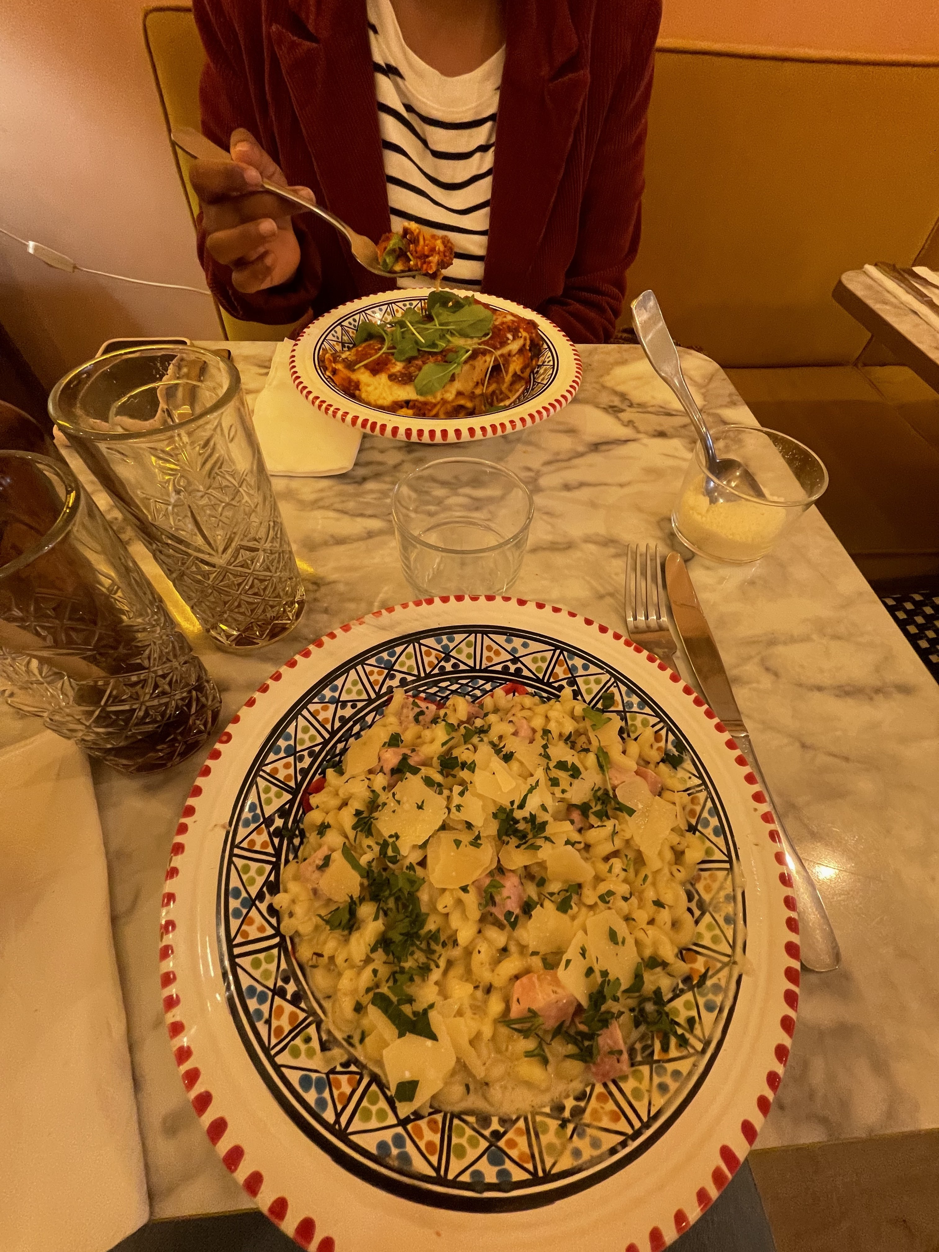 Les pâtes sont bonnes malgré une quantité très légère, digne d'une entrée... Les tables sont serrées à tel point qu'on a l'impression de manger avec les voisins... La musique est trop forte par moment et avec la proximité des tables voisines, nous avions du mal à nous entendre. De plus, le service a été long aussi bien pour prendre les commandes que pour les servir et il a fallu demander à deux reprise pour avoir une carafe d'eau.
