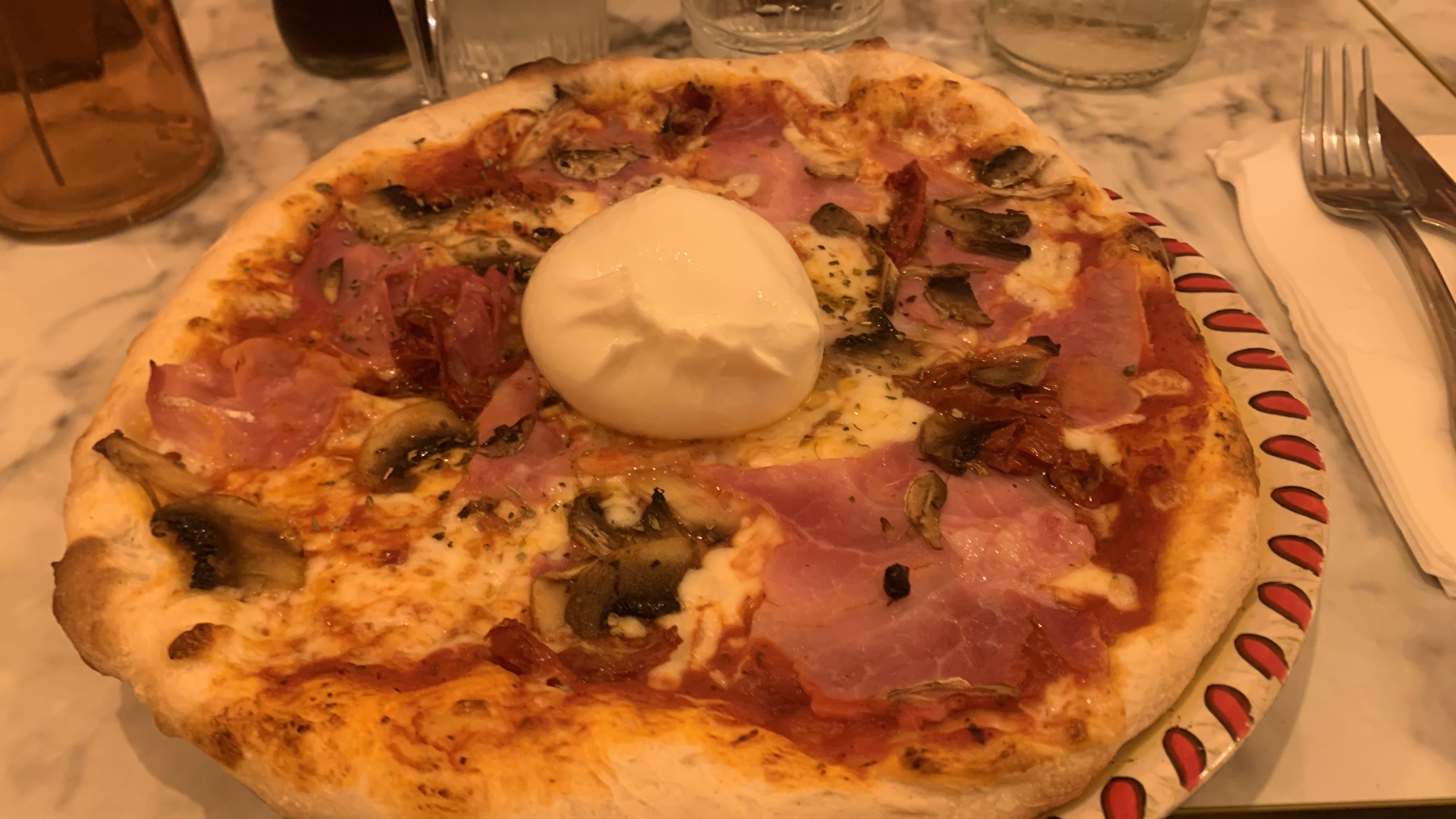 L entrée « famosa straciatella » UNE BLAGUE, le pesto je le cherche encore et pour 14€, voici la foccacia, 4 bout de pain racis… En livraison, pas de couverts alors que que demander, nous étions dans un hôtel, c est vraiment pratique. Pour le reste, prix élevé pour rien de fou