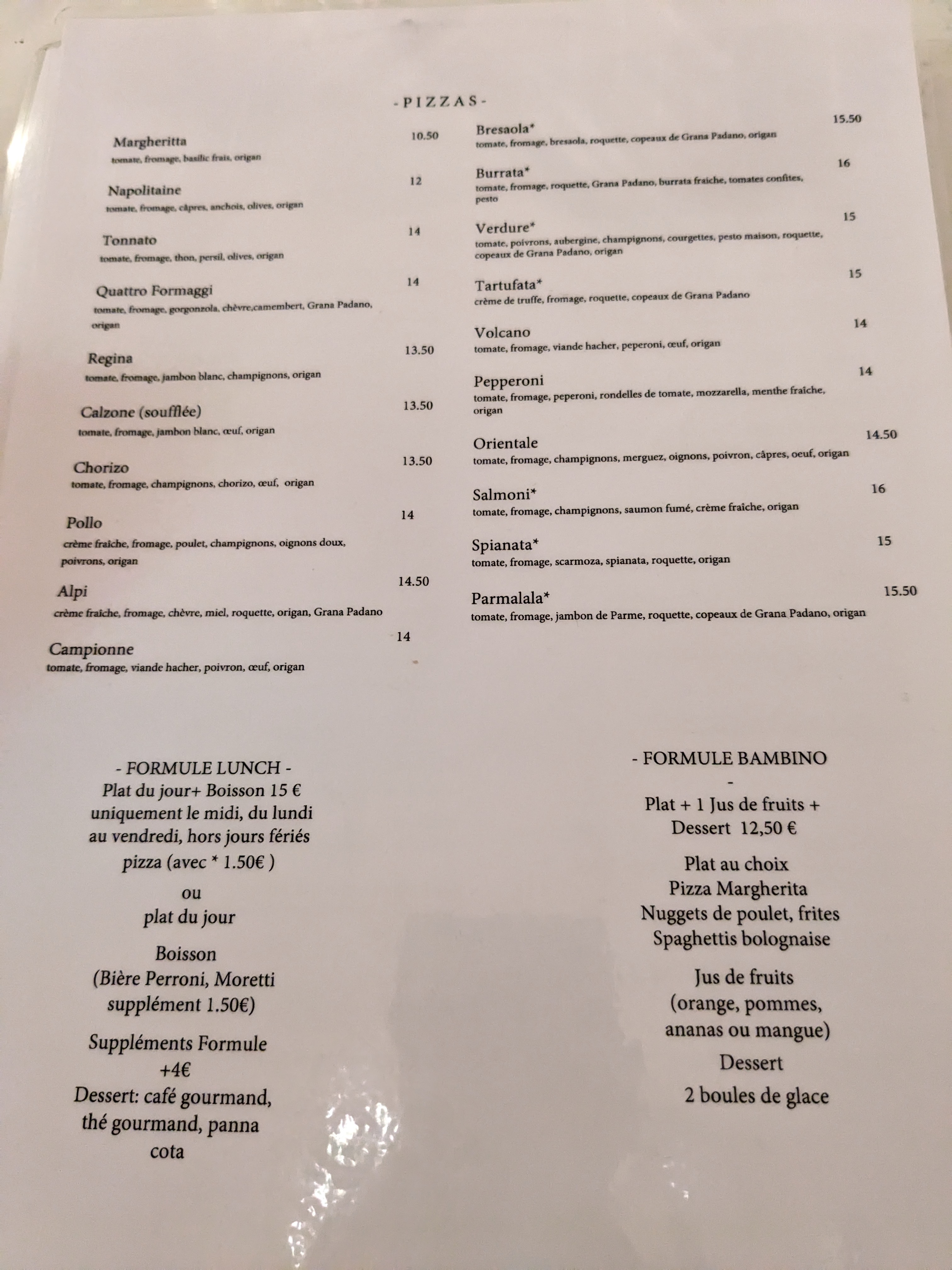 Formule à 13,90 le midi épatante. Pizza copieuse et originale (Milano).