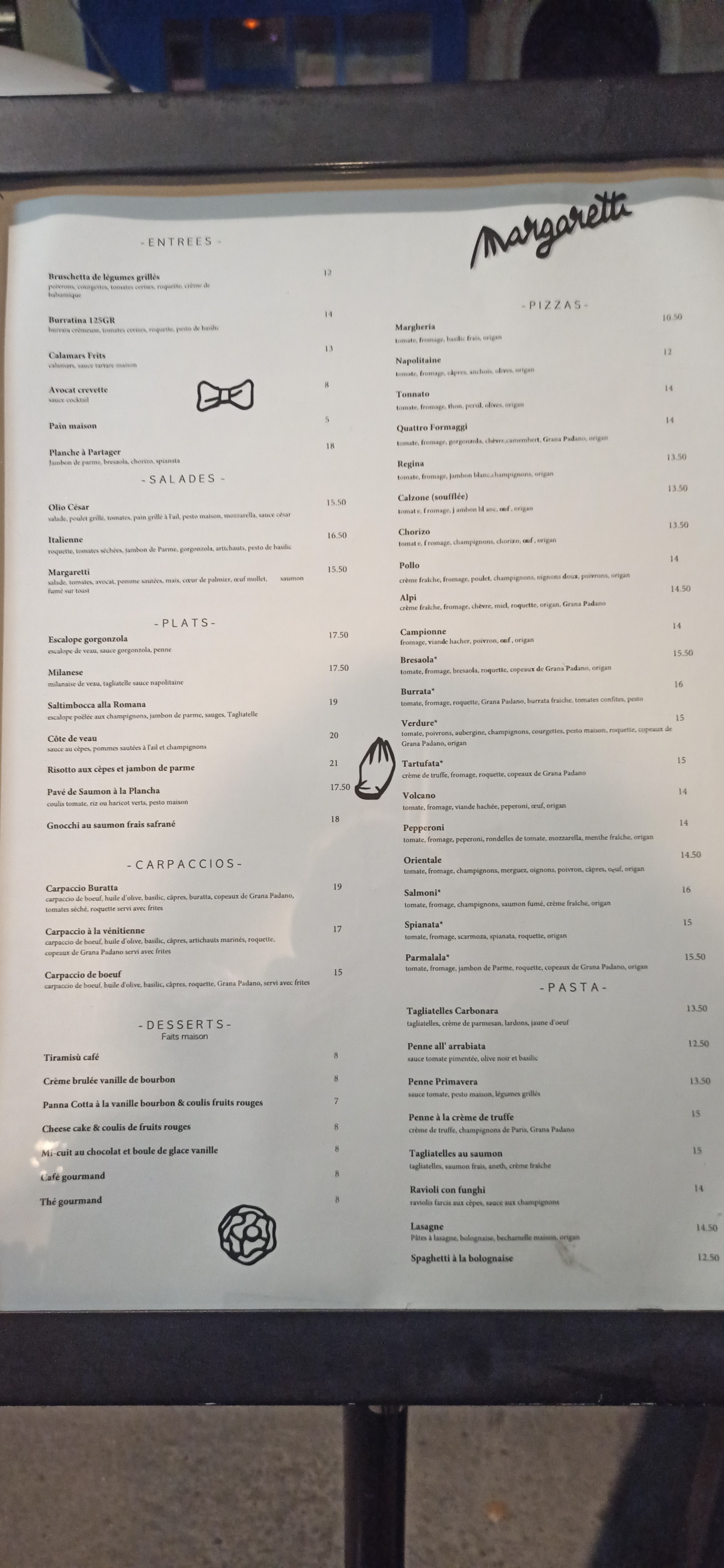 Excellent moment passé chez Margaretti. Très bonne pizza et pâte (truffes). Les deux serveurs étaient extrêmement sympa, tout était réuni pour un bon moment.