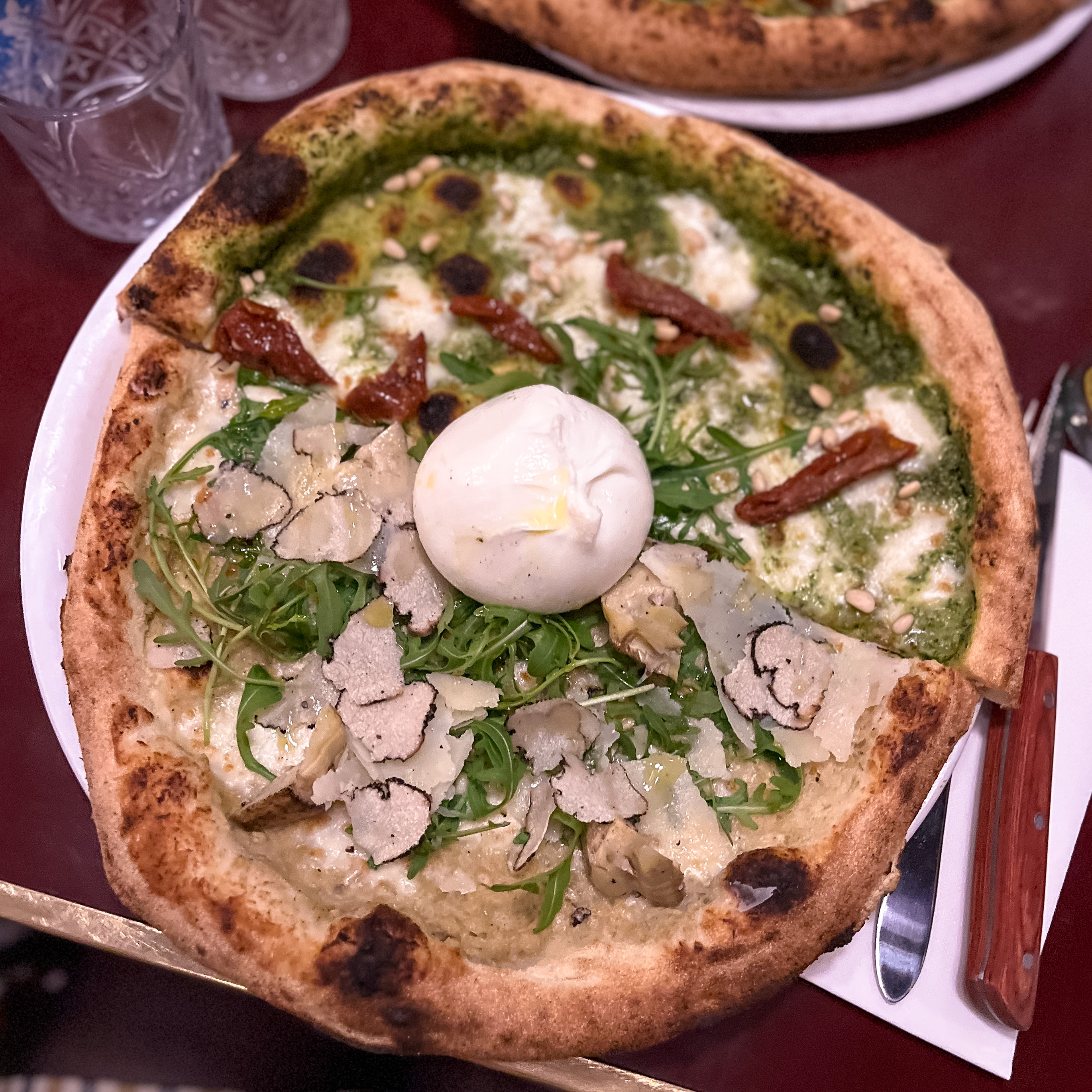 Enfin une pizza non napolitaine à Paris qui est super bonne ! Elle n’est pas molle et elle est surtout croustillante avec des recettes qui changent. Le chef est sicilien et ça se ressent. Le resto est très jolie et c’est l’endroit parfait pour manger une bonne pizza. Ils ont aussi des desserts très gourmand et aussi des entrées très bonnes. Mention spéciale pour la burrata de 300g !