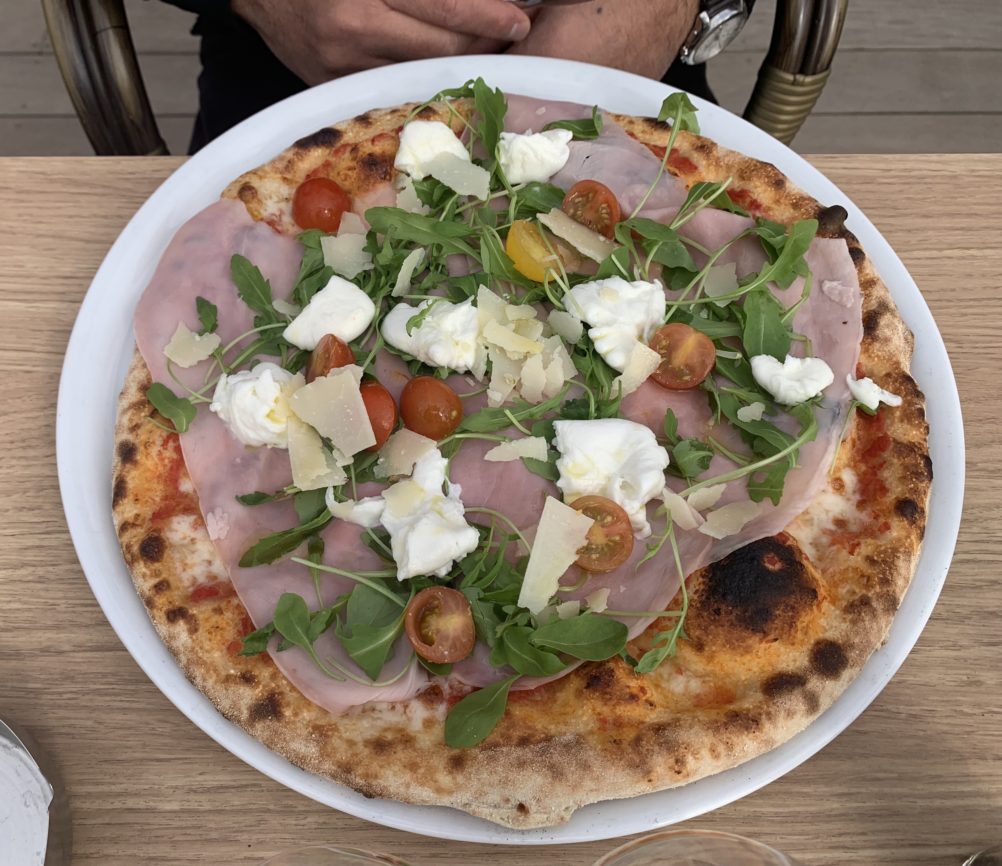 Nous étions 2 , restaurant au bord de mer. Une entrée avec burrata tomate et fraise et boule de glace : un vrai délice 😃et 2 pizzas. Il paraît que le pizzaiolo a été classé 9e au championnat du monde en Italie!!! Et je confirme elles sont exquises. J’y retournerais pour goûter les desserts cette fois même si je fais le trajet exprès de Montpellier . Que bueno!