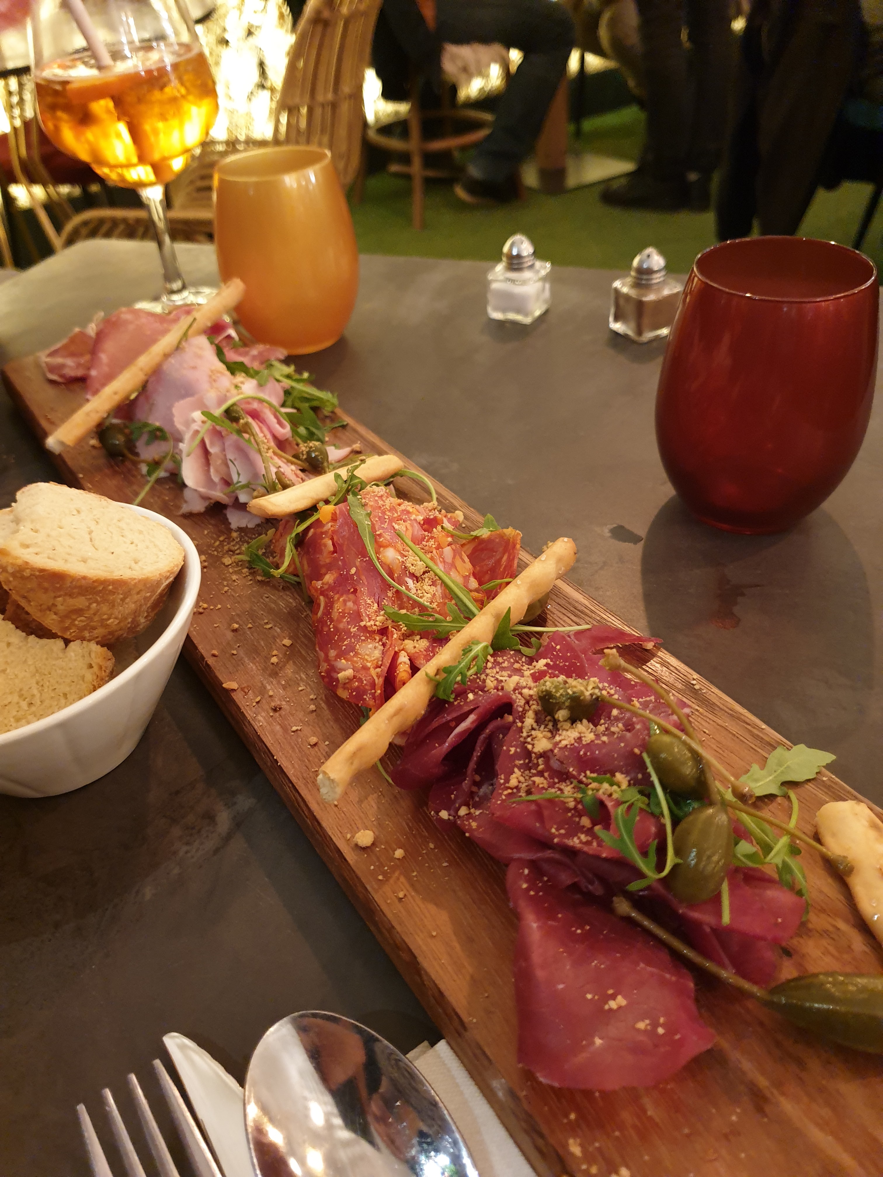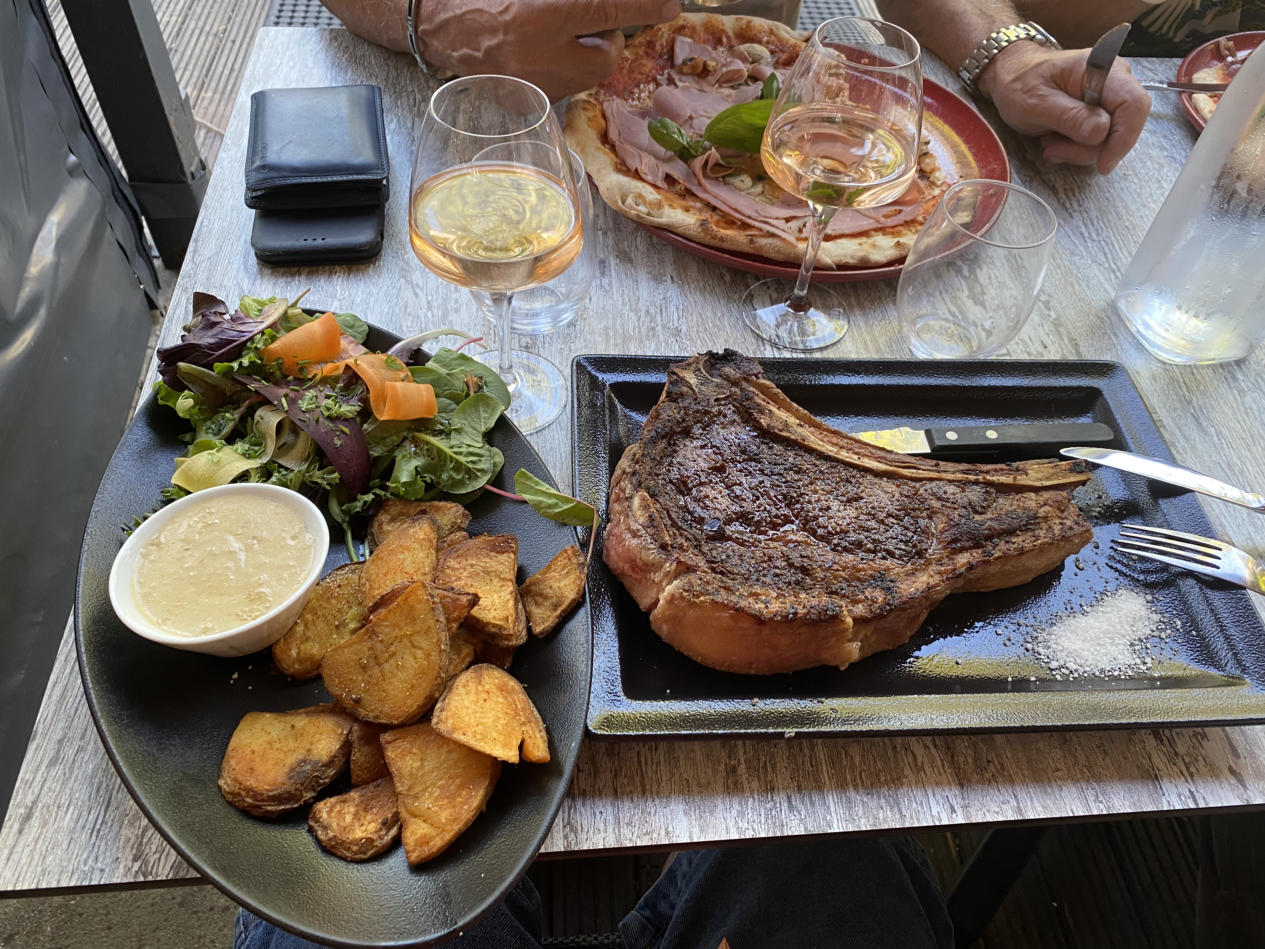 Terrasse sympathique même si elle est presque entièrement couverte. Dans l’ensemble les plats sont bons (pizza, charcuterie, poisson) c’est dommage que les prix soit excessifs notamment pour le nouveau système de planche avec des produits à l’unité et pour la cote de bœuf (80€ le kg même à Paris c’est moins cher !). Autre surprise, si vous souhaitez juste changer l’accompagnement c’est facturé 7€ !!! Du jamais vu..