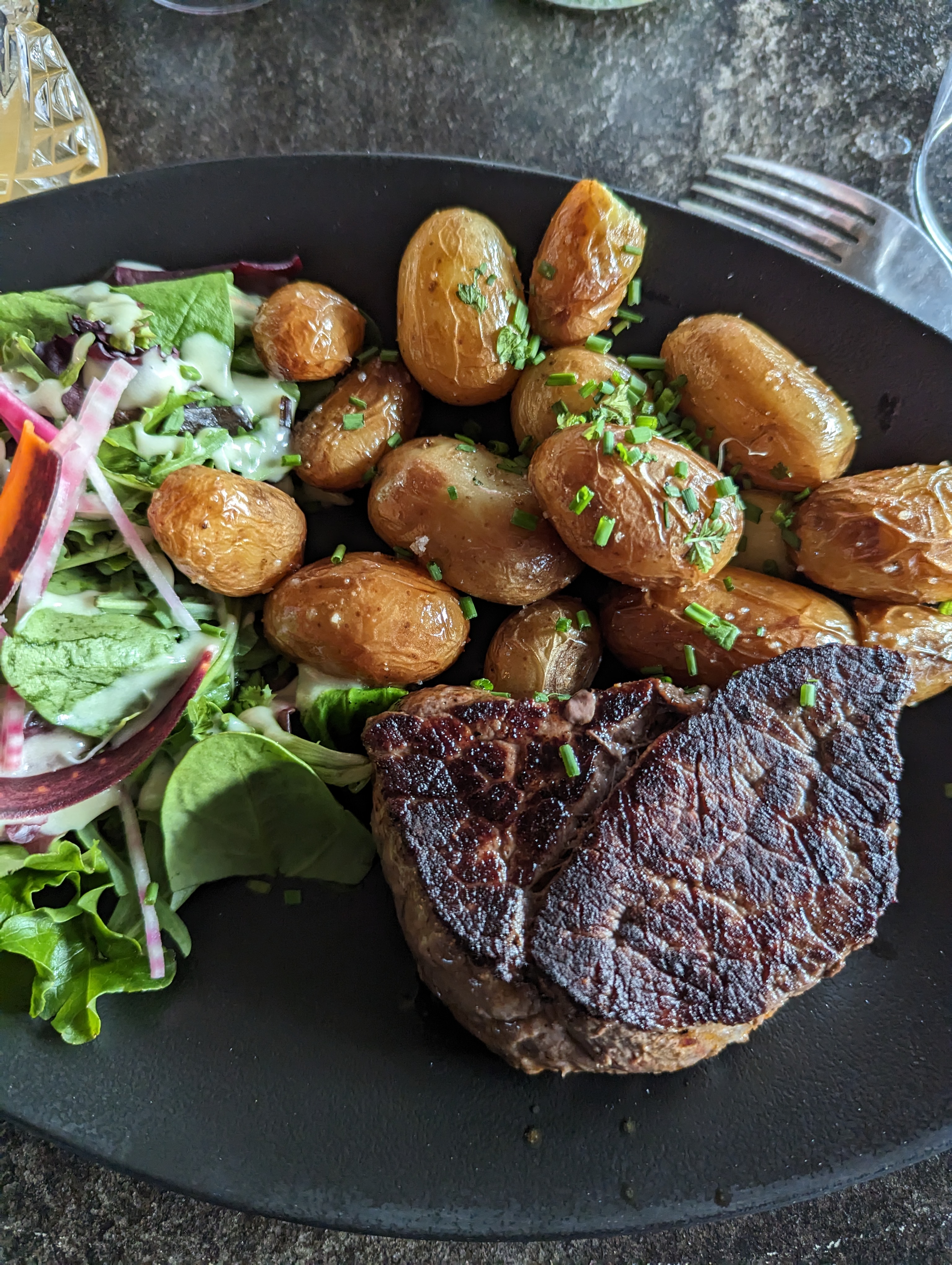 Cuisine plutôt bonne, serveur agréable,cadre jolie. Cependant je n'ai pas du tout apprécié être mise dehors à 22h. Je venais juste de finir mon dessert, on a demander des cocktails après manger ça n'ont à été refusé, ils éteignent les lumières et coupent le chauffage à 22h dessert ou pas fini pour être sûr qu'on traine pas.
