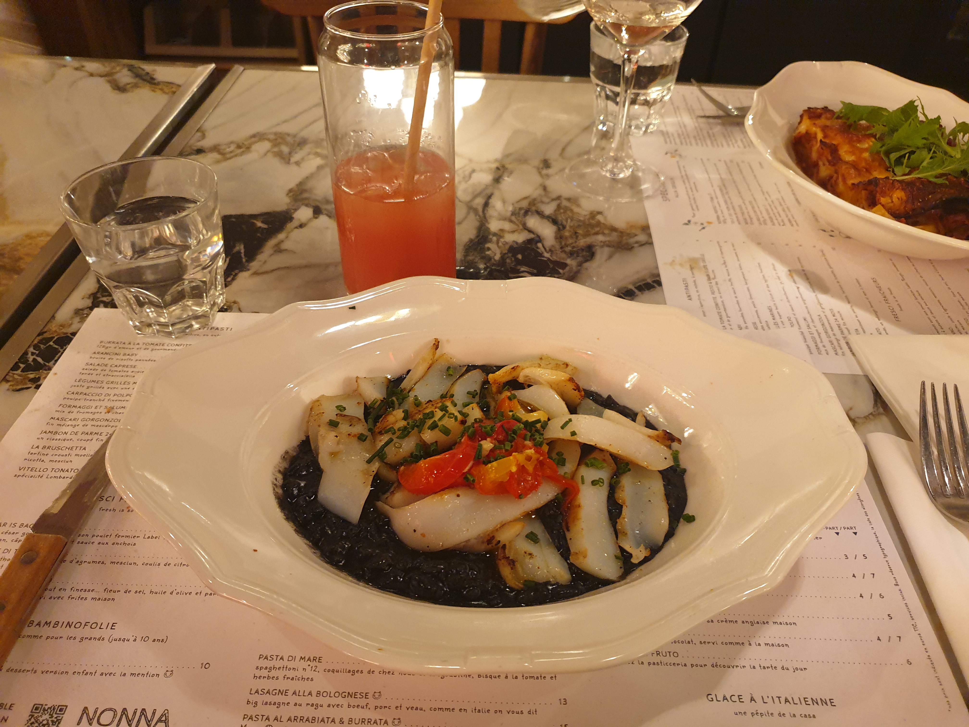 Découverte de cette trattoria, le lieu est vraiment très très beau. L'accueil est très sympathique j'ai commandé le risotto à l'encre de sèche avec la sèche et en dessert un tiramisu. Alors le risotto était bon mais beaucoup trop salé entre la sauce et le parmesan je pense quil faut revoir le dosage de sel sinon le plat il est bon . Le tiramisu vraiment bon mais j'aurais dû prendre une demi part car très très copieux. La prochaine fois je testerai la pizza 😉
