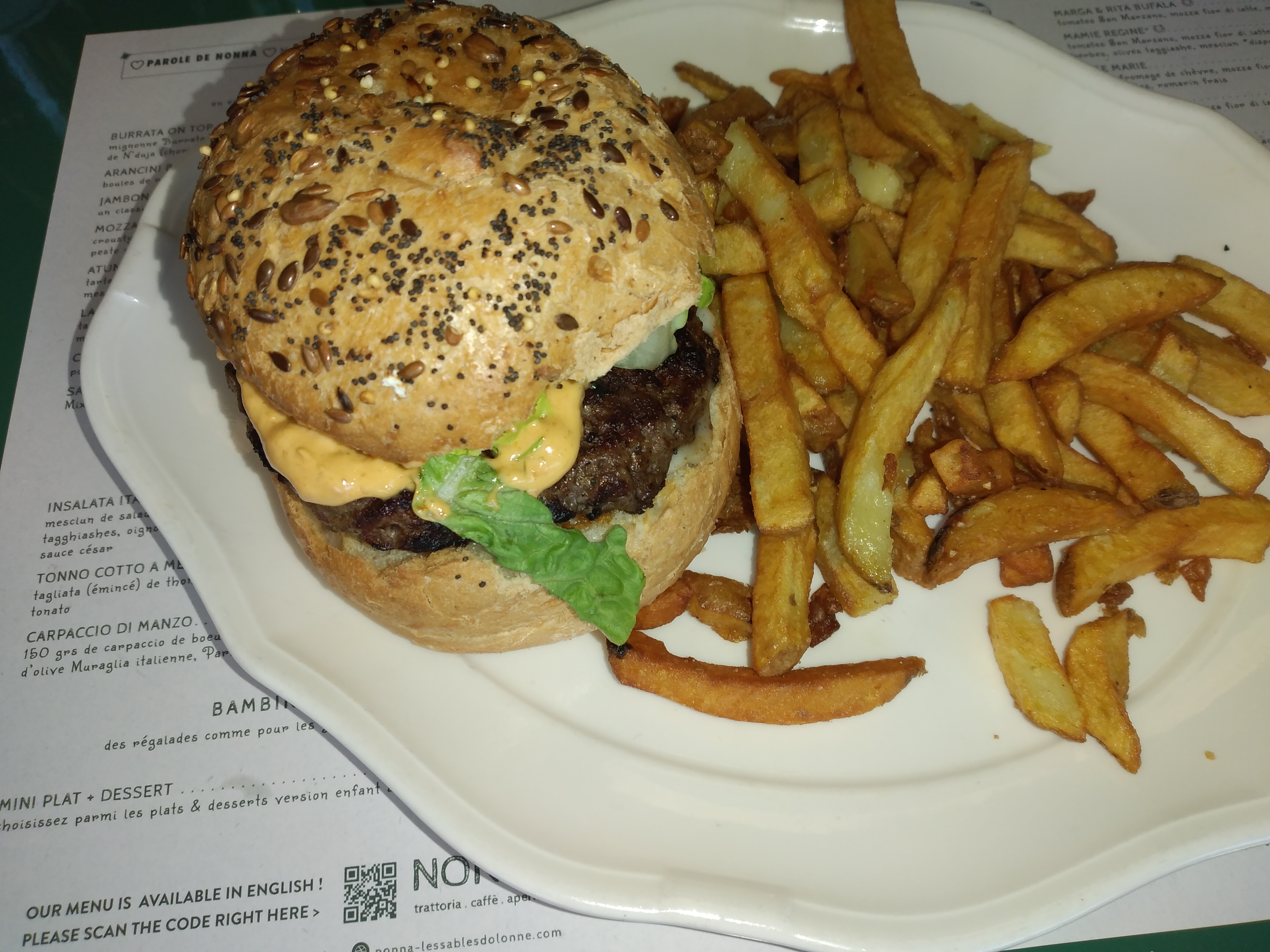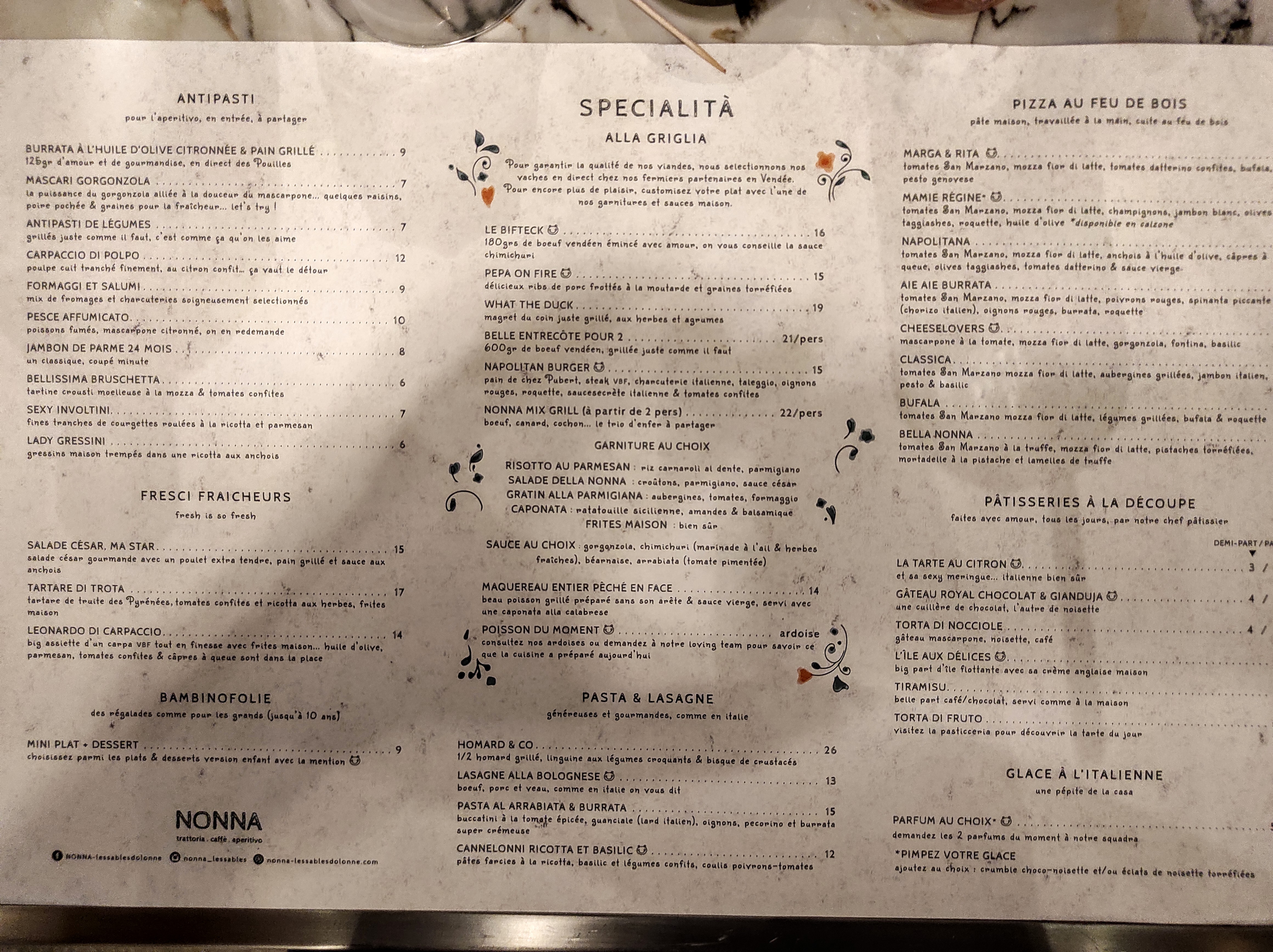 Un petit coin d'Italie au cœur des Sables-d'Olonne. Depuis l'ouverture de ce restaurant, il est rapidement devenu l'un de mes endroits favoris pour un repas en famille. Si vous appréciez la cuisine italienne, c'est un lieu que vous devez absolument découvrir. L'ambiance y est très agréable, avec des serveurs sympathiques. En ce qui concerne la cuisine, vous y trouverez des produits de qualité achetés localement. Les plats sont dignes de la cuisine italienne traditionnelle, généreux et délicieux. Si vous ne parvenez pas à tout finir, ne vous inquiétez pas, les serveurs vous proposent d'emporter votre repas pour que vous puissiez prolonger l'expérience culinaire à la maison. Si vous avez encore de la place après le plat principal, jetez un coup d'œil à la vitrine de desserts. Ils sont tous généreux et gourmands, mais si je devais en recommander un en particulier, ce serait leur magnifique tiramisu. Pour résumer, La Nonna est un restaurant parfait pour un repas en famille, entre amis ou pour un premier rendez-vous. Son ambiance chaleureuse et conviviale vous transportera directement en Italie.