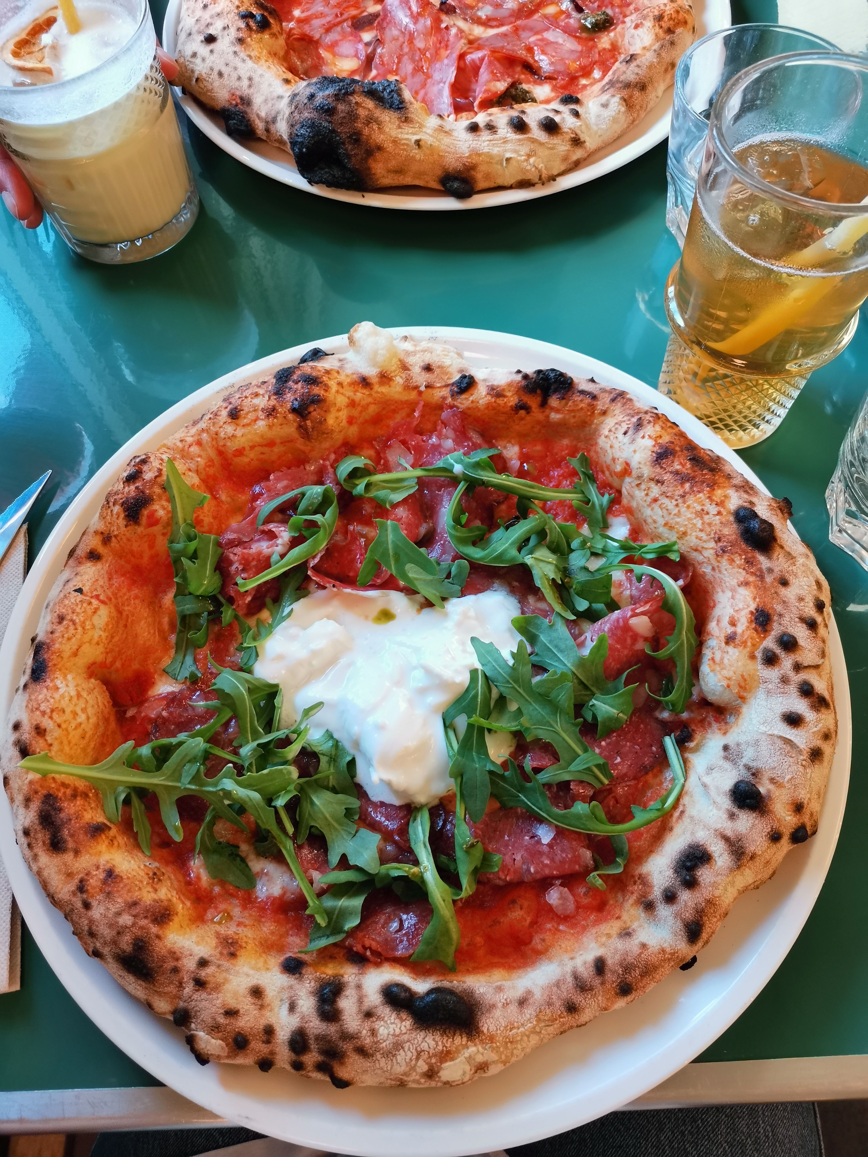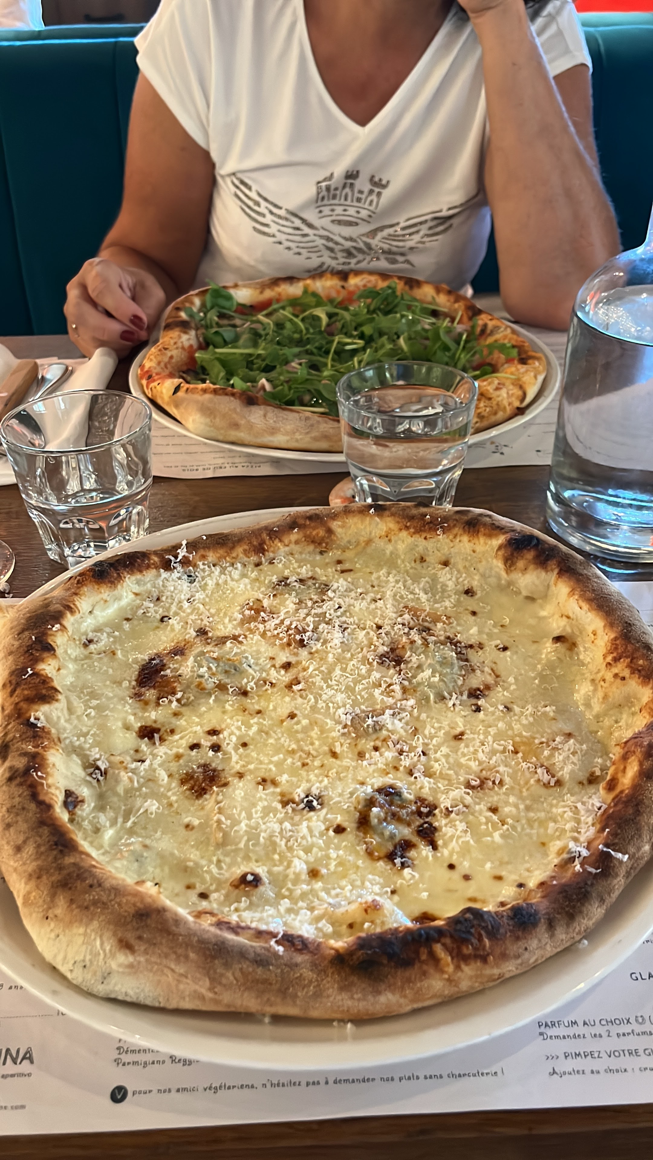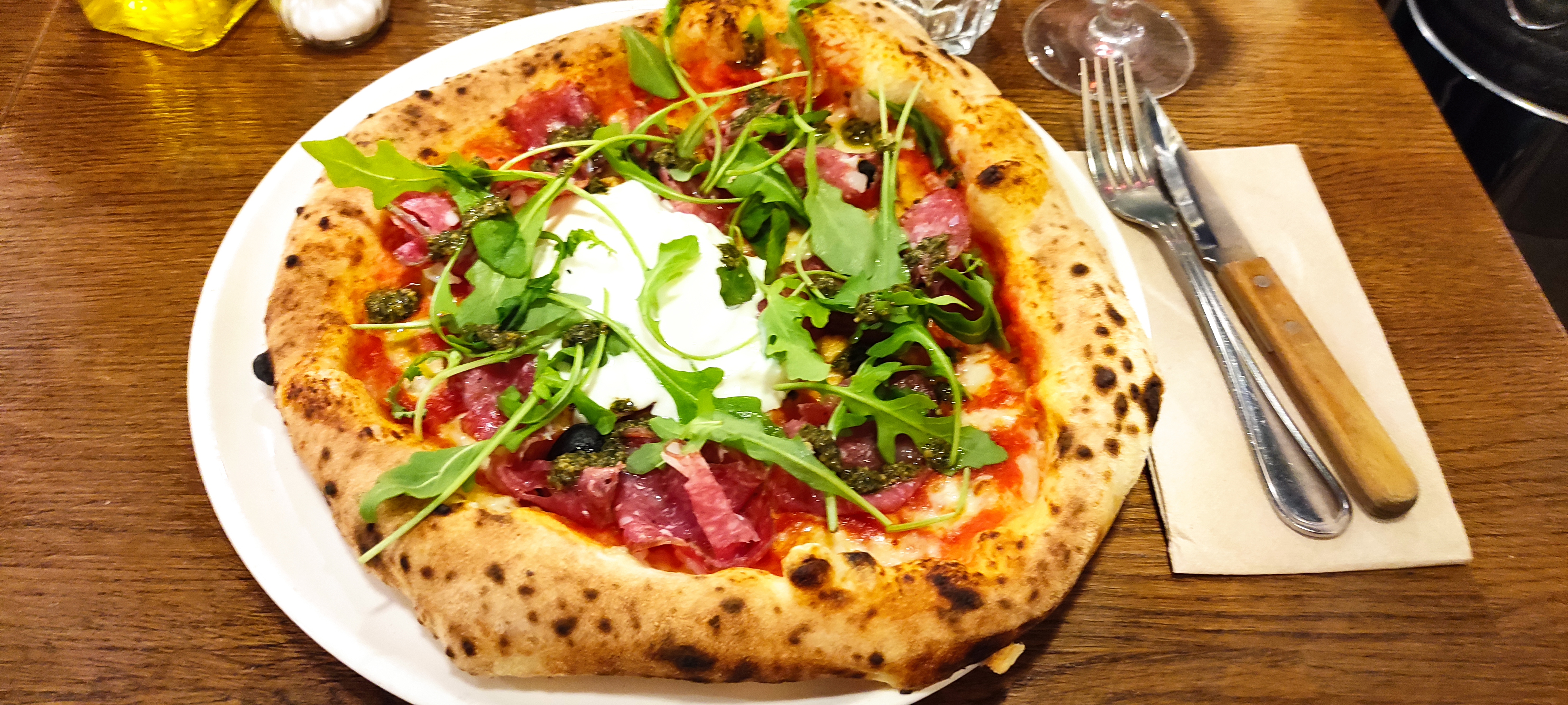 La pâte des pizzas est incroyablement élastique ; si la garniture est bonne, l’ensemble n’est pas plaisant. Dommage, la deco est sympa. Nous ne recommandons donc vraiment pas les pizzas. Les verres de vin étaient quelconques.