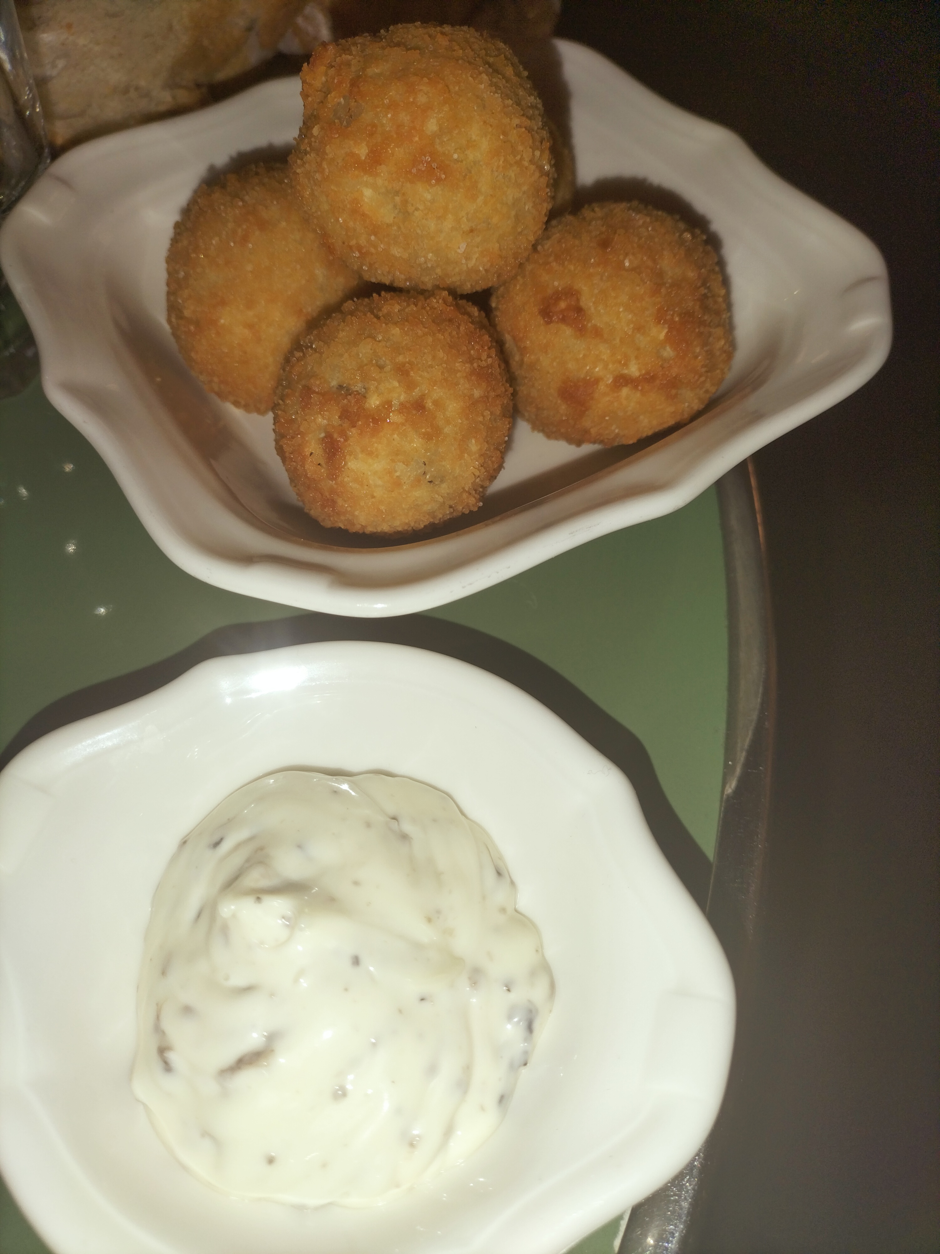 Entrée : arancini baby Grosse déception, ça n'a pas du tout le goût ni l'aspect d'arancini. Comme son nom l'indique ils devraient être orange mais là ils sont noir carbonisé (voir photo). La chapelure est trop salé et forme une espèce de croquette autour du risotto qui lui est pas mauvais. C'est servis avec de la crème fraîche alors là je comprends vraiment pas ! Plat : pizza reine Vraiment une très bonne pizza. Comme je les aiment avec une pâte bien aérée pas trop fine mais pas trop espèce non plus et des ingrédients de qualité. J'avais eu peur avec l'entrée mais là pizza est vraiment top. Dessert : tiramisu Là aussi très bon avec des boudoir bien trempé dans le café un dessert maîtrisé, très bon :D