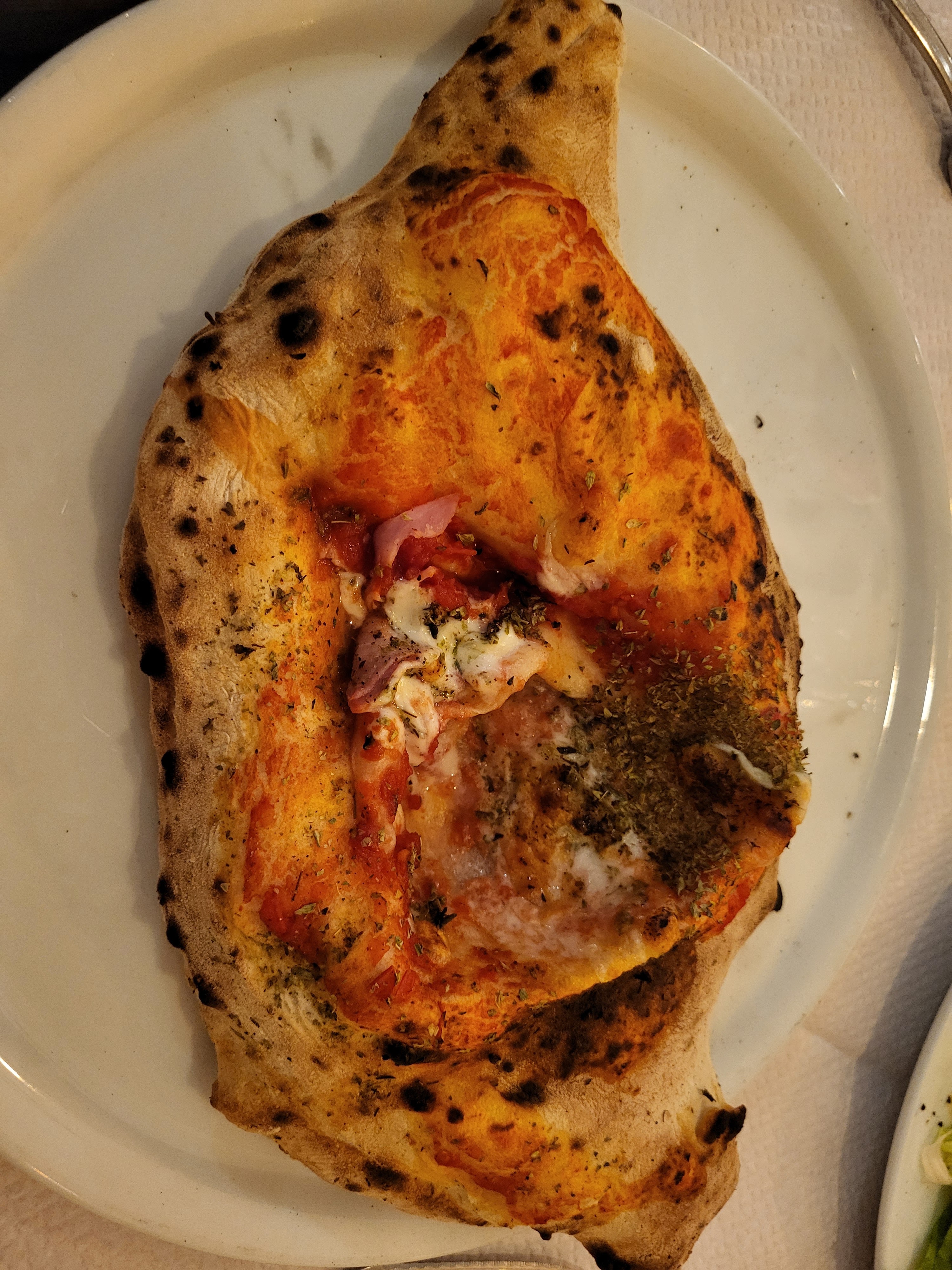 Calzone parfaite 👌une pâte juste divine cuisson au top jambon trancher fin l'origan dessus juste une folie à refaire sans hésité Crème caramel basique juste servi avec la petite cuillère nageant dans le caramel 😒
