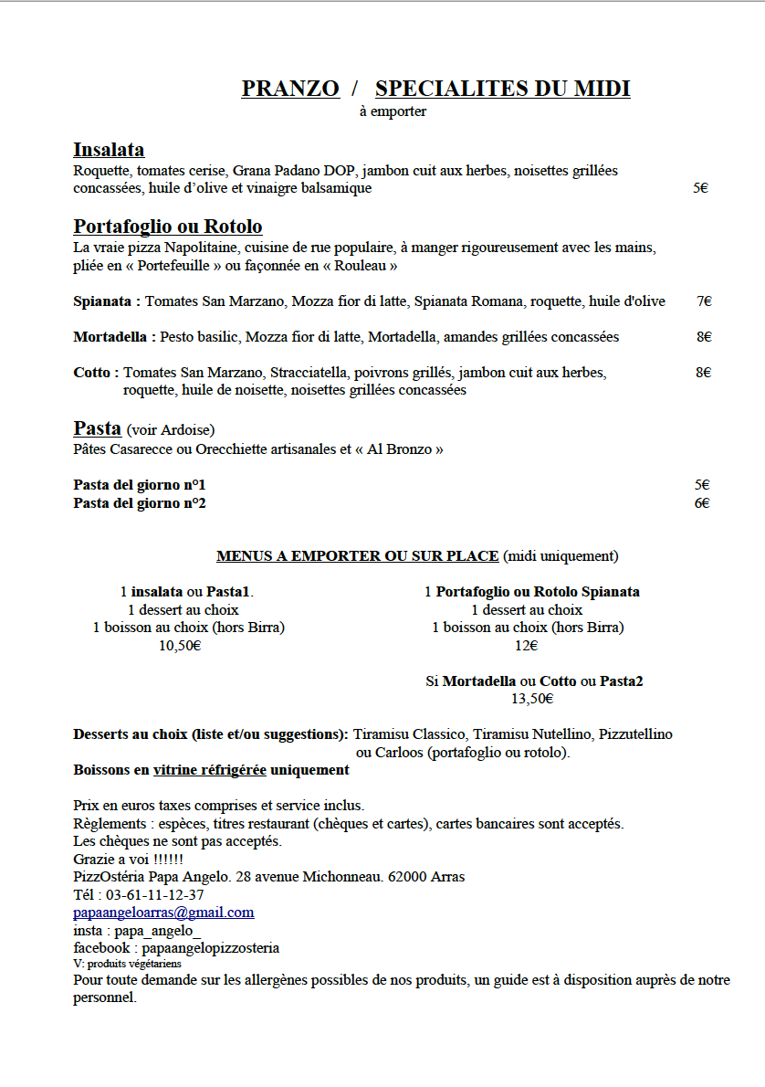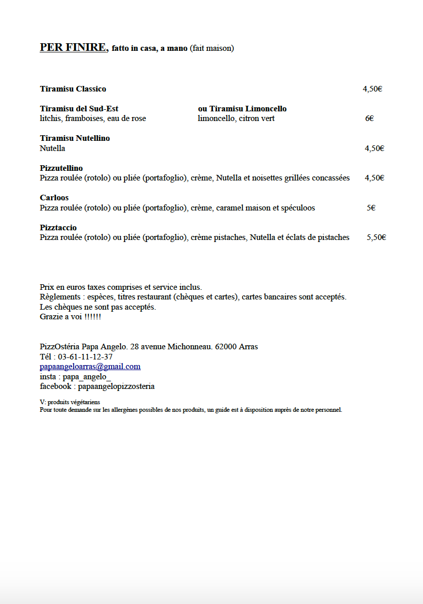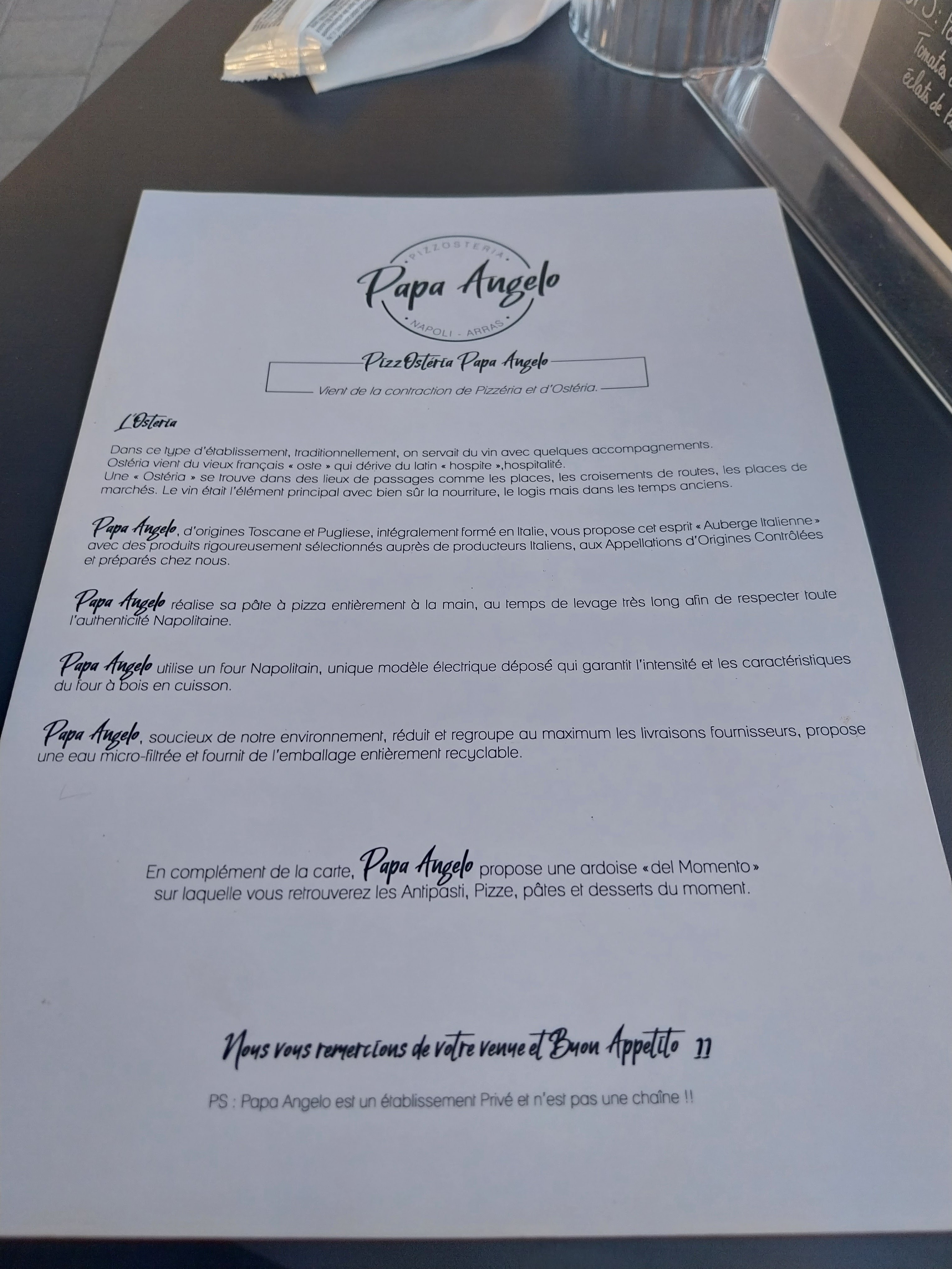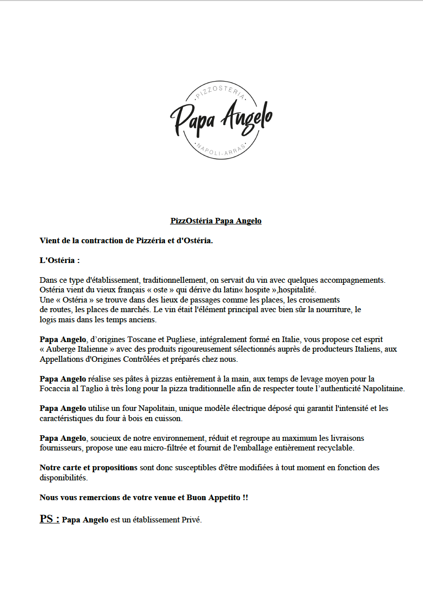 Bonjour Papa Angelo est la meilleure pizzeria d'Arras. Tout est fait maison avec de bons produits frais. Les serveurs et serveuses ainsi que le patron sont très agréables et serviable. Les pizzas et les desserts sont excellents .Je vous recommande cet établissement qui est une valeur sûre . A très bientot