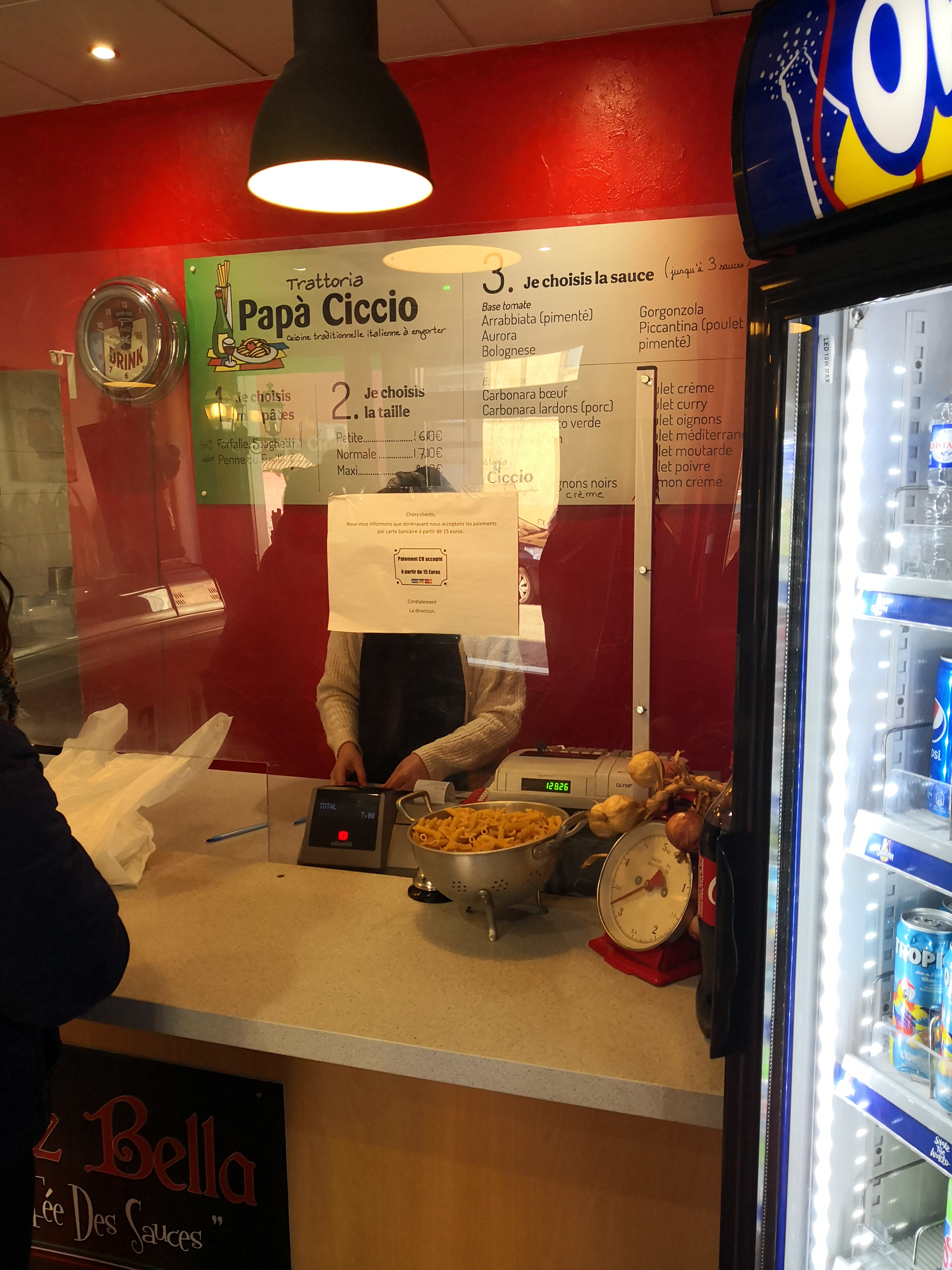 Direction sympathique et pâtes et sauces excellentes. Beaucoup de choix, et bonne taille de barquettes. Parfois, il n'y a pas assez de sauce (je pense que cela dépend par qui on est servi). L'étoile en moins est surtout pour le point écologique : il faudrait revoir les emballages encore en plastique.