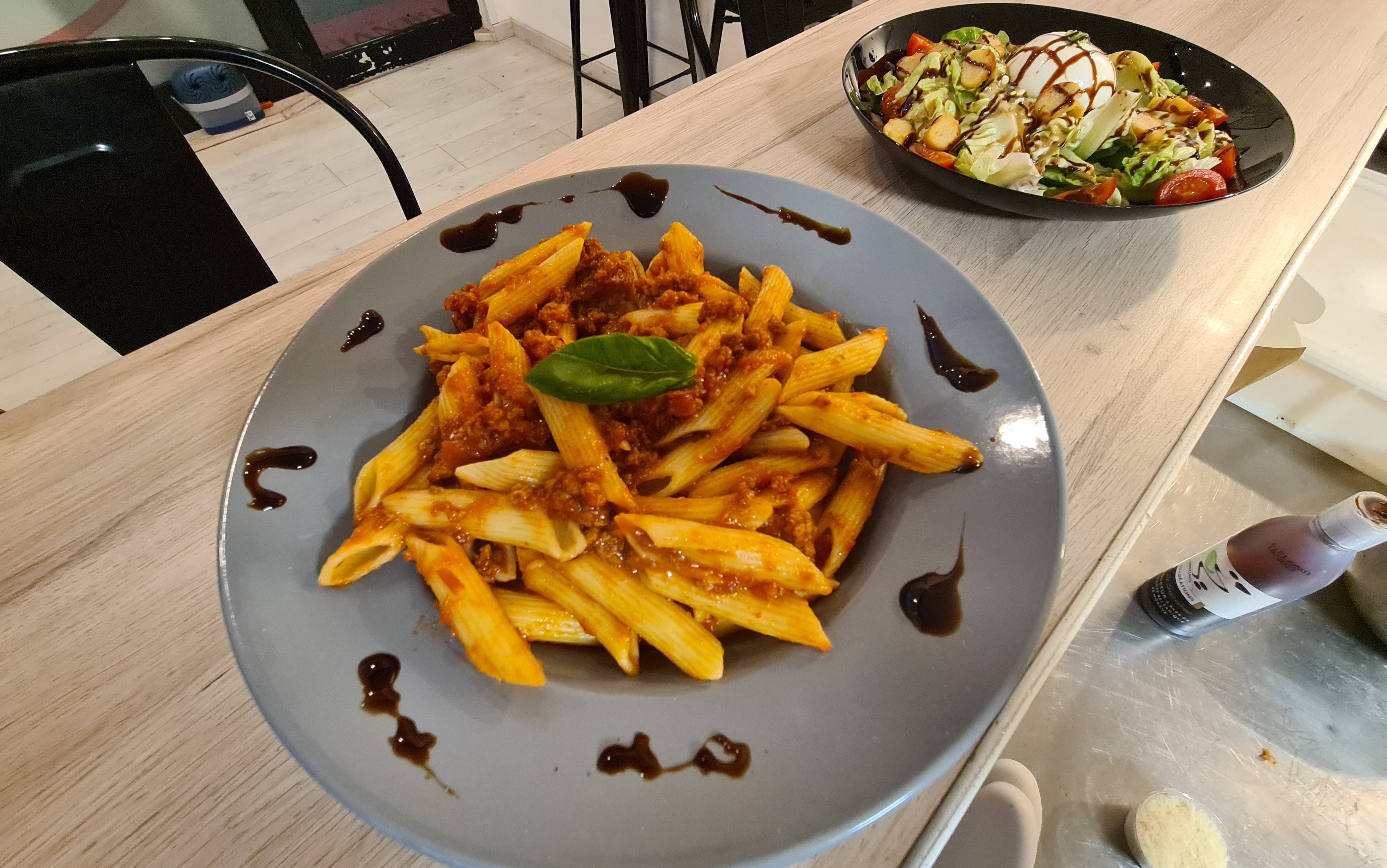 Sans vergogne trop cher. Quelques feuilles vertes, tomates, balsamico pour 12 € : arnaque. Les photos ne représentent pas les repas réellement proposés. Spaghetti Bolognaise sans goût. À emporter uniquement. Mieux vaut aller chercher de la nourriture au supermarché.