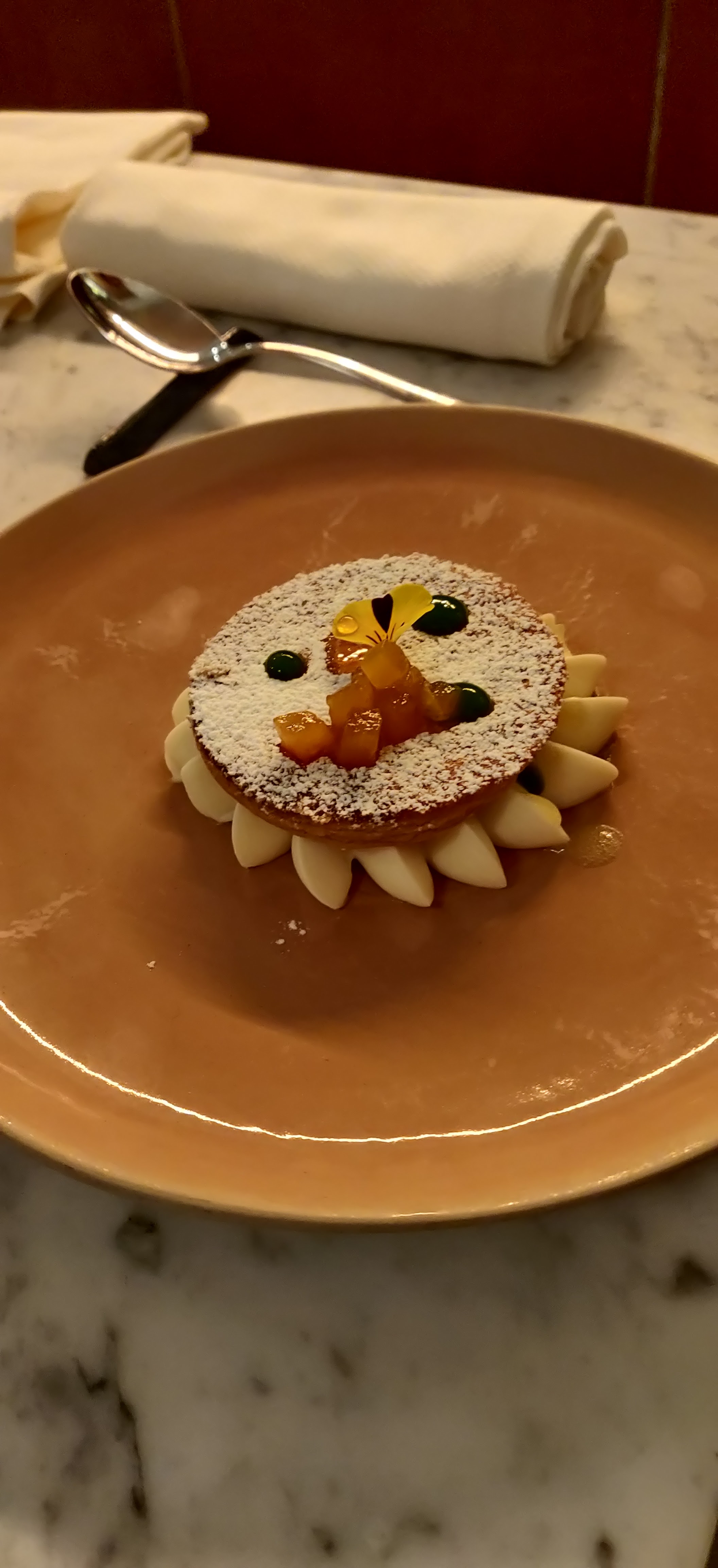 Plats traditionnels avec twist innovant, sublime maitrise des pâtes, des assaisonnements. Rien n’est à enlever ou à rajouter. Caponata très parfumée, maquereau brulé ferme et très frais. Raviolis agneau potiron à pleurer, crème de potiron soyeuse, farce fondante. Immense travail sur les desserts. Tiramisu déstructuré qui peut faire peur au puriste, mais dans lequel on peut retrouver l’essence même des goûts de ce dessert tradi. Création datterino / pesto / chocolat blanc très déroutante mais fraîche, bien équilibrée, avec un beau jeu de texture, force du basilic, crémeux et sucre du chocolat. Je mets 4 et non 5 car nous avions demandé un vin au verre à la carte à 7€, le sommelier nous apporte une bouteille différente pour nous faire goûter, je suppose en accord avec le choix des plats. Sublime découverte, rien à redire. Mais nous avons découvert que le verre était quant à lui à .. 13€, soit casi le double. Et non précisé. Pas super fair mais vaut amplement la note Max outre ça