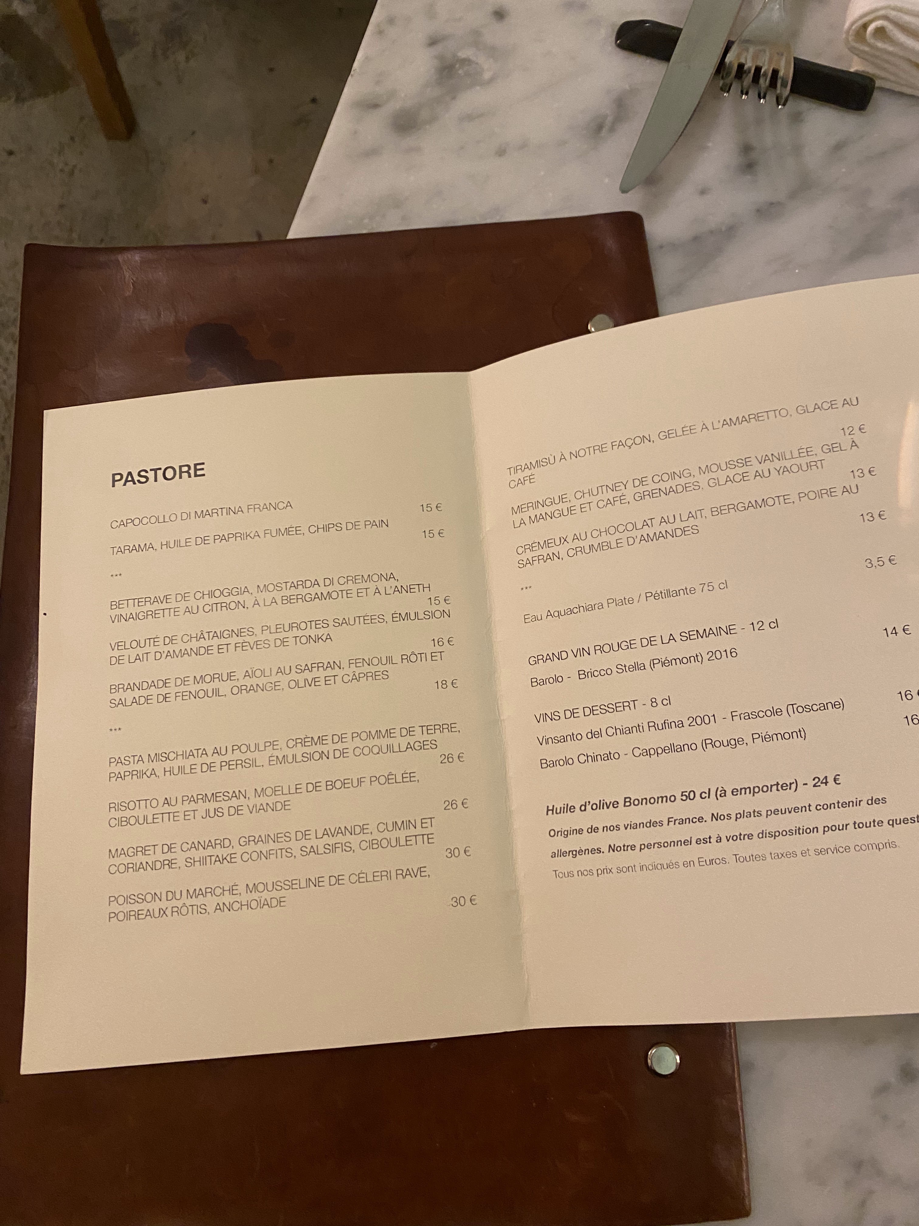 Mes attentes étaient très grandes, avec tout les avis et retours positifs entendus sur Pastore. Le cadre est sympa, avec une serveuse hyper sympathique, jeune et chaleureuse. Pour ce qui est du repas, on y déguste un très bon vin nature, et de délicieuses entrées ( mention speciale pour la vinaigrette des betterave : raffinee avec beaucoup de peps) . Les entrées et desserts sont vraiment tr3s juste en terme d assaisonnement, originale et avec beaucoup de gout. Pour ce qui est des plat : mon poisson et son accompagnement excellent ( avec un super condiment anchois), le canard : cuisson tres maîtrisée, morceaux genereaux ... parcontre nous n'avont pas compris le plat de pates au vongole : fade dans un jus vers pales sans gout , et sans vongole apparentes ... nous n avons pas retrouve de gout iodé ou ail ou persil ... aucune saveurs ... nous avont laissé la moitié du plat Heuresement le tiramisu etait à tomber , et tres peu sucré: parfait J’y reviendrai cependant, sans hésiter ! La carte est raffinée et donne envie d’être entièrement essayée.