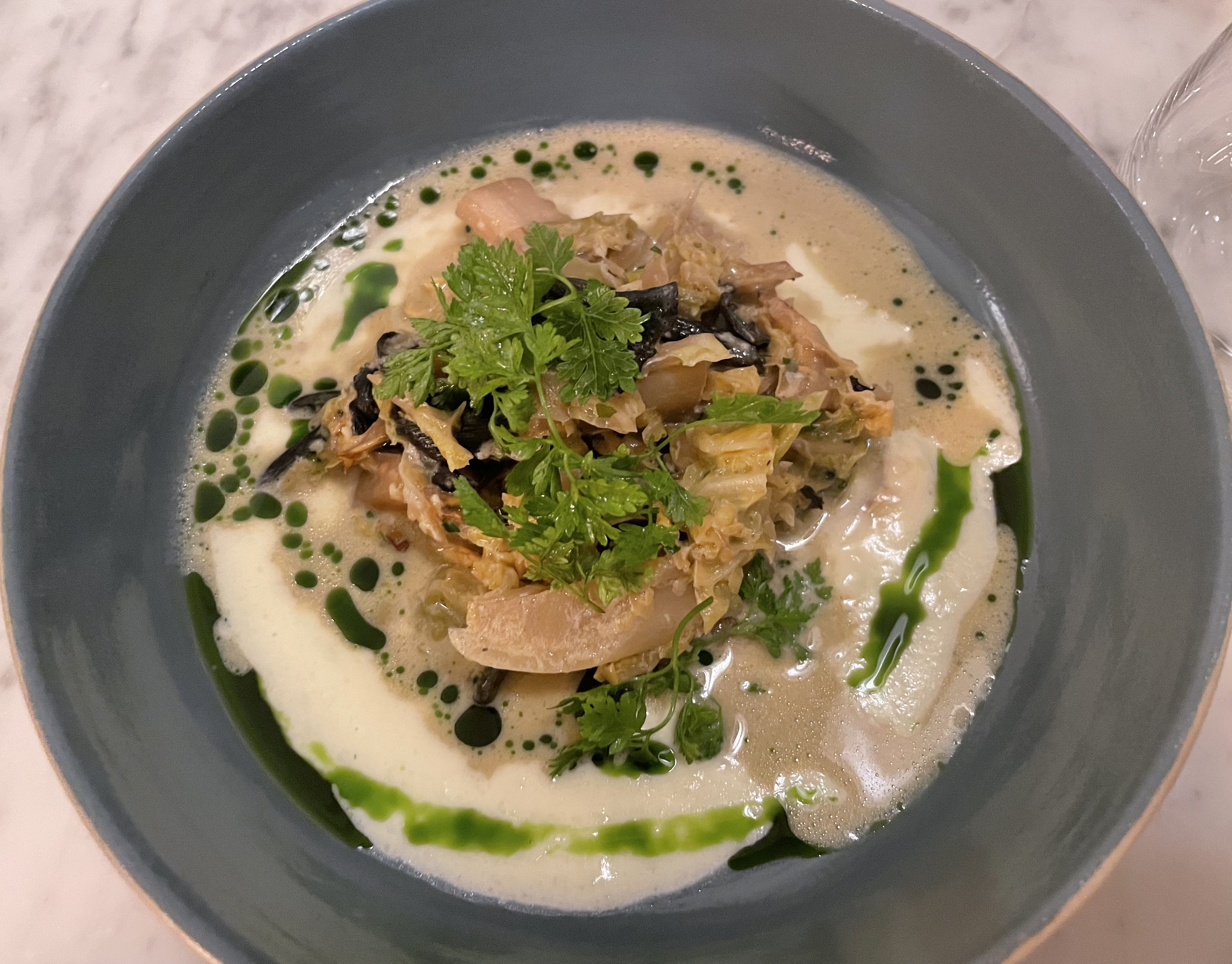 Excellent. Pappa / sériole, puis fregola sarde et cote de porc. Puis rhubarbe. Arrosé d’un barbaresco 2018. Et trempé d’huile d’olive verte.