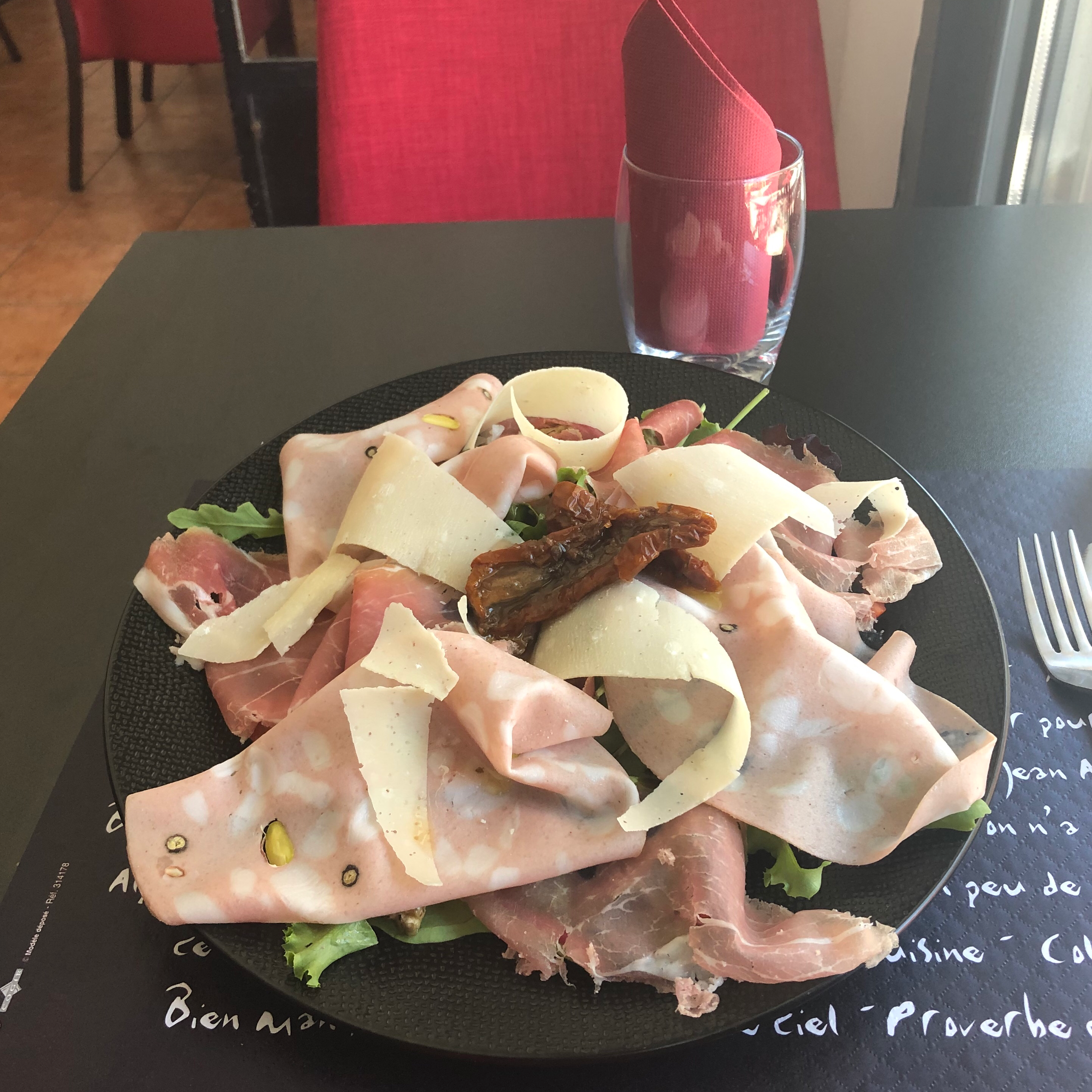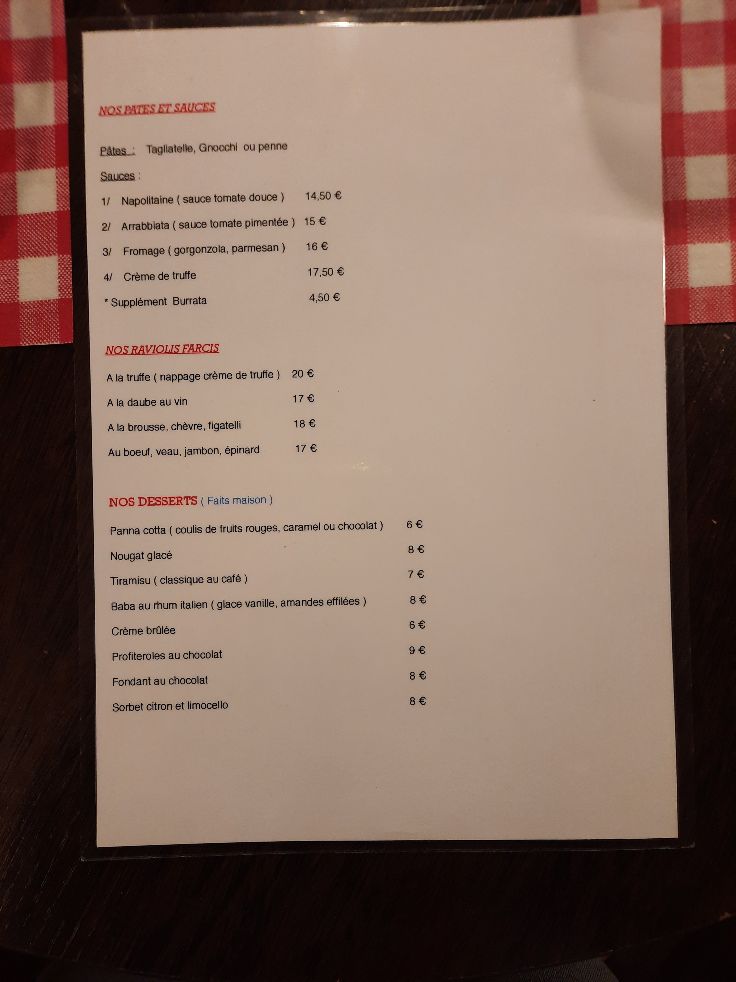 Nous sommes très souvent passés devant ce petit restaurant (20 couverts) en nous disant qu'il fallait qu'on s'y arrête manger un morceau. Quelle déception! Nous avons pris des antipastis (uniquement de la charcuterie avec 3 tomates séchées). Nous avons dû demander du pain à 3 reprises car on nous apportait des mini tranches par 5 (nous étions 6!) Ensuite nous avons commandé chacun une assiette de pâtes. Elles étaient assez bonnes mais la quantité est peut être à revoir... ainsi que le prix! 14,50€ pour une assiette de pâtes c'est très cher! Enfin nous avons pris des desserts, tiramisu (6,5€ une petite part) et un baba au rhum. Le baba au rhum : une boule de glace vanille et de tout petits morceaux de biscuit coupés autour... Je n'en dirais pas plus, les mots me manquent 🤣 Le service a été assez long sur la fin du repas, nous avons terminé nos desserts alors qu'un de nos collègues n'avait même pas été encore servi. Nous sommes répartis déçus, surtout à la vue des commentaires positifs que nous avions pu constater sur Google. Nous attribuons malgré tout 2 étoiles pour les pâtes mais surtout pour la serveuse qui était très agréable et souriante!