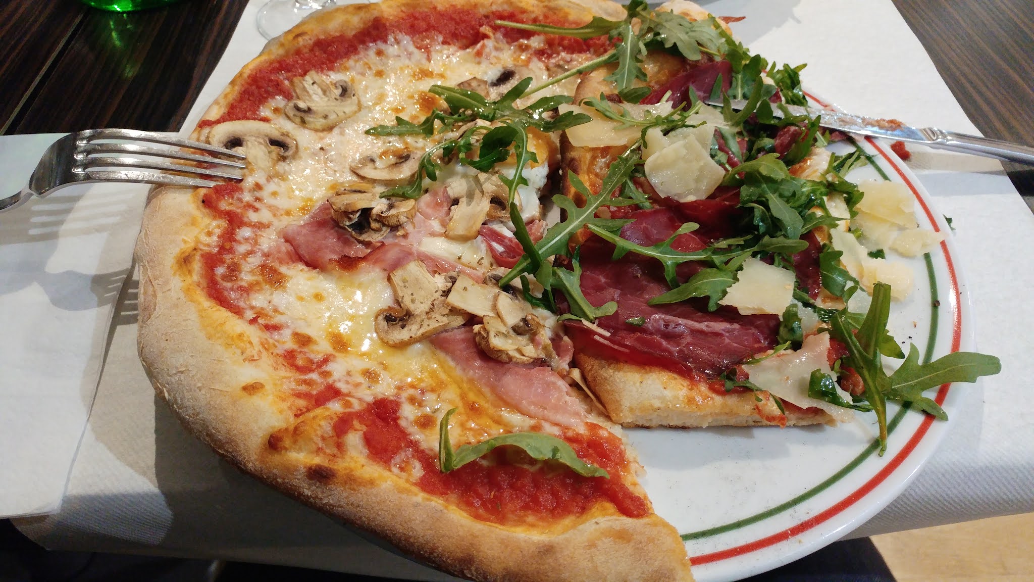 Nous y sommes allés la semaine dernière avec ma petite amie et nous avons vraiment aimé la nourriture même si nous ne nous attendions pas à grand-chose de l'extérieur. Commandé à la fois une pizza qui était tout simplement très agréable, presque aussi bonne que l'italienne. Les prix étaient plus que corrects et le service était vraiment agréable et assez rapide. Dommage que le dessert n'était pas trop savoureux. Nous avons tous les deux opté pour la pannacotta et il n'y avait pas beaucoup de saveur.