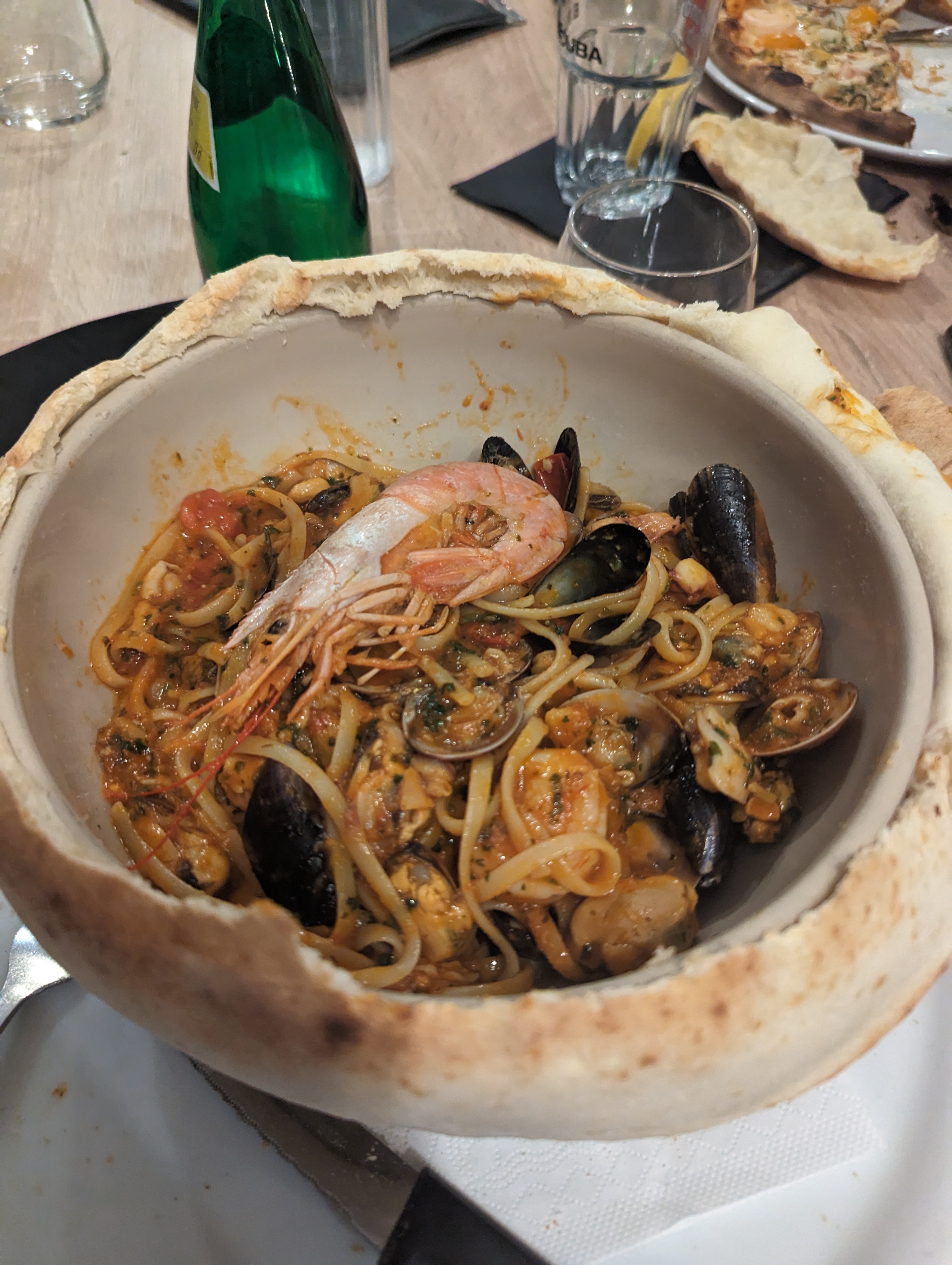 La première impression fut négative : nappe sale, beaucoup d'attente pour avoir la carte puis pour obtenir les plats adultes (40 min, heureusement rapide pour les enfants), mais ensuite cela fut mieux : cocktail maison excellent, service souriant, et leur spécialité de linguine aux fruits de mer cuitent a l'étouffe sous un chapeau de pâte à pizza furent bonnes et copieuses. Les gambas flambées étaient bonnes sans plus. Les desserts étaient bons et les prix très corrects. Bref, un restaurant familial correspondant à notre besoin pour un déjeuner dominical en famille, avec de bonnes et moins bonnes surprises mais avec un bon rapport qualité prix et un service mal organisé (jamais le même serveur, plusieurs fois les mêmes questions) mais cordial.
