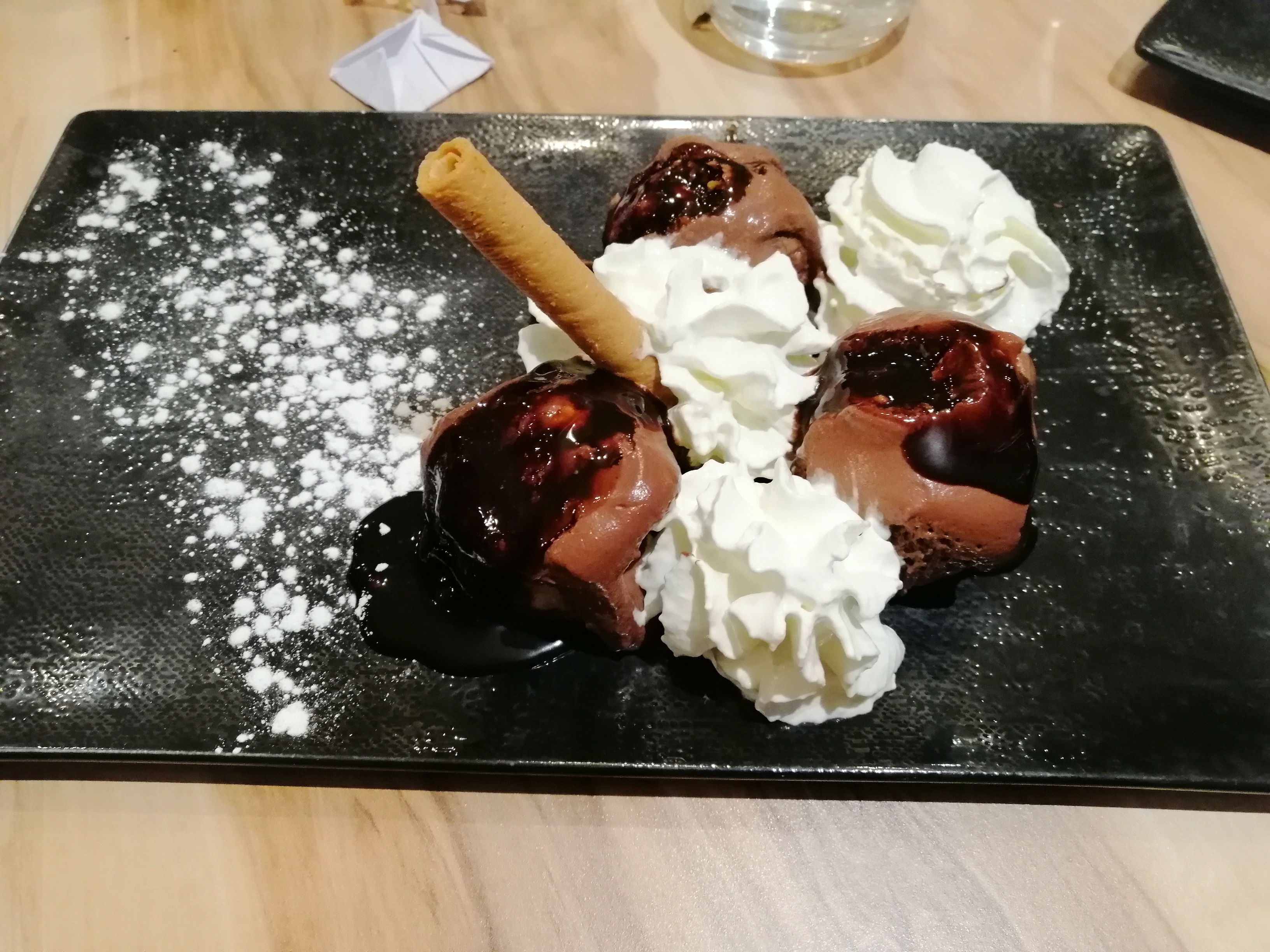 Restaurant sympathique situé sur Amancy, très bien accueillis, personnel disponible pour toute demande tout au long du repas. Je vous conseille de venir vers 20h pour un samedi soir, les plats sont arrivés assez vite malgré une salle pas mal remplie ! Pour ce qui est nourriture, de belles et bonnes pizza faites sur place et cuites au feux de bois ! Pour le dessert j’ai opter pour les profiteroles, je doit dire que les petites « billes » de couleurs pour faire déco sont plus dérangeante qu’autre chose.