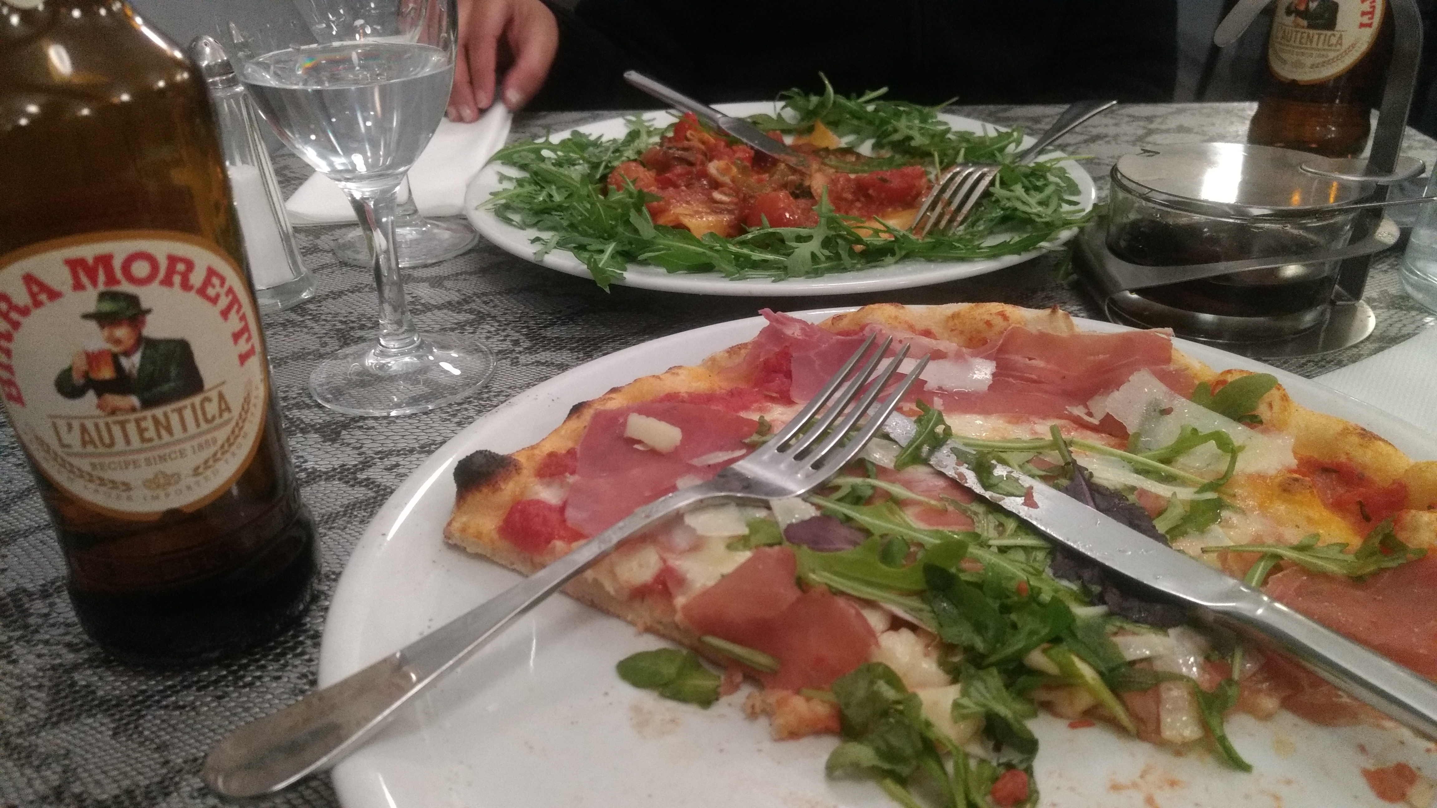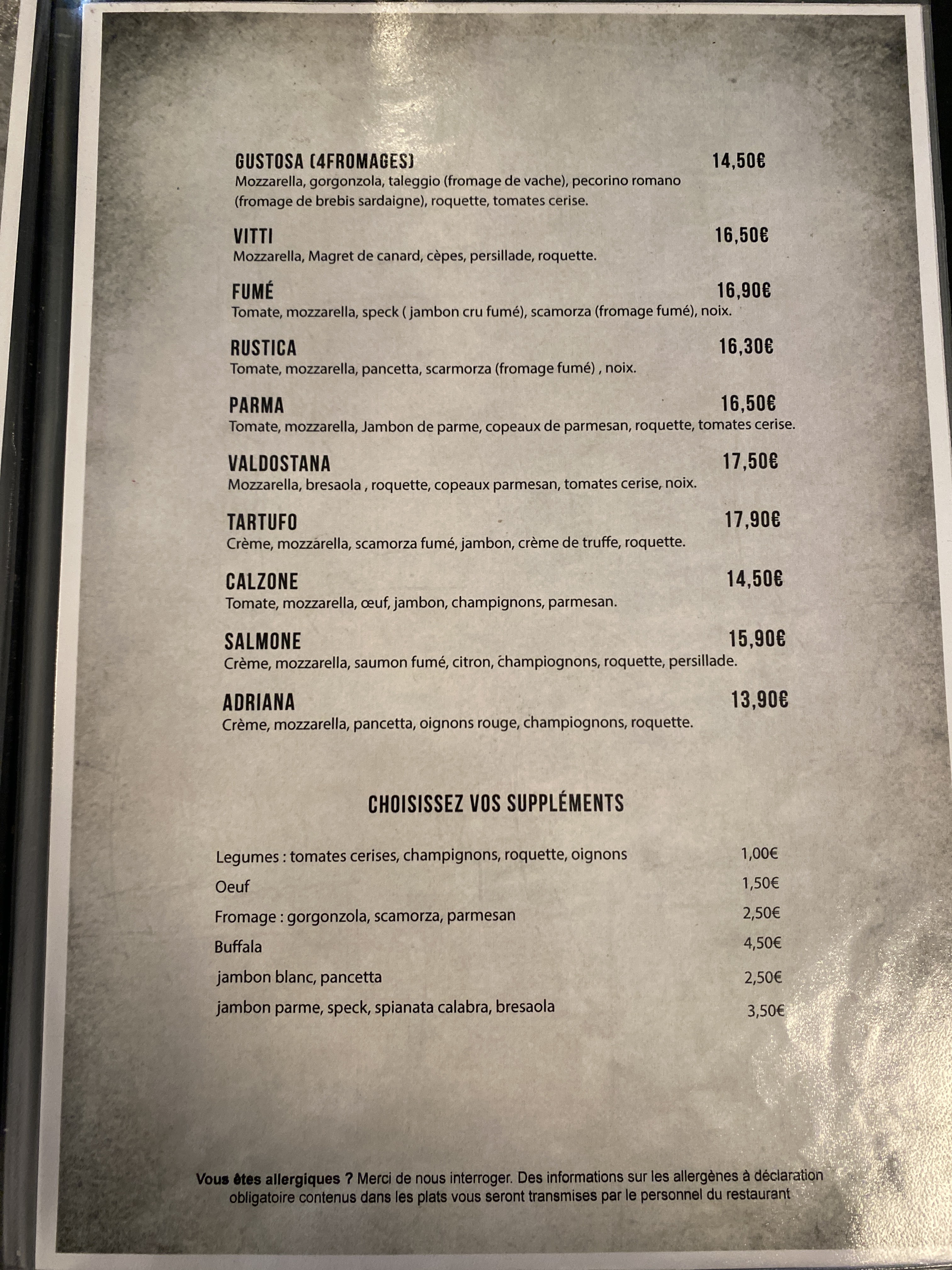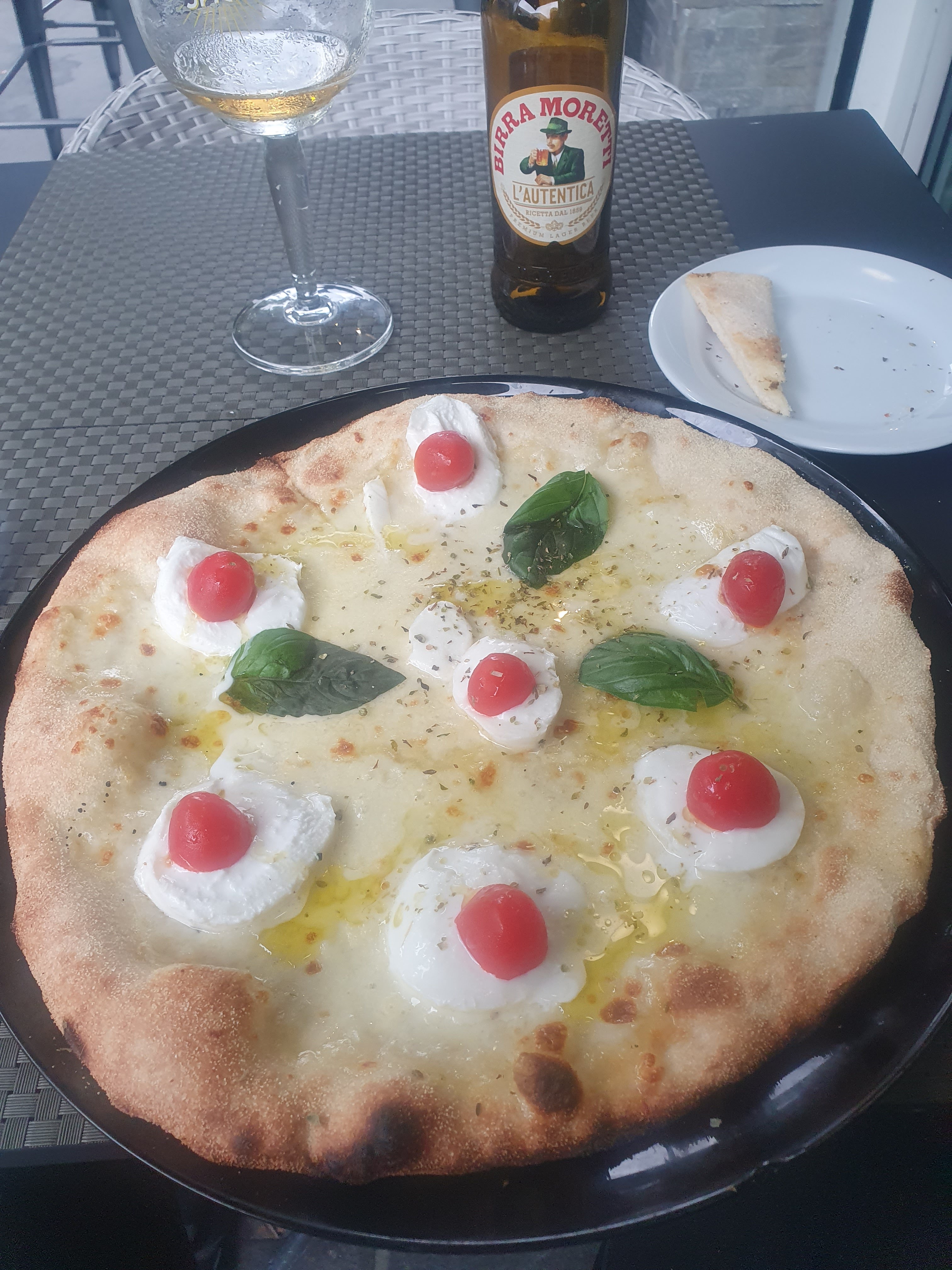 Une pizza 4 saisons généreuse avec de bons ingrédients accompagnée d'une bière blonde italienne fraîche. Et pour finir un tiramisu maison. Le tout pour 24€, je recommande.