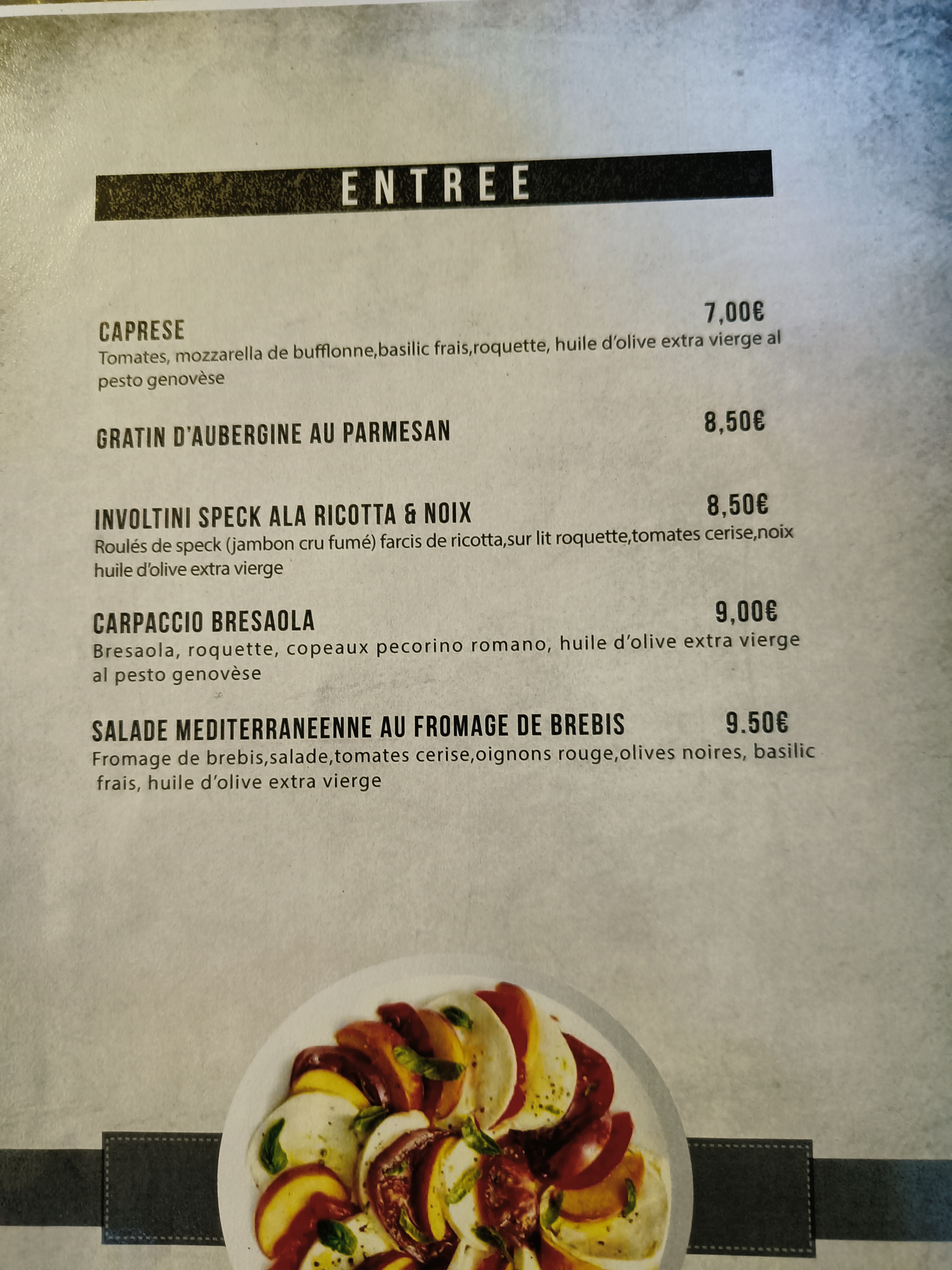 J'ai commandé des spaghetti, j'ai eu des tagliatelles. On fait toujours comme ça. m'a dit le serveur. Le carpaccio di coppa, c'est 4 tranches de coppa, avec de la salade fade et des courgettes trop cuites. Trop cher pour un assemblage qui ne nécessite aucune préparation. Et nous avons été un peu oubliés en terrasse.