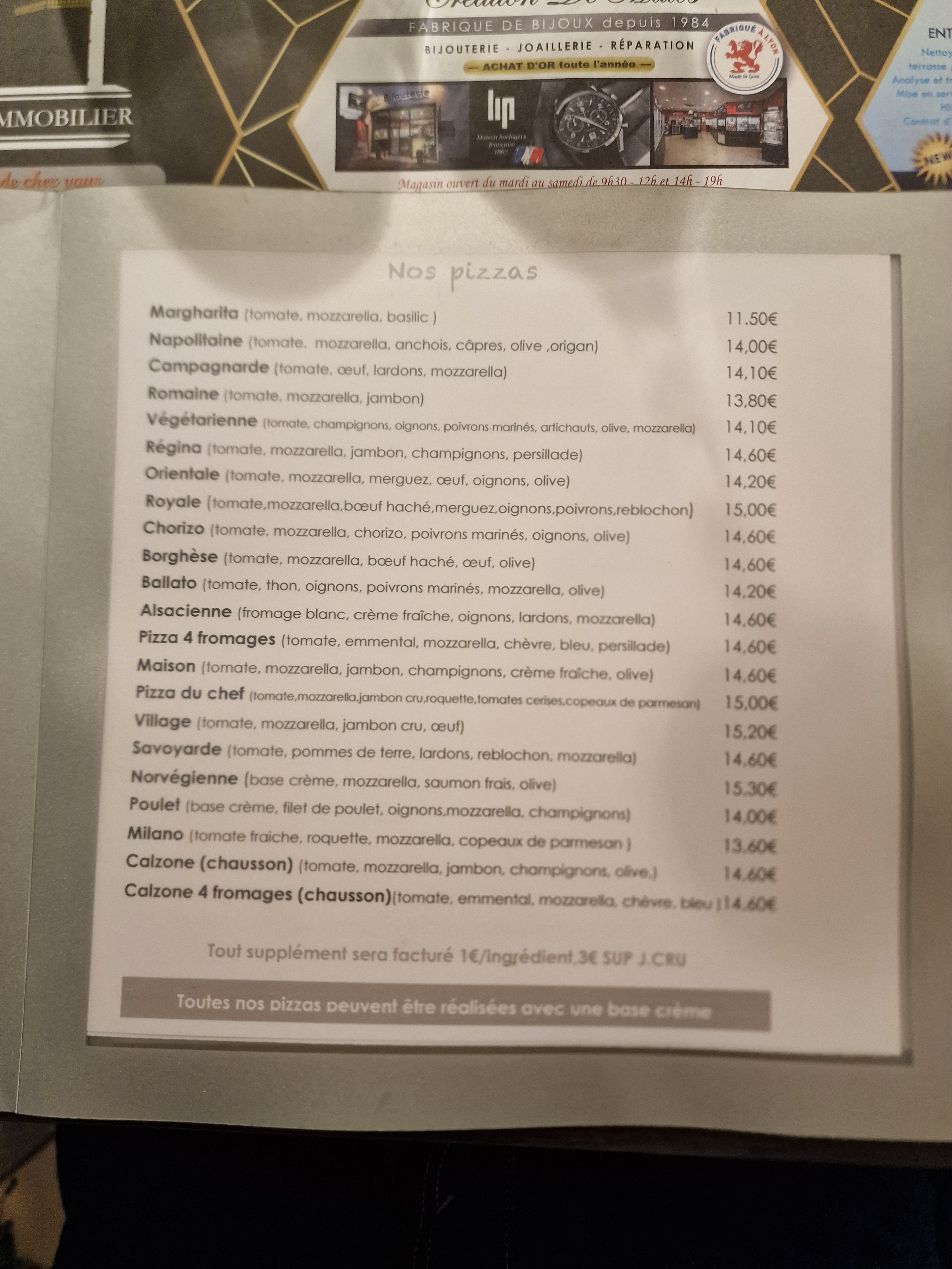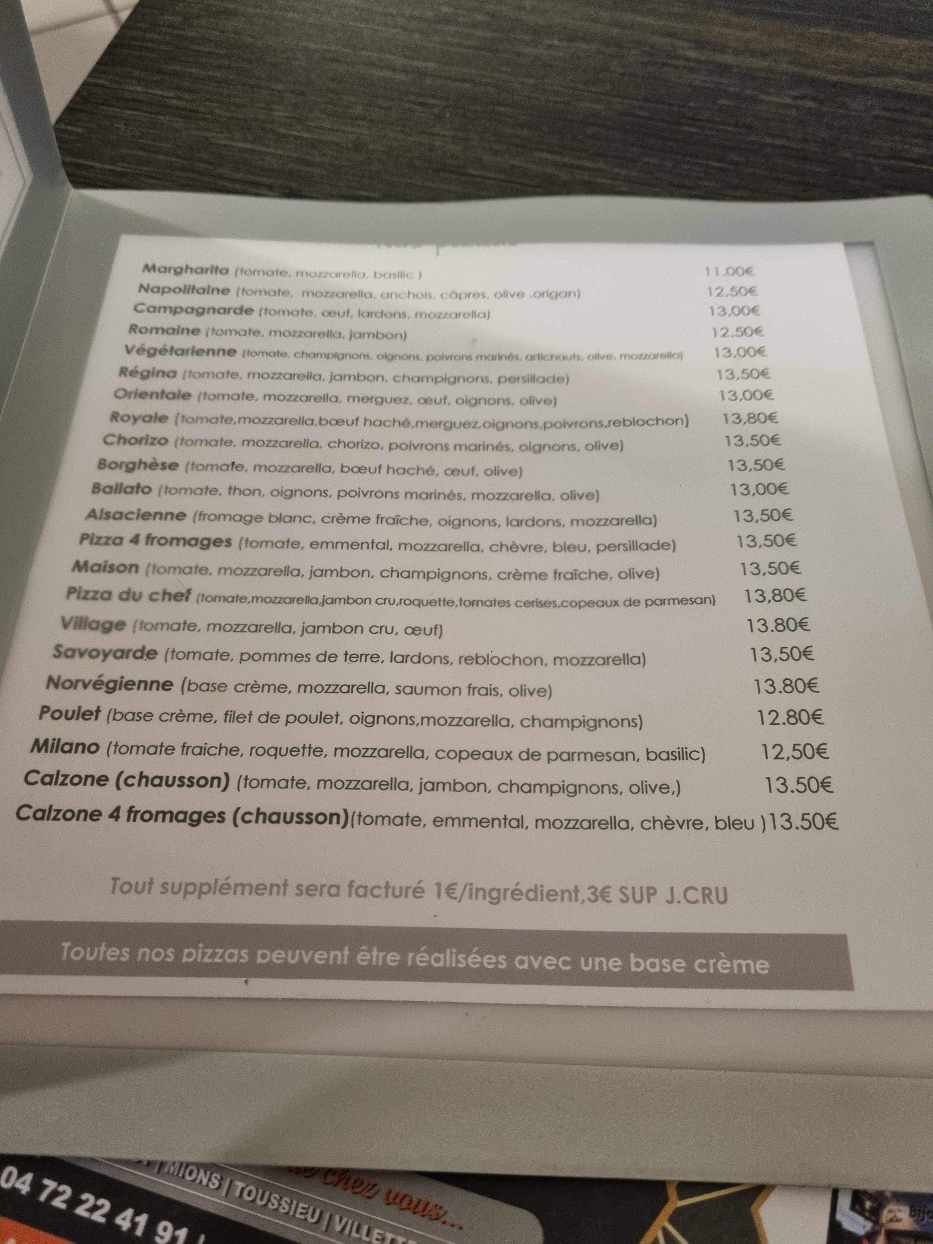 3 pizzas mauvaises végétarienne savoyarde et 1 au saumon, produits congelés voir en boite. 1er test pour nous au village. On n'y retourera pas car en plus le service n'est pas sympa !