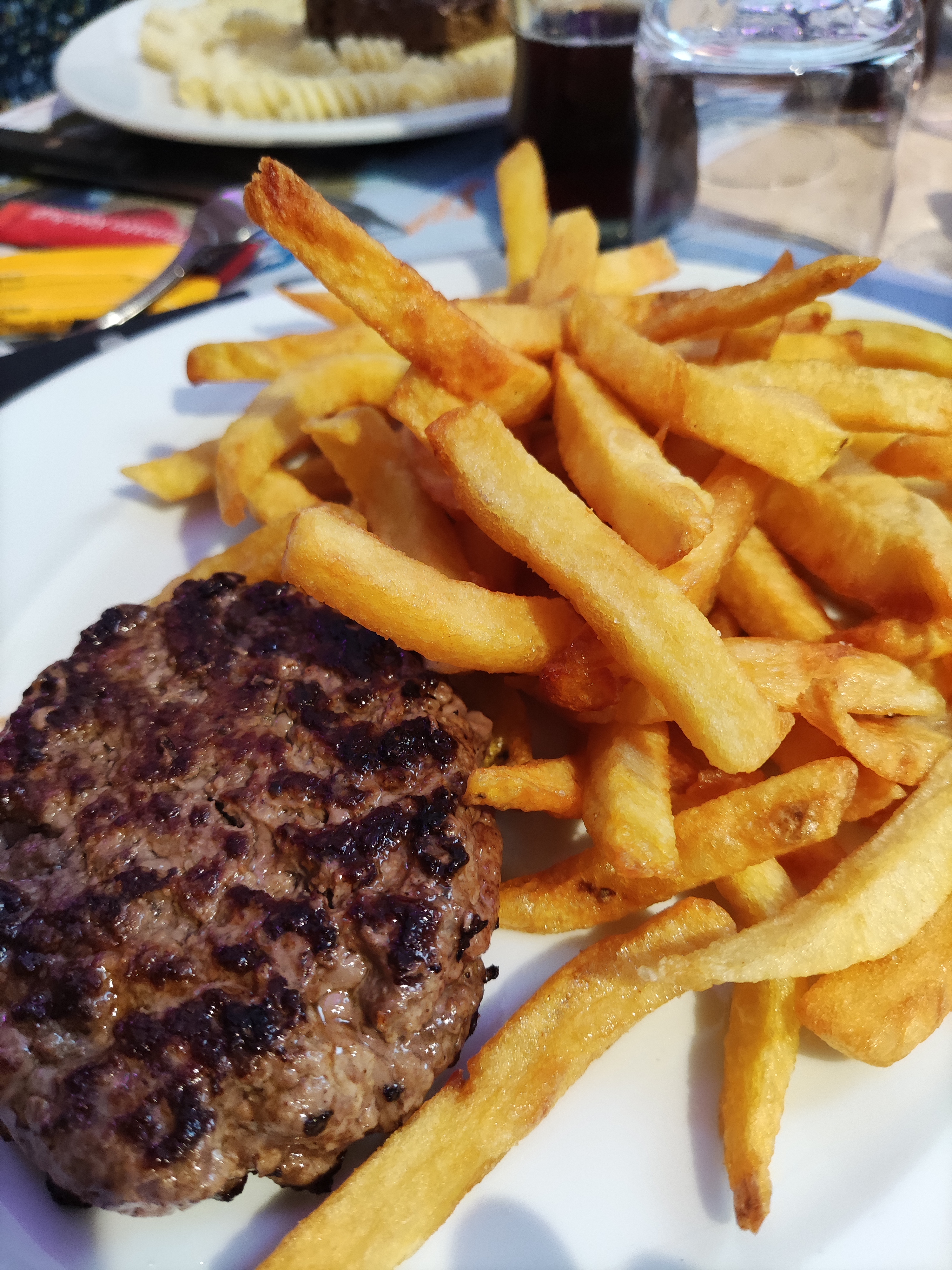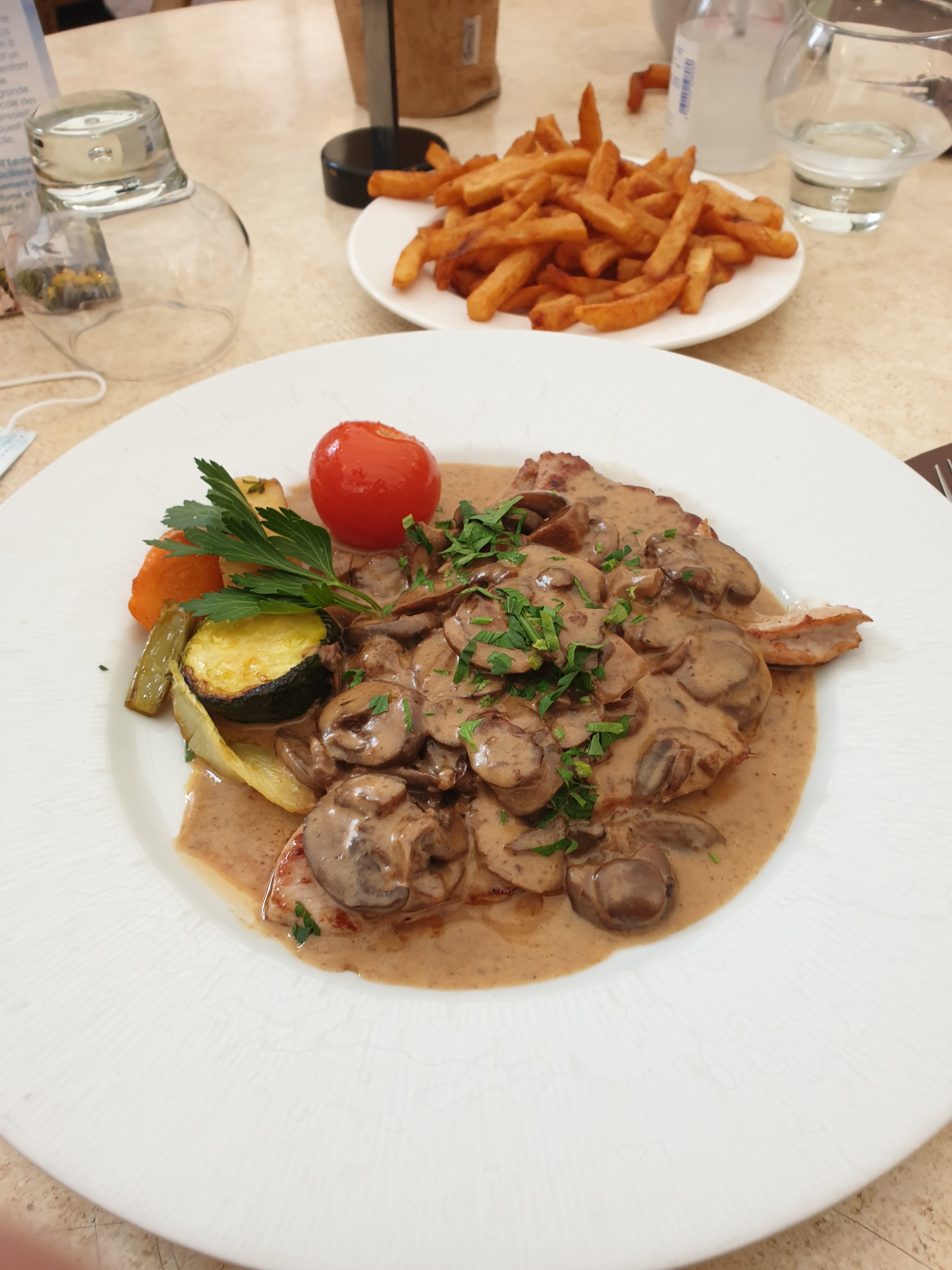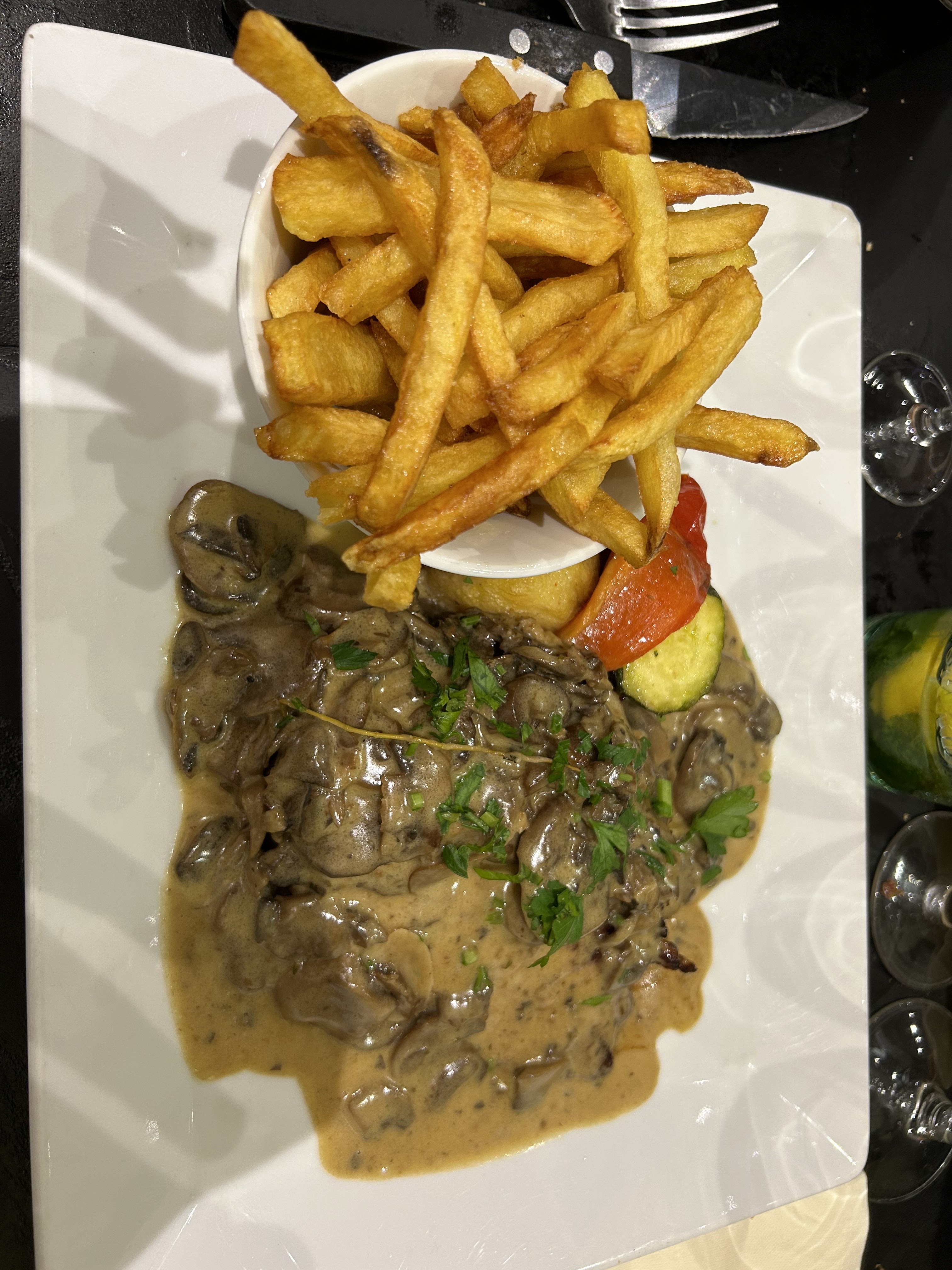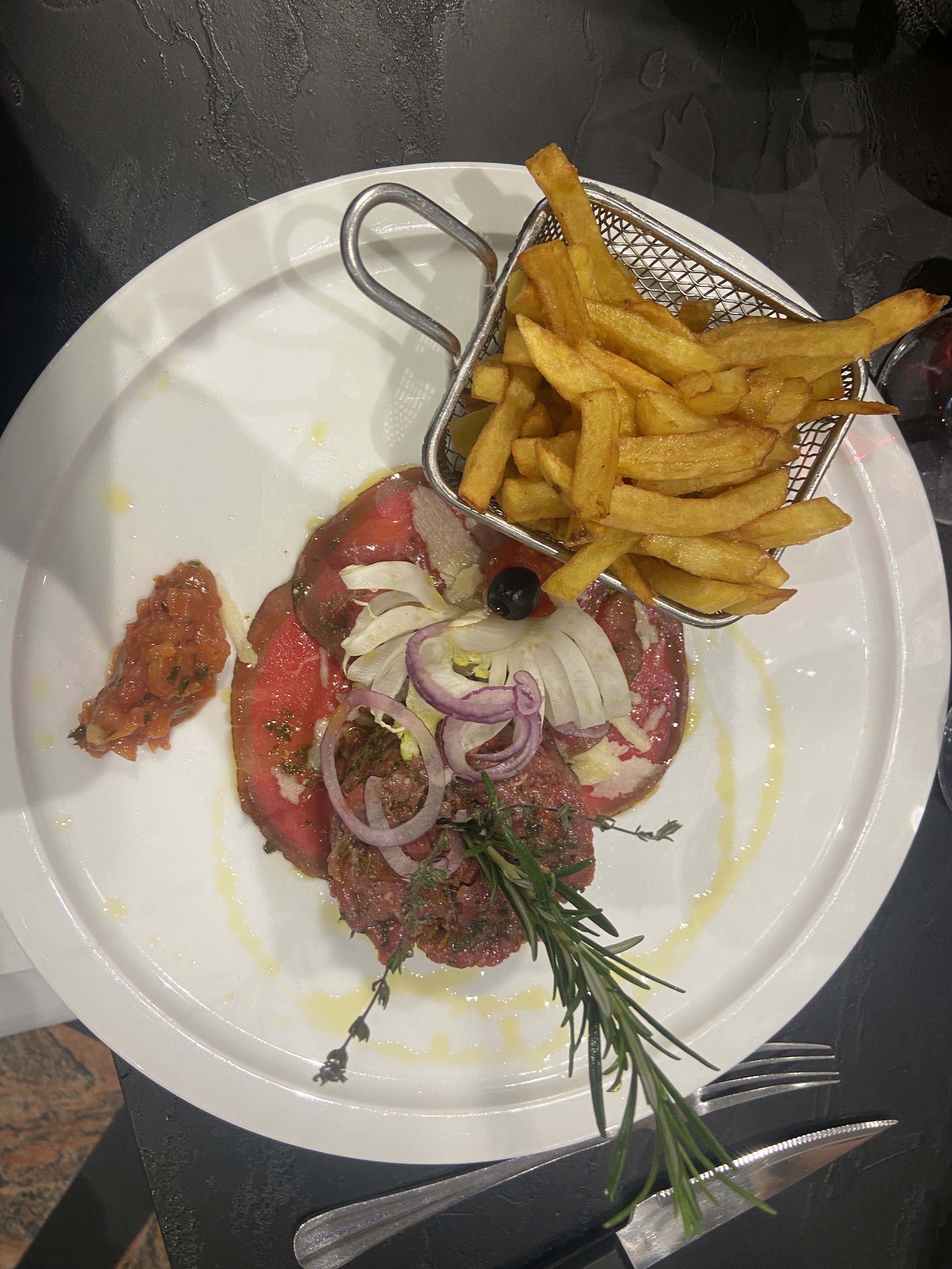 Cuisine bonne. J'ai commandé un Filet de bœuf avec des frites. La cuisson était comme demandée, la viande était très bonne mais en ce qui concerne les frites ! J'ai reçu les frites (un peu) à part, sur une assiette de dessert en vrac. Et quand on demande encore des frites on vous les ramène dans un panier bien présenté mais ils vous les facturent ! Et les serveurs sont d'une gentillesse (ironique). Franchement dommage car la cuisine est vraiment bonne.
