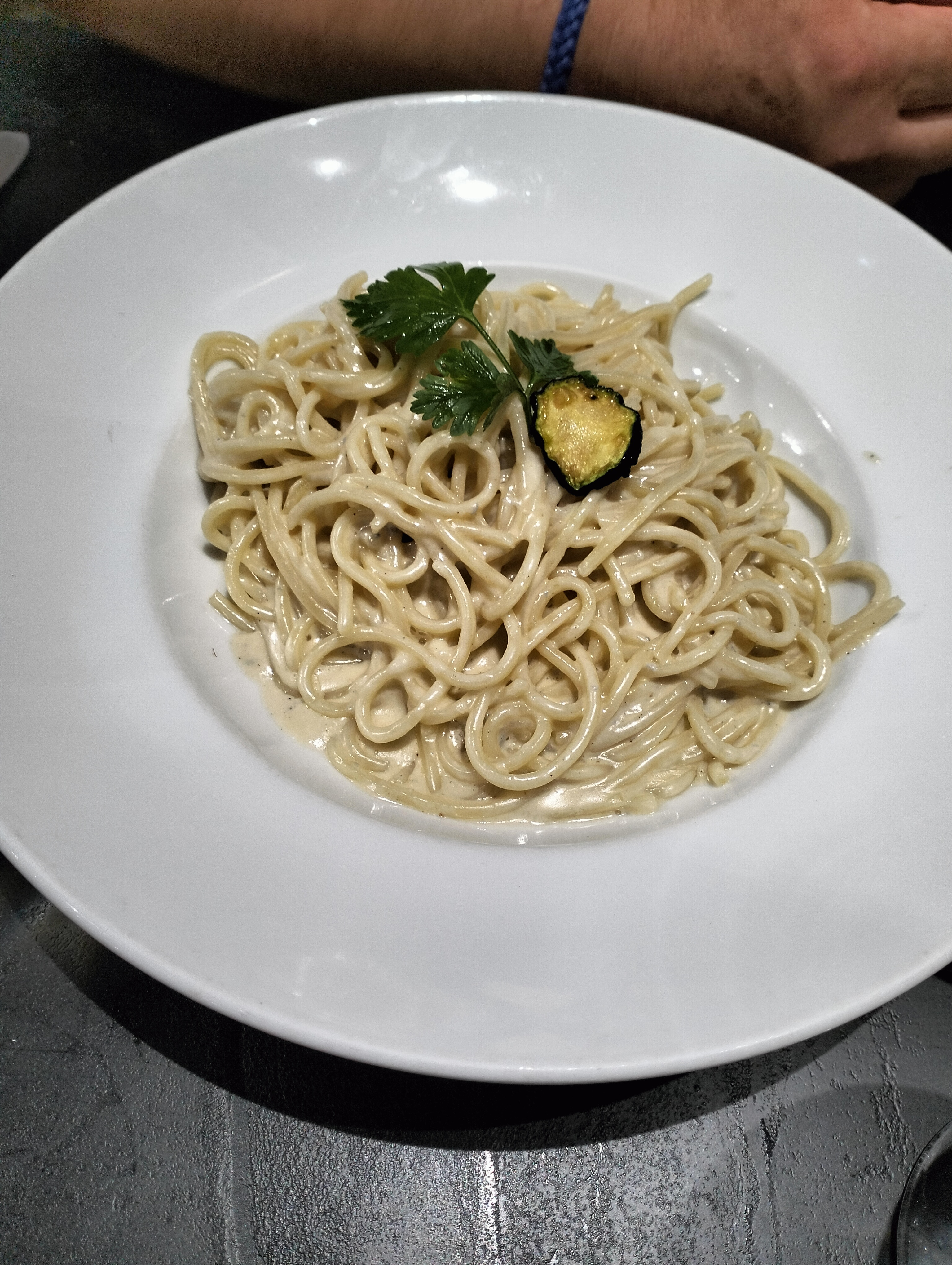 Nous sommes venu suite à une recommandation. La nourriture était bonne. Malheureusement une dizaine de moucherons gravitaient autour de la table et même dans la pizza et les pâtes. Après avoir informé le patron (je suppose) il nous dit que c’était dû au parmesan ( ??? ) Ça a complètement gâché le repas et ça nous a dégoûté. A deux doigts de manger un moucheron. Nous avons eu une pizza offerte en compensation. C’est sympa mais ça ne change pas le fait que nous ne reviendrons plus. Dégoûté 🙁. Concernant le service étonnant d’envoyer un plat sur trois et patienter un petit moment pour les deux autres. Dommage car les pizzas donnent envie. En photo sur la première au milieu on peut apercevoir un moucheron.