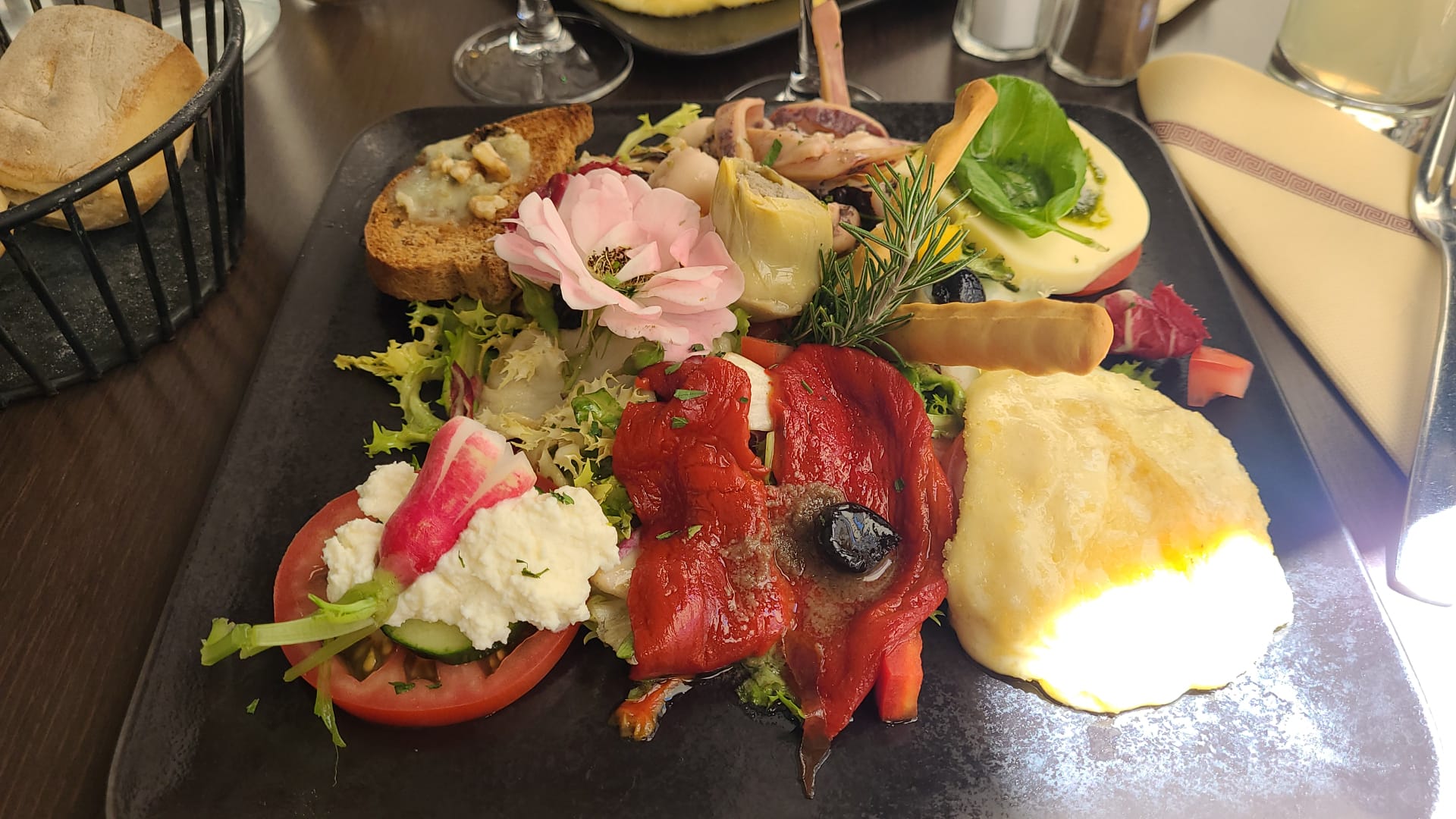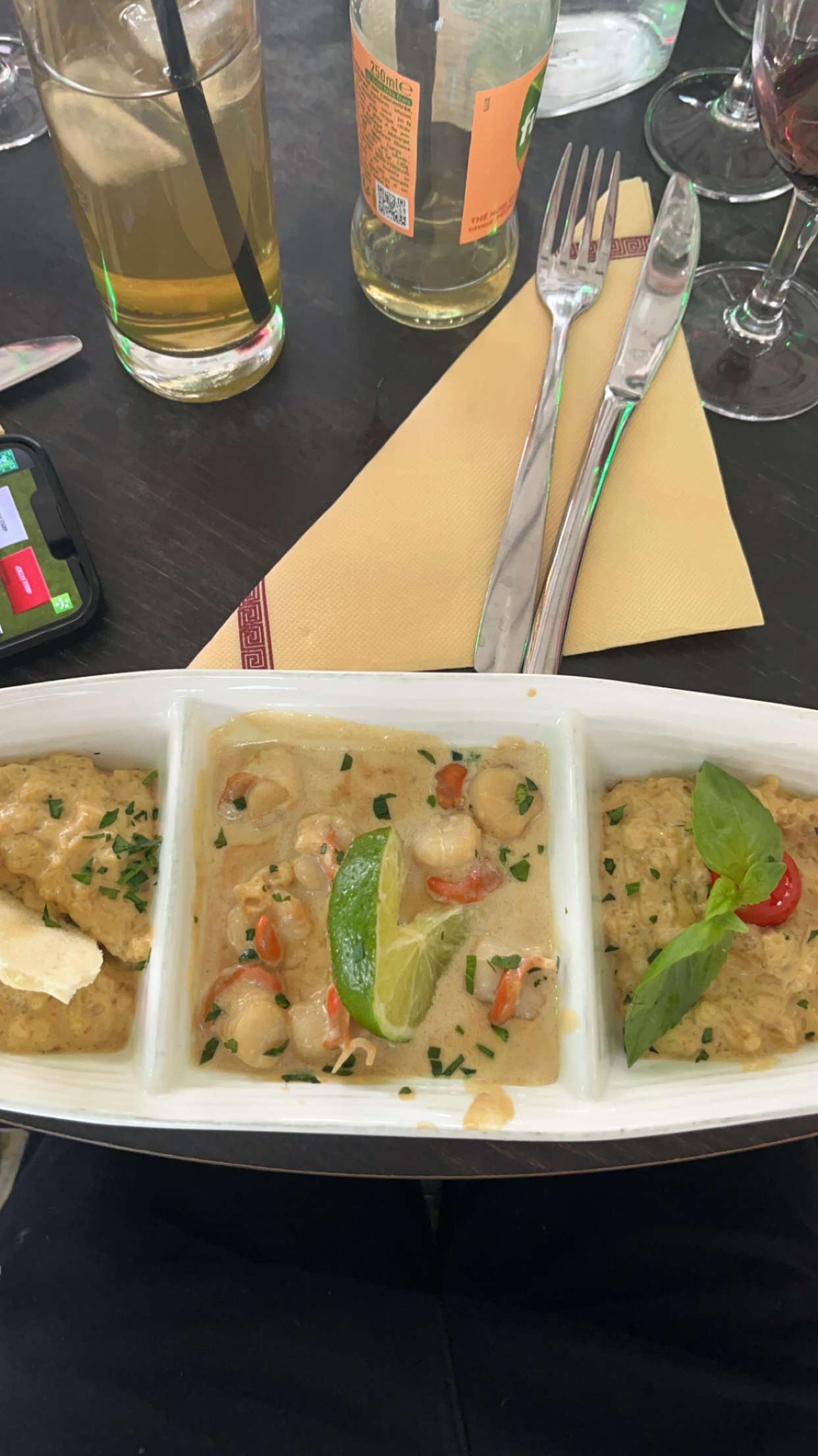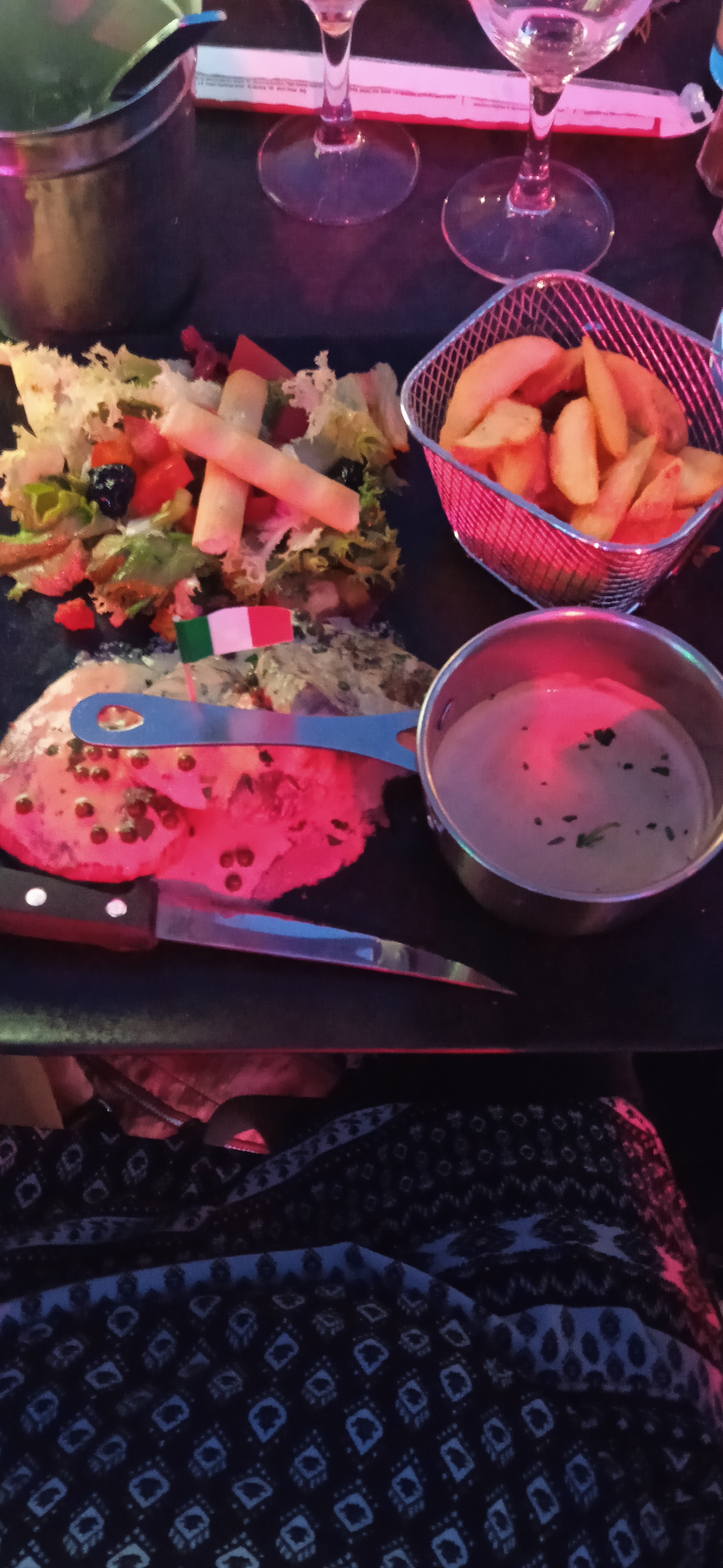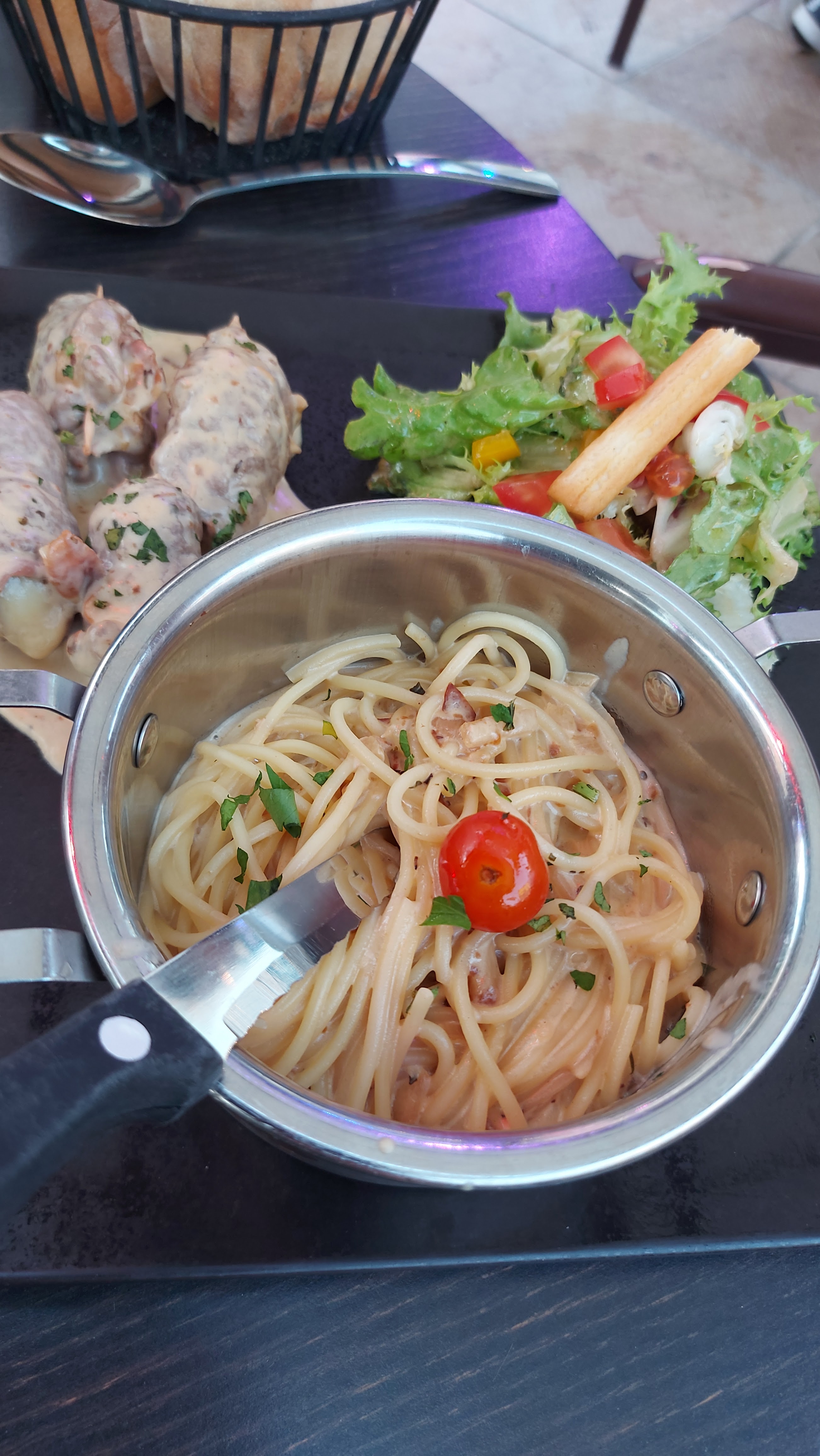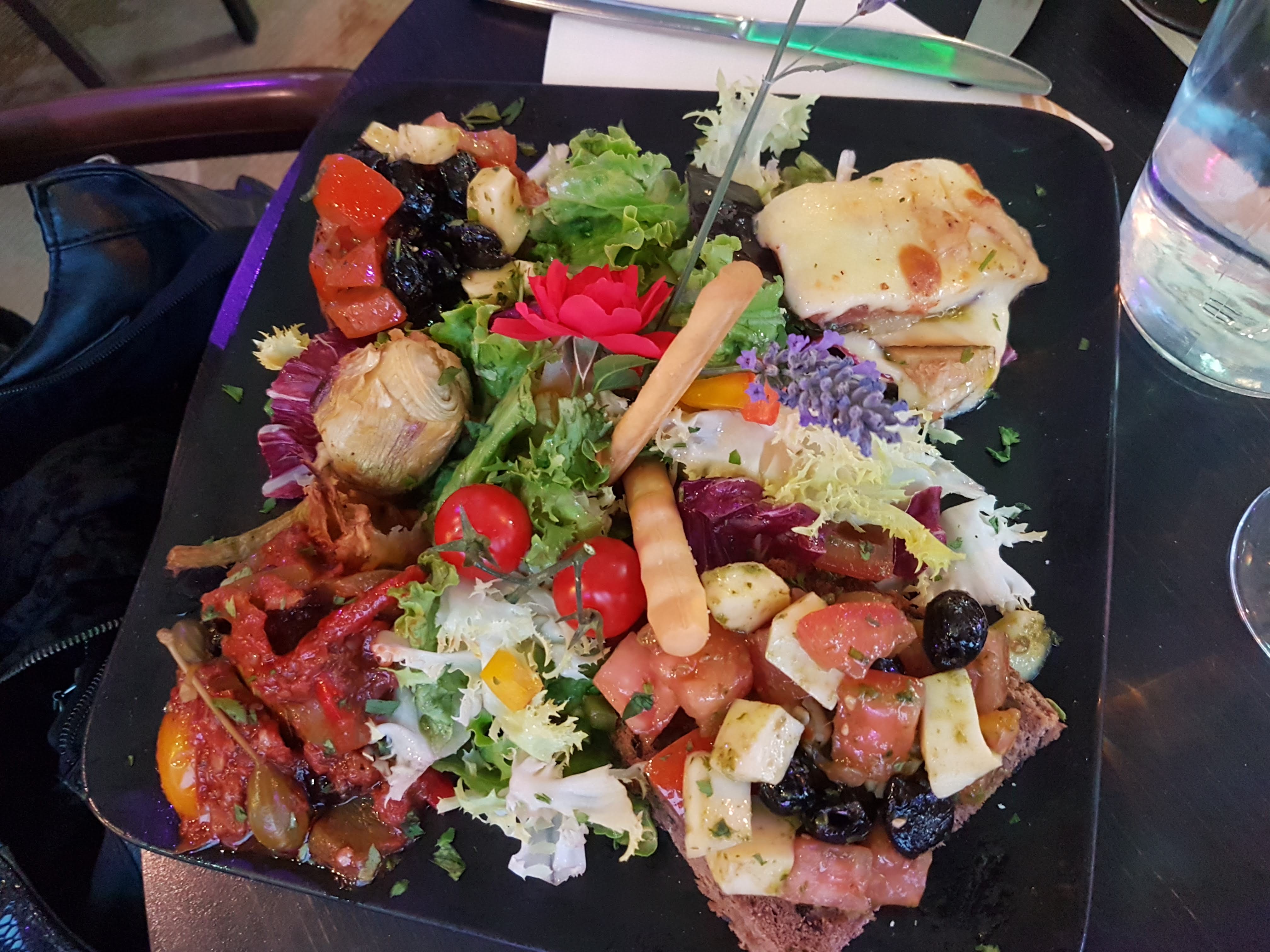 Plats vraiment copieux ( pour une fois qu'il n'y a pas que des feuilles de salade dans une salade) et le lieu était joliment décoré. Les plats étaient bons et le vin était un vin très moelleux. Le seul hic était l'éclairage, on ne voyait pas trop ce qu'on mangeait.