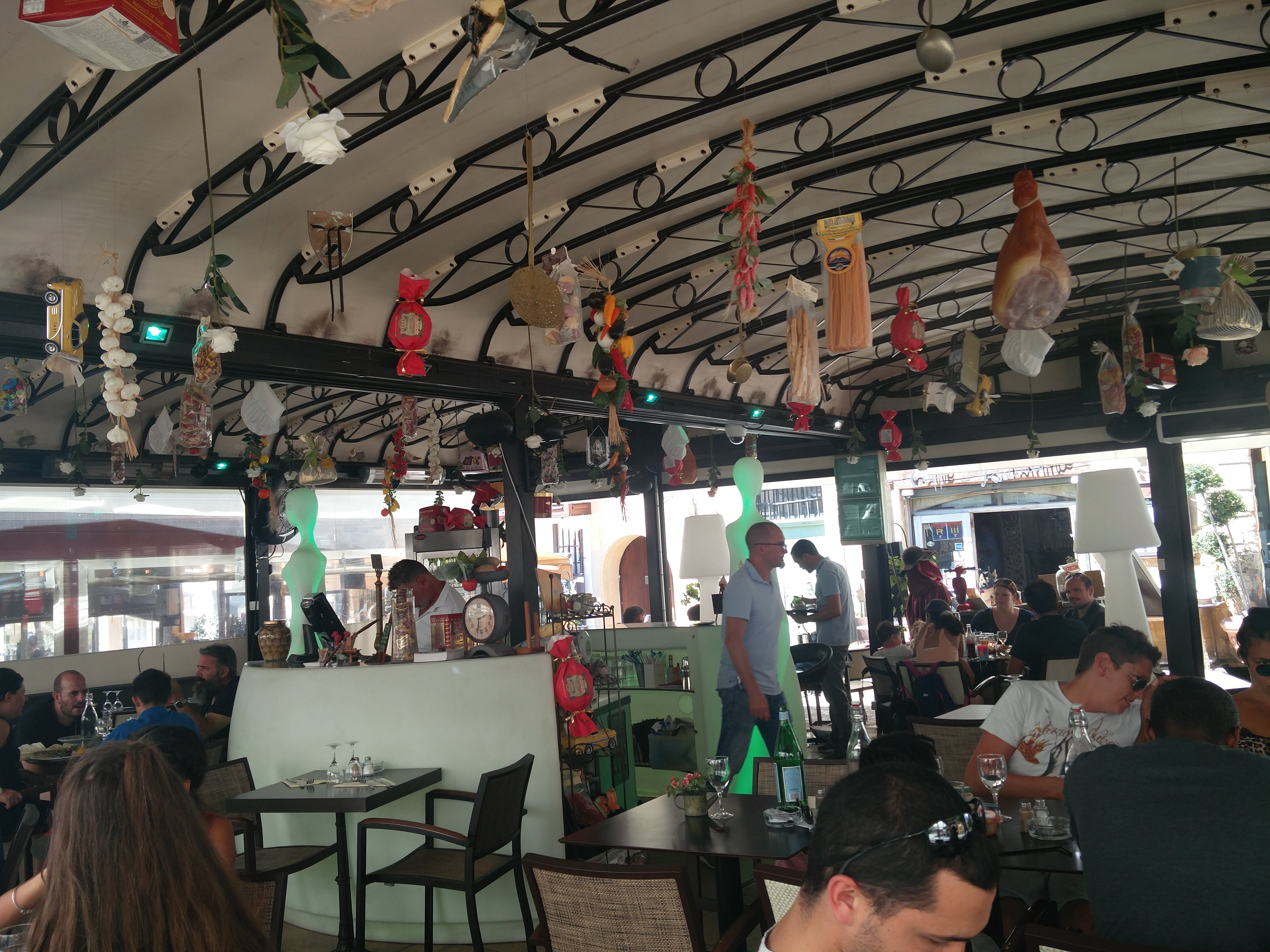 Nous cherchions un endroit sympa pour manger. L’accueil ne fut pas incroyable non plus mais ce n’est pas grave. Le pire était la nourriture. On s’assoie et déjà comment la table était présentée on aurait dit qu’on était à la cantine avec serviette rouge pas belle et grosse cuillère avec gressins encore dans leurs emballages. Le prix reste raisonnable pour Aix en Provence mais je préfère payé un peu plus cher à la rotonde que ici. La décoration est à revoir des paquets gâteau et chose qui tombe du plafond sans thèmes et oppressent. La nourriture était vraiment infâme je ne suis pas difficile et mon mari encore moins mais c’était vraiment pas bon et froid. Et enfin le vin il était pas très bon. Restaurant avec de nombreux plats italiens aucun rappel de cela au sein du restaurant. L’eau est de l’eau des toilettes, viande froide, pain mal cuit et j’en passe. La nourriture y est très médiocre et de mauvais qualité. Les petits pains qu’ils servent en guise amuse bouche sont froid et déjà préparé à l’avance.