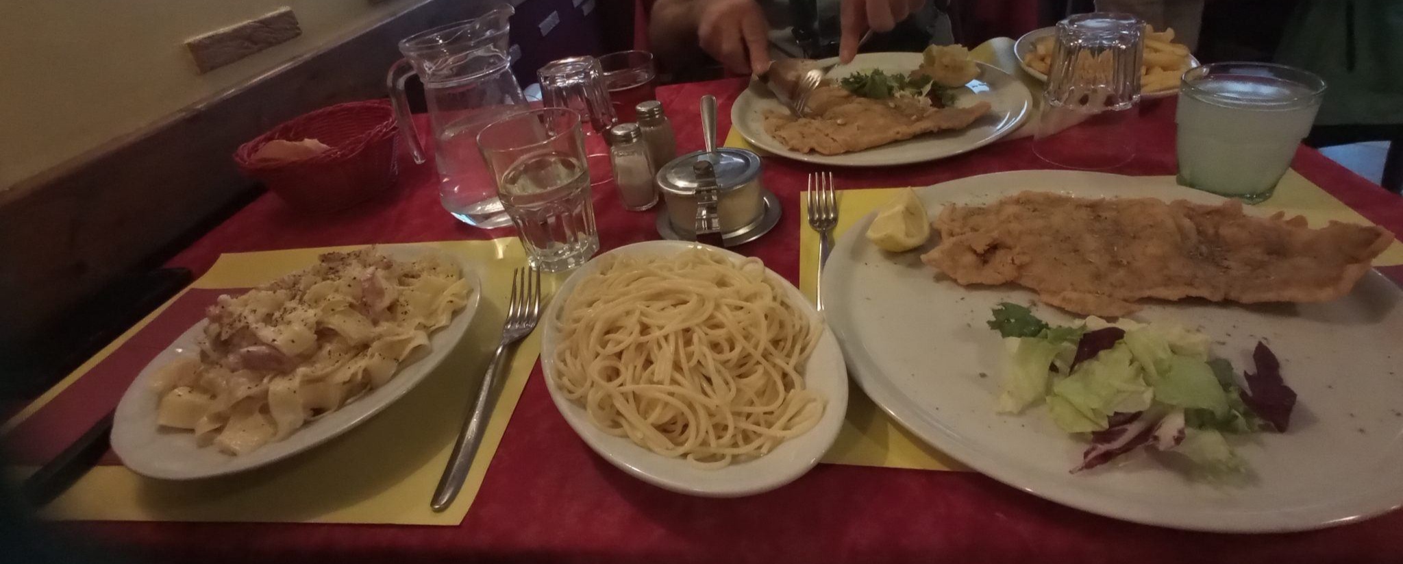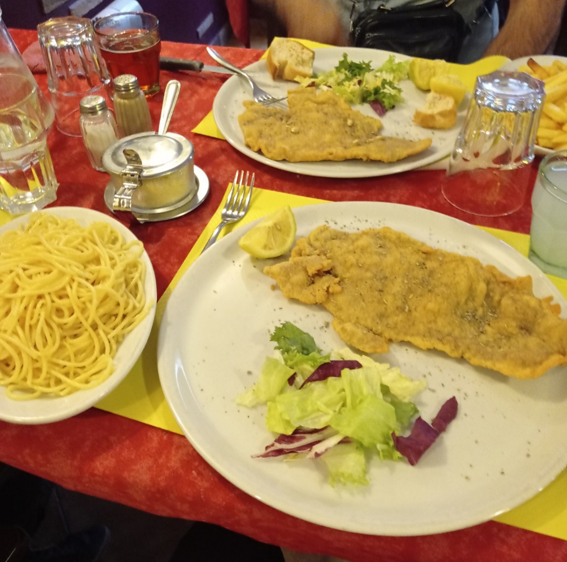 Parts copieuses. Pâtes cuites al dente à la perfection et escalope milanaise ultra fine. Pas cher pour les quantités servies avec le sourire par le personnel aimable. Excellent rapport qualité -prix.