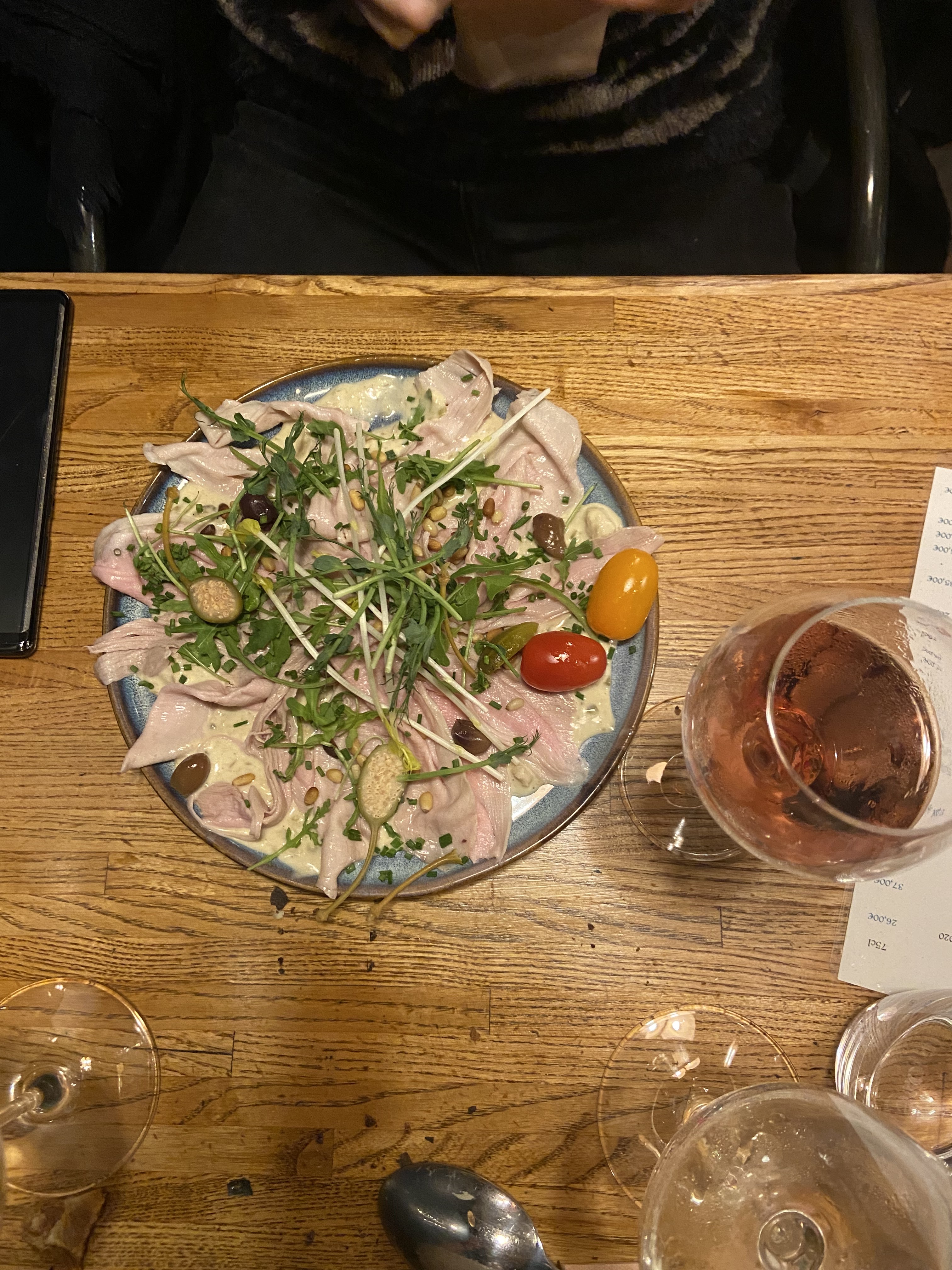 Un carpaccio sans assaisonnement, impossible pour moi. Heureusement il y avait une coupelle d'huile d'olive sur la table. Des vins,j'en ai testé deux, très fades. Ambiance impersonnelle,etc,etc Bof,bof