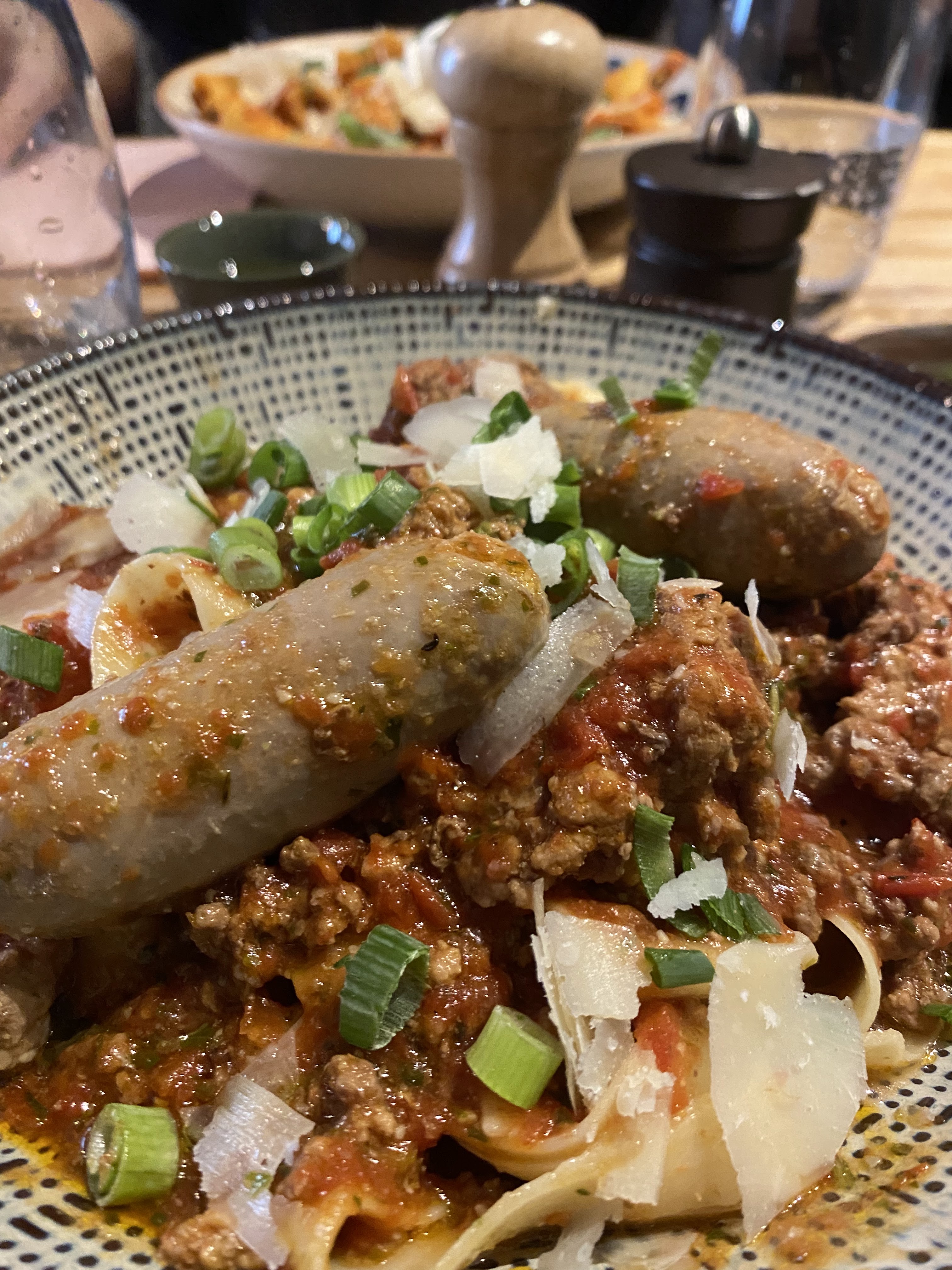 Pizza brûlée et tagliatelles grasses trop al dente. Le vin était bon, ça nous fait plaisir. Vous pouvez sauter cette tente.