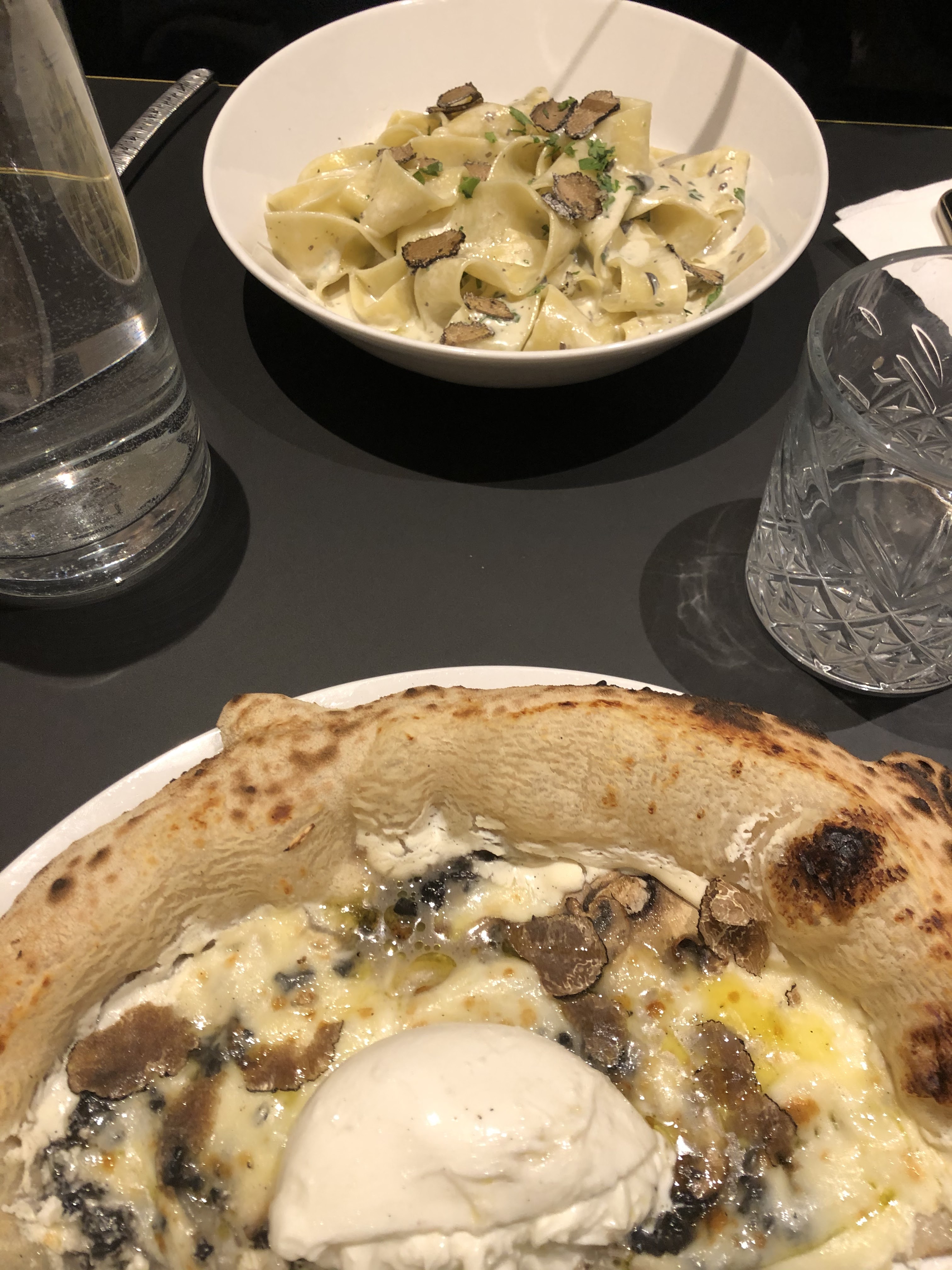 La qualité des produits est médiocre. La mozzarella ressemble à du plastique et les truffes n'ont aucun goût. De plus, les prix sont honteux. 80€ pour 2 pizzas et deux plats de pates. Je ne recommande pas.