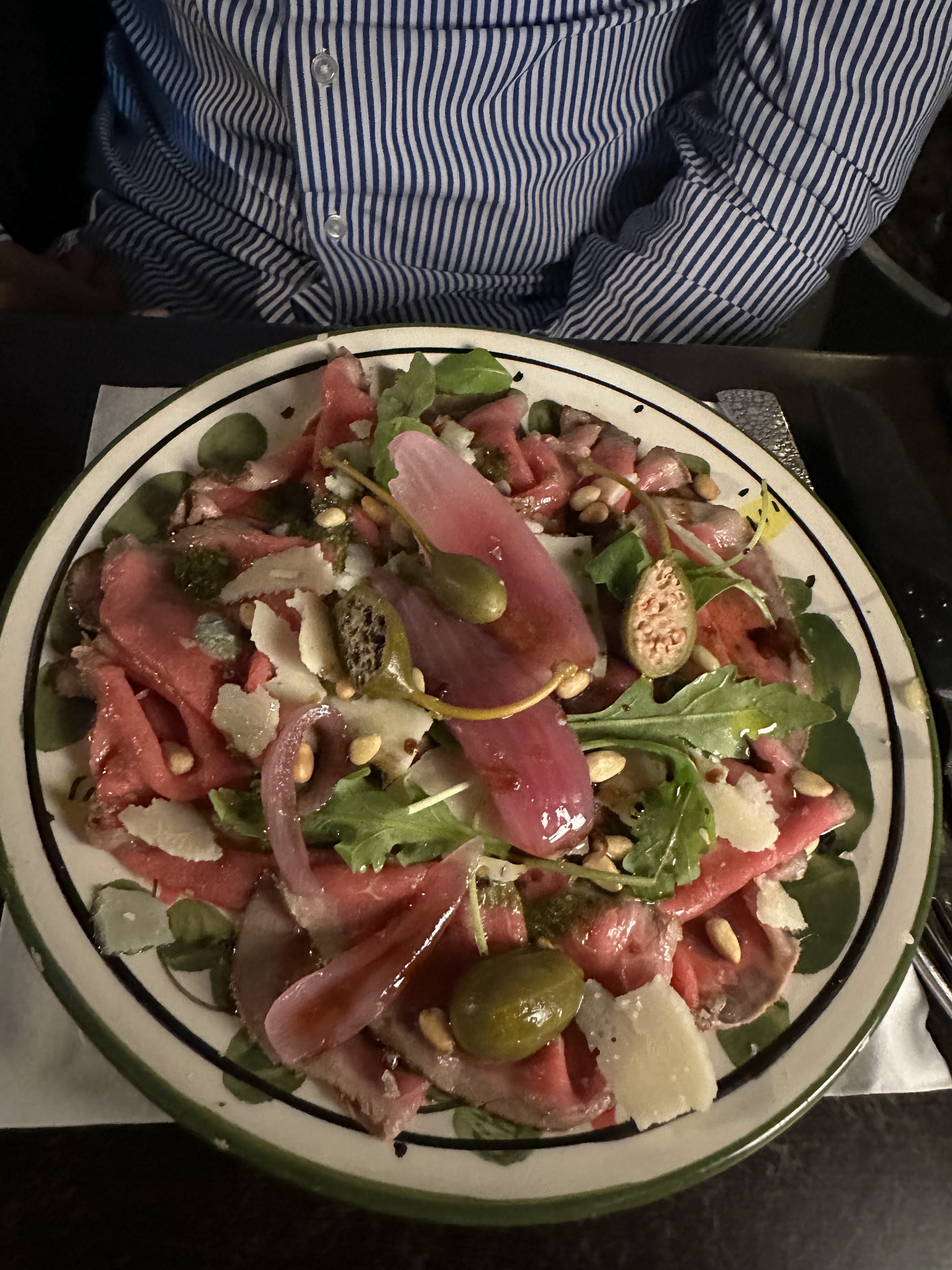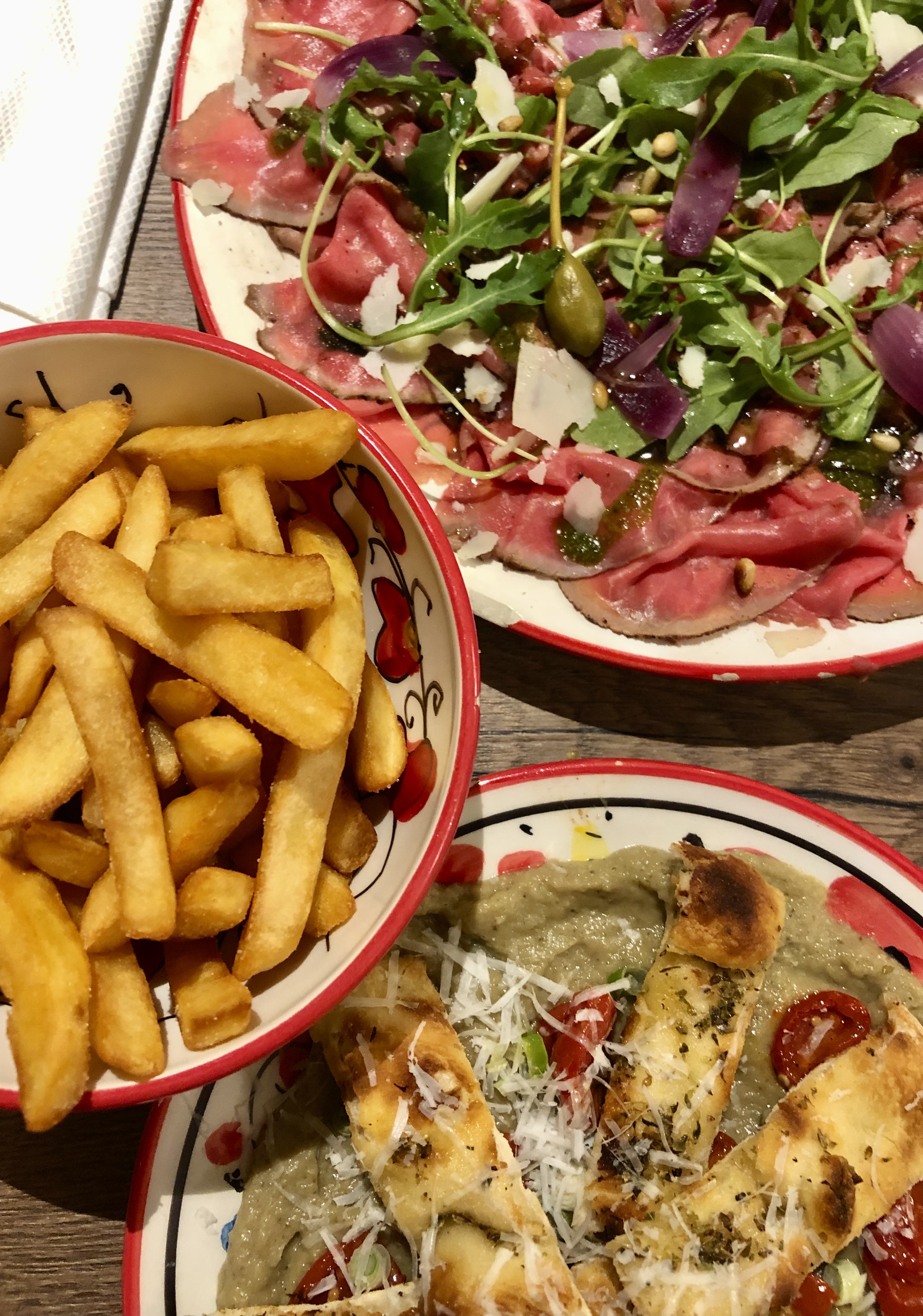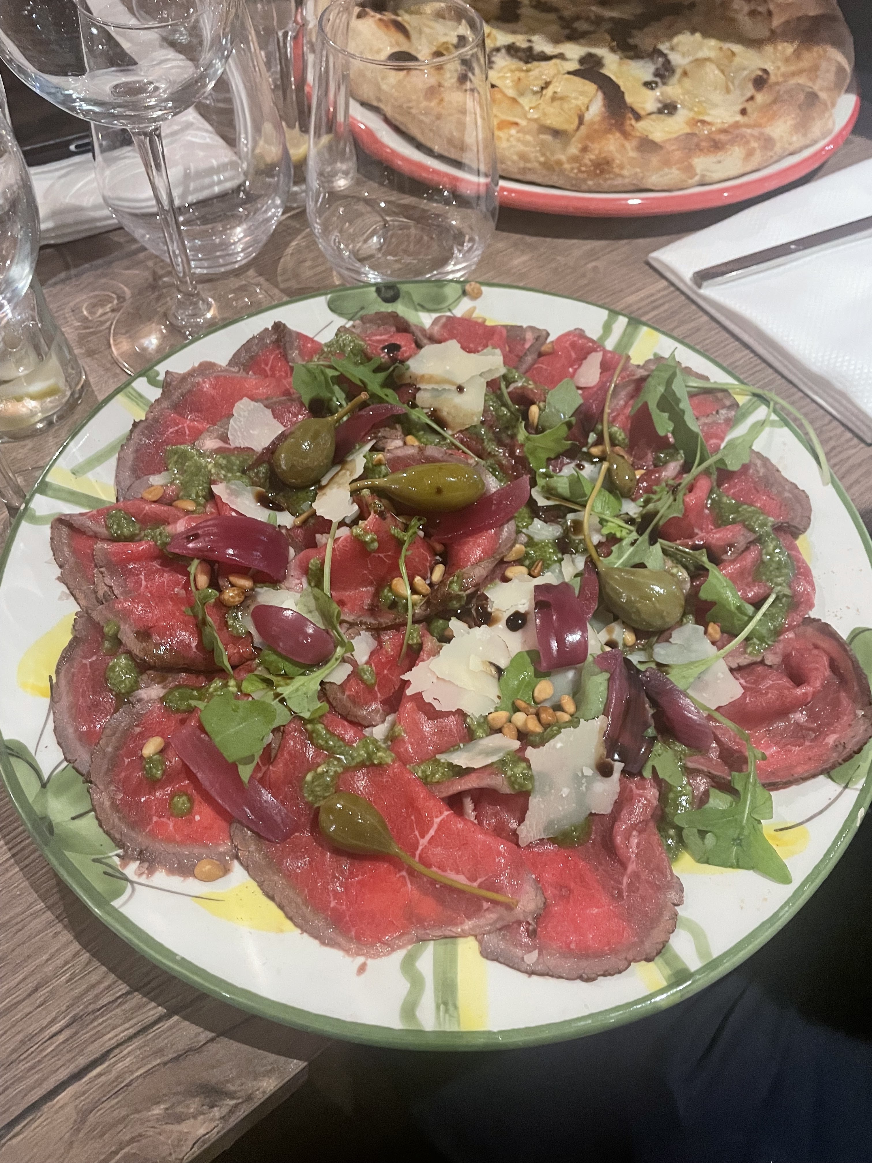 Le carpaccio est vraiment très bon ! La pizza est bonne ! Le service assez classique sans plus. Par contre dans la salle du fond l'ambiance est un peu désagréable trop de bruit ! On a du mal à s'entendre parler.
