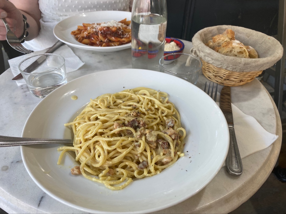 Je suis toujours sceptique à l’idée de prendre des pâtes au restaurant, celui-ci ne m’a pas fait changer d’avis. Les pâtes au pesto étaient bonnes mais pas incroyables. De même pour le tiramisu. La serveuse était assez froide et les boissons sont servies en cannettes. Pas l’idée que je m’étais fait d’un resto italien. Bref pas mauvais mais basique.