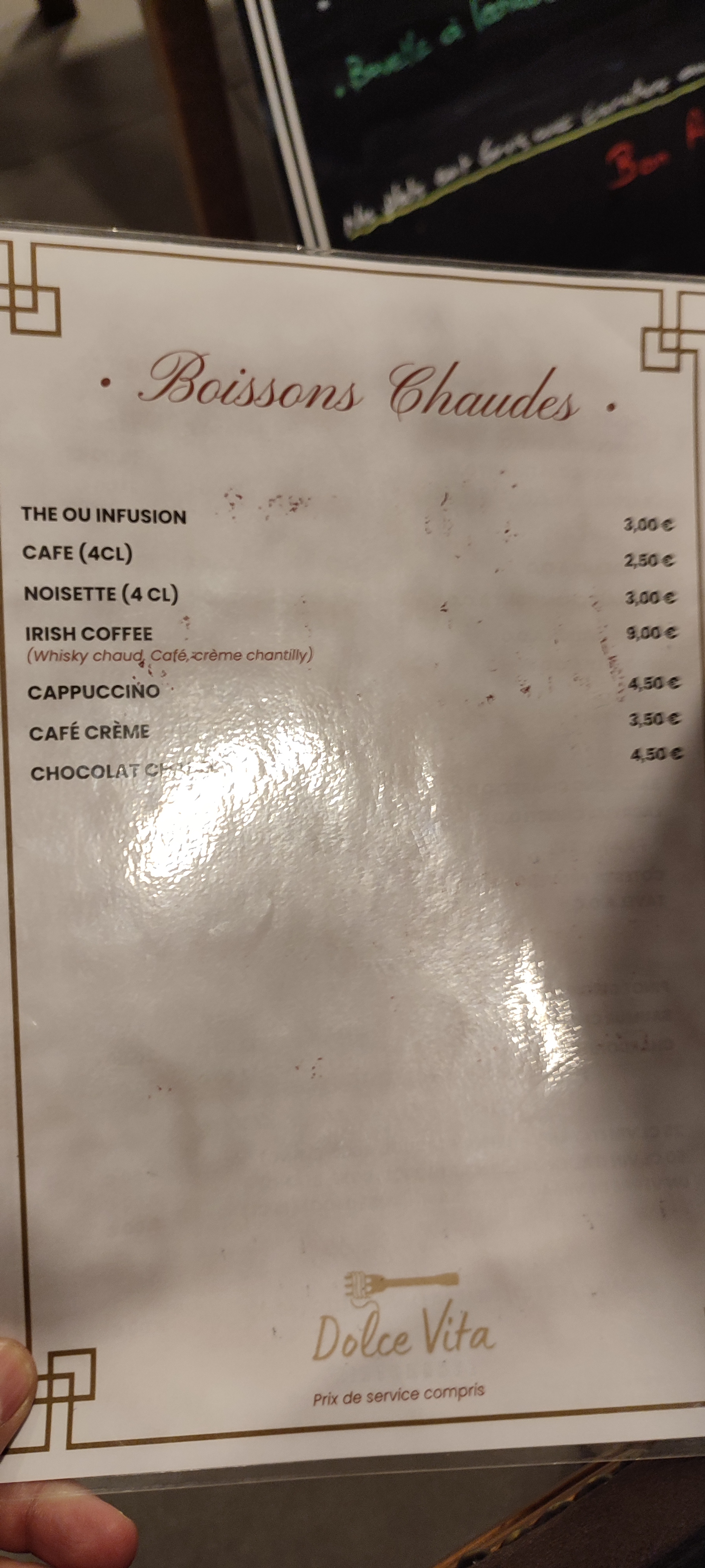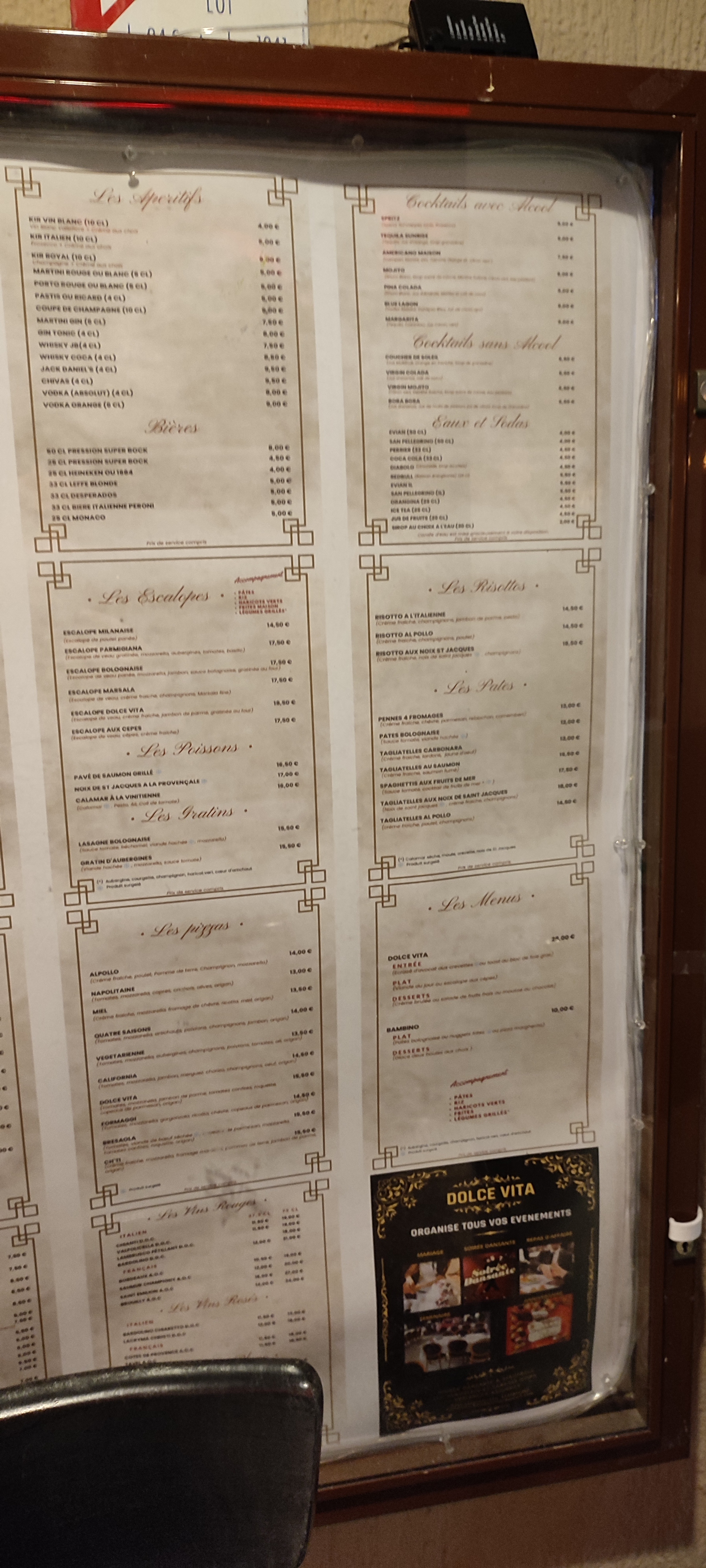 L'équipe Dolce Vita vous remercie Philippe pour votre avis. Les commentaires fournis nous permettent de nous améliorer constamment et d'aller de l'avant. Nous travaillons dur chaque jour pour satisfaire nos clients du mieux possible. Par conséquent navrés que cela n'ait pas été le cas pour vous ☹️ Nous présentons une carte claire et complète avec la composition des entrées (dont le carpaccio et le chèvre chaud) et le prix du vin. Nous sommes ravis de vous compter parmi nos fidèles habitués et nous nous ferons un plaisir de vous offrir l'apéritif, lors de votre prochaine visite.