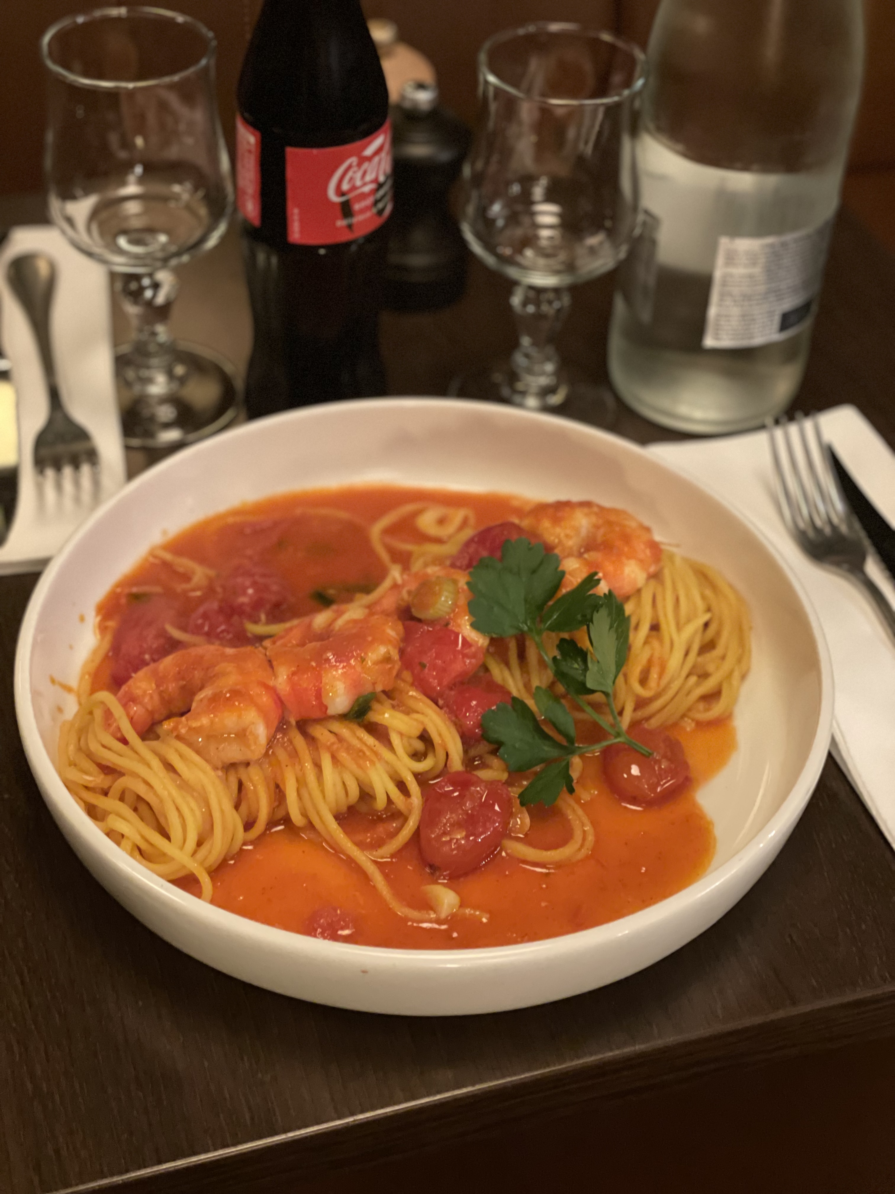J'avais choisi le plat du jour je crois... pâtes aux gambas, sauce tomates... Un délicieux souvenir.