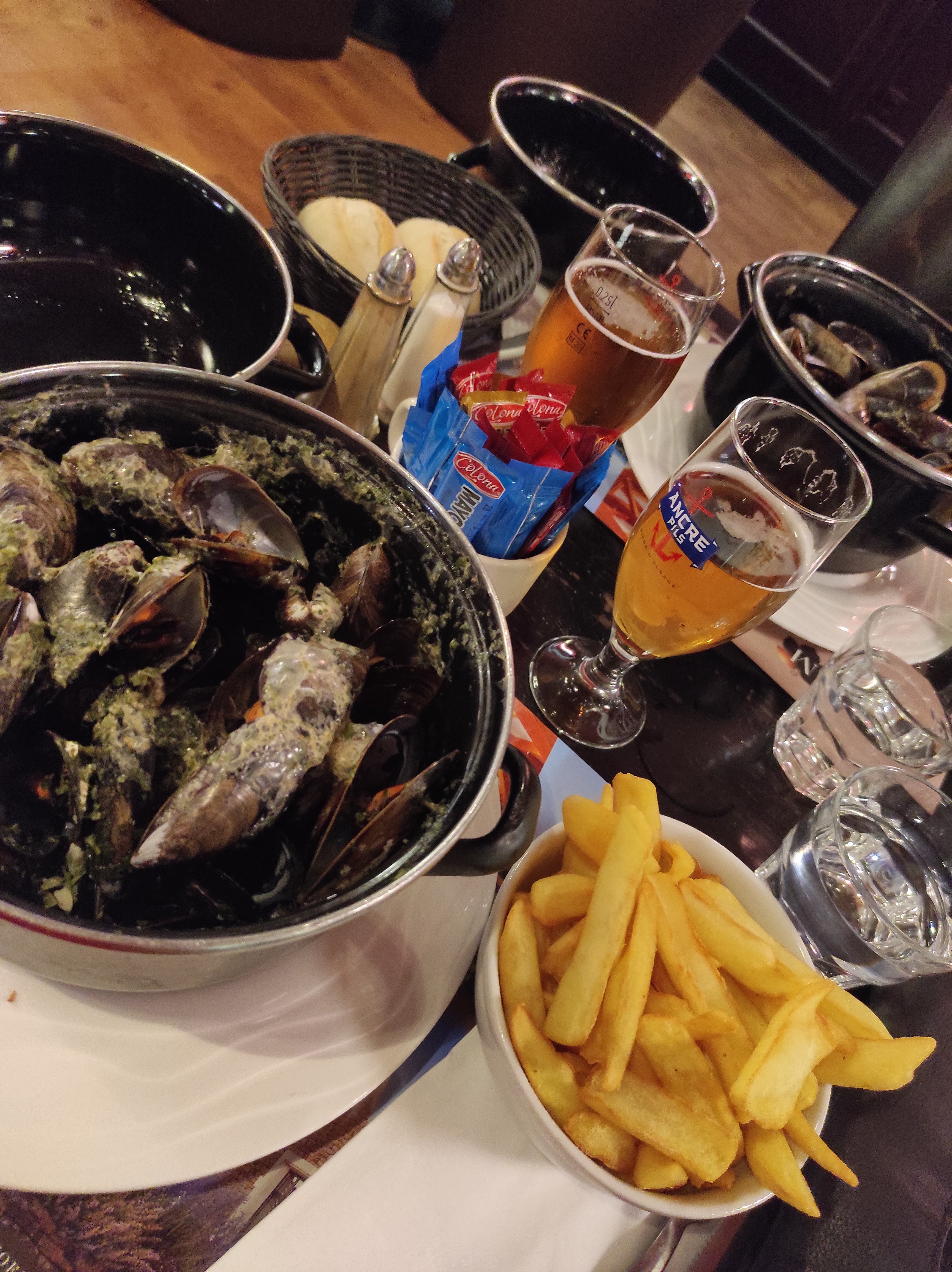 Moules frites excellentes et chaudes, l escalope avec tagliatelle bonne, agréable et serveuses sympathiques