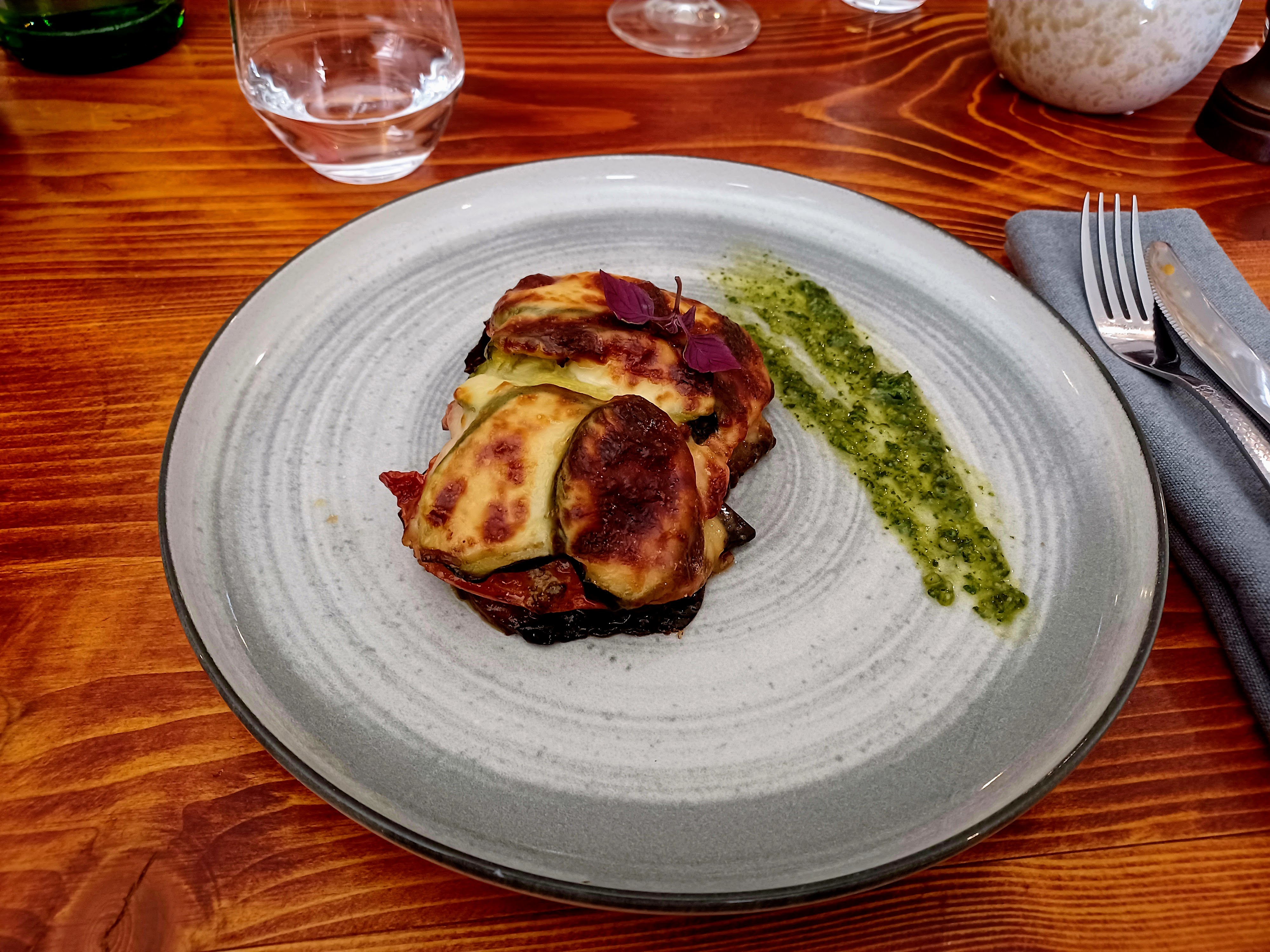 Cuisine très simple qui manque de générosité dans l’assiette Aubergine Assiette de fines tranches de poulpes Pâtes Lasagne Crème brûlée Rien de bien incroyable …