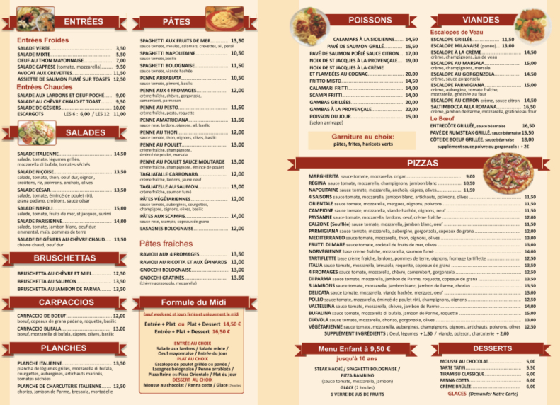 La carte propose de nombreux plats. Pizza excellentes. Accueil agréable. Le personnel est professionnel et très sympathique. Toujours au top pour satisfaire sa clientèle. C est toujours plaisant de passer un moment dans ce restaurant. Je recommande !