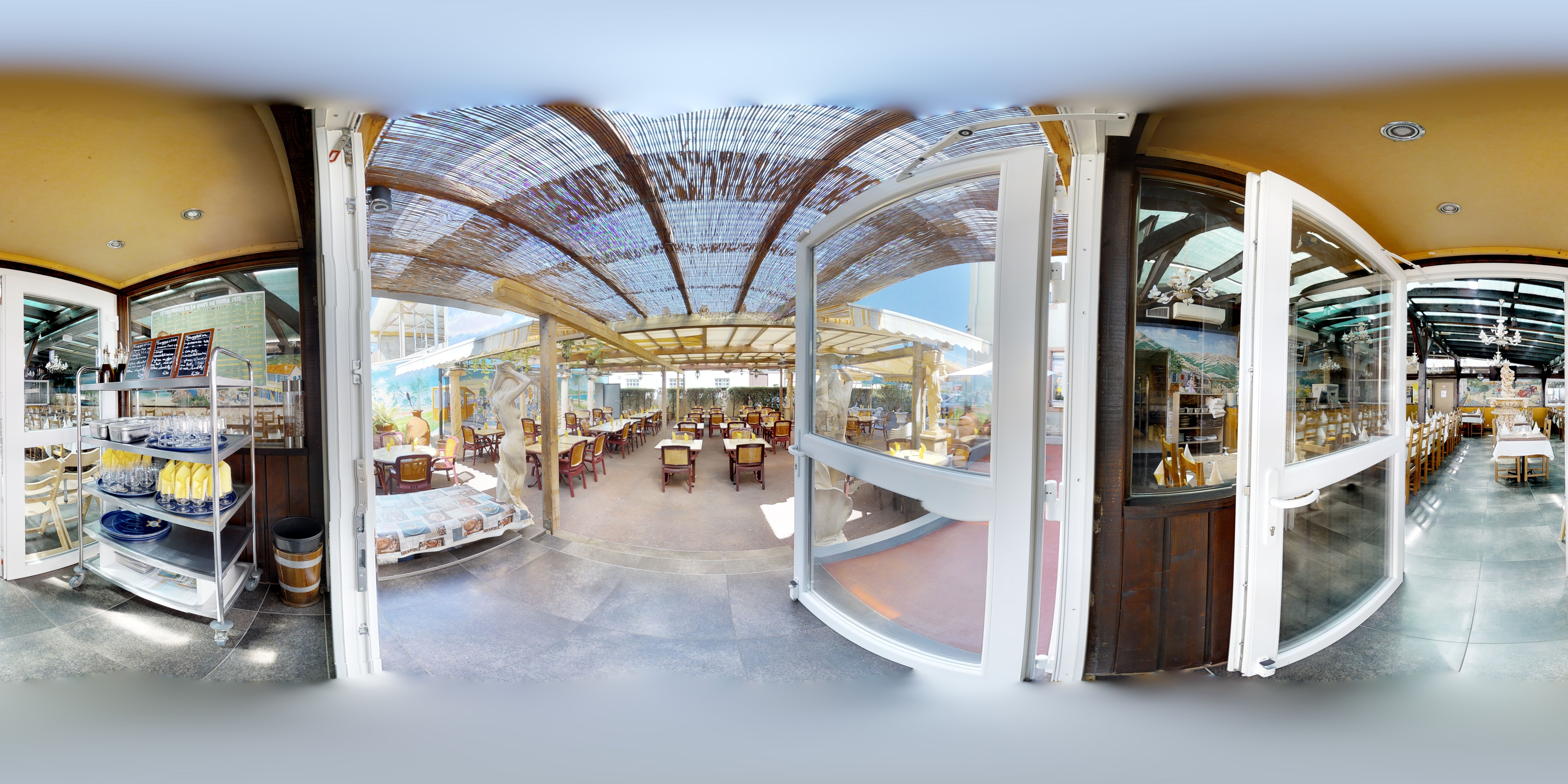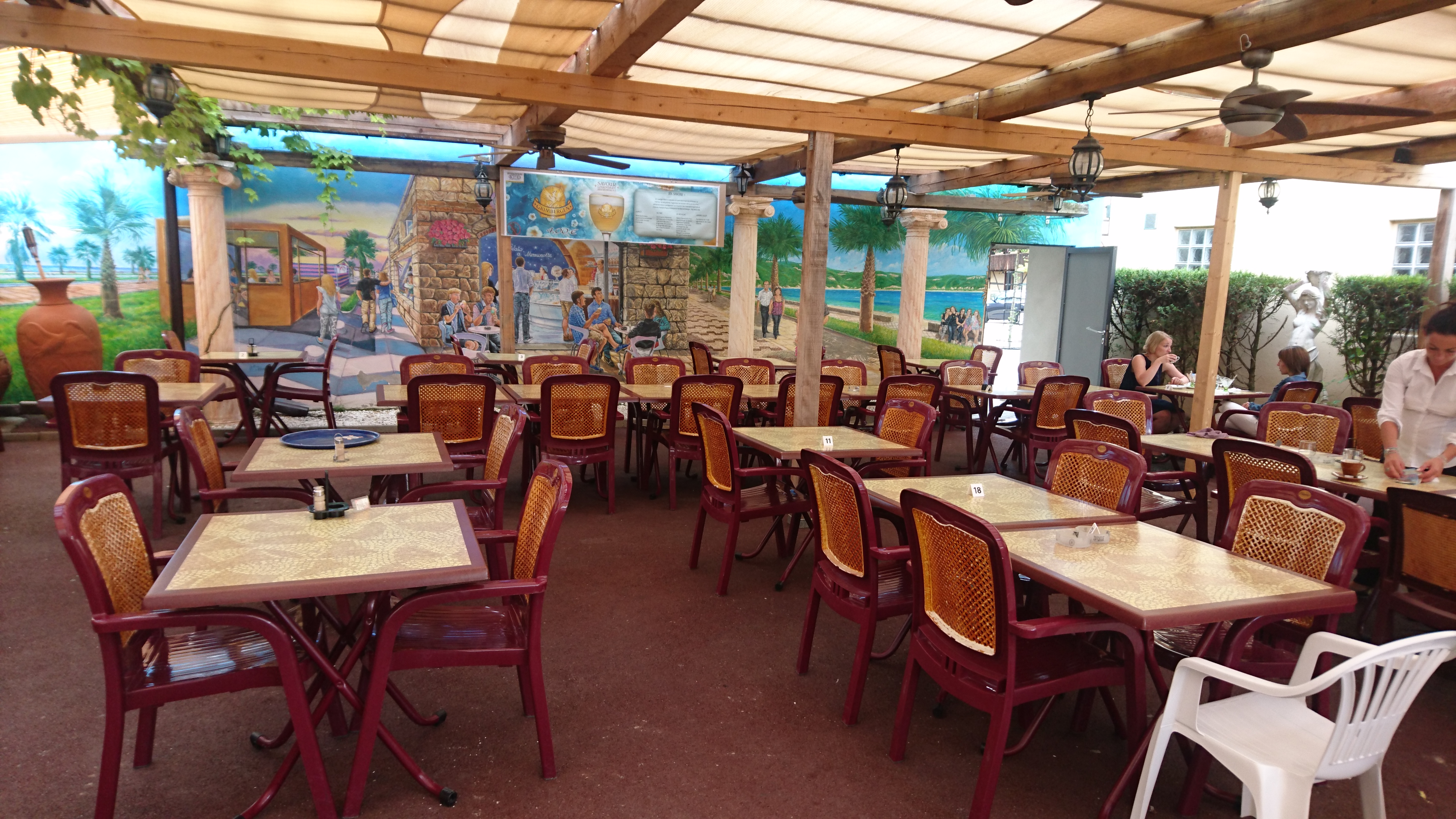 On mange très bien et le personnel est très agréable. Une fresque gigantesque vous promène sur les plages d'Italie .