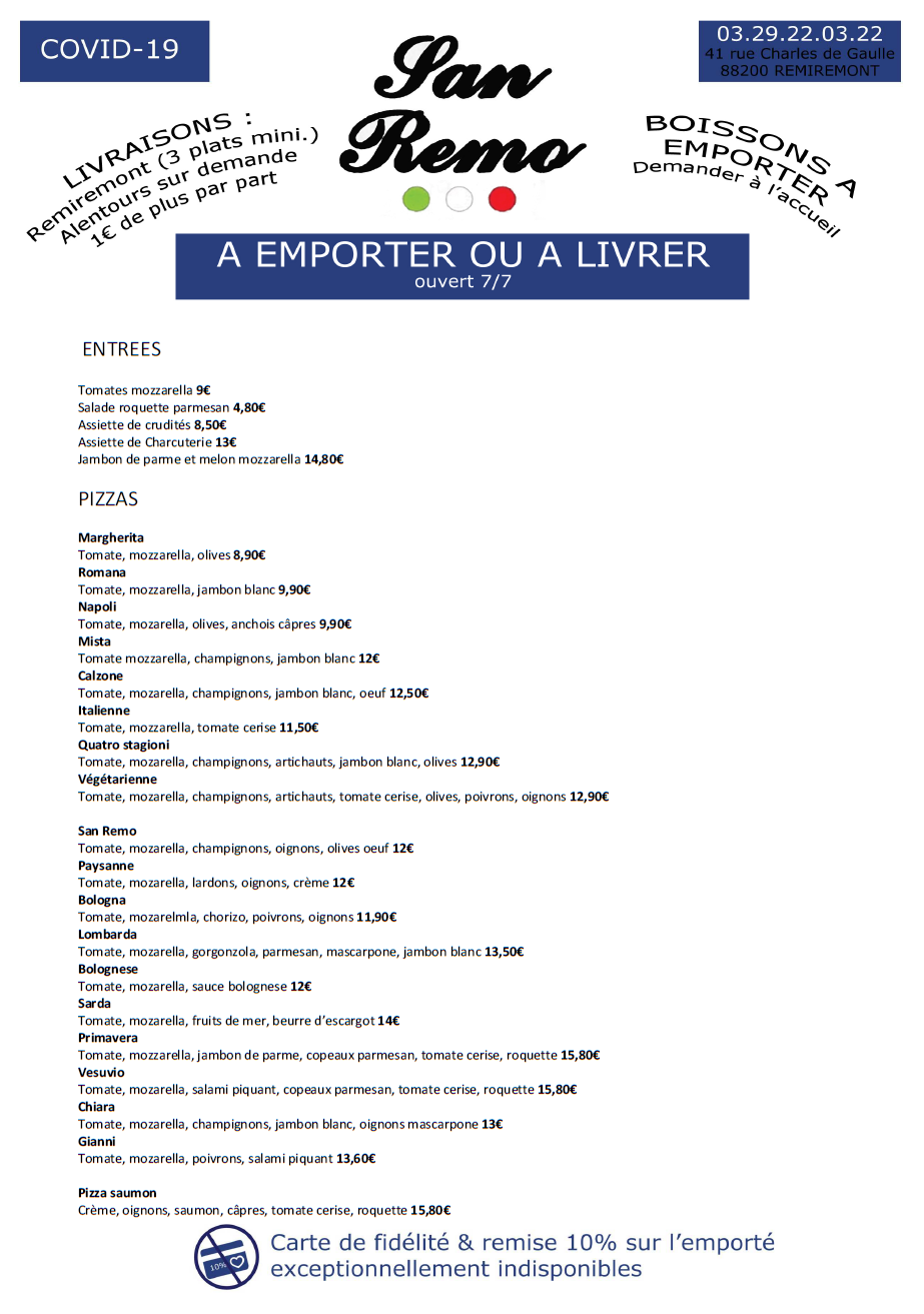 Bonjour, en raison du COVID 19, nous avons dû adapter les tarifs ainsi que la carte. Les 10% de réductions et la carte de fidélité ont donc été suspendu durant cette période. En revanche, la nouvelle carte (COVID 19) reste disponible sur la devanture de l'établissement ainsi que les nouvelles consignes sanitaires et commerciales. La carte peut également vous être envoyé par mail sur demande. Concernant les tarifs modifiés, comprenez bien, monsieur, que le coût des matières premières (produits frais) a augmenté de façon assez conséquente. Vous pouvez également le constater dans les grande surfaces. De plus, étant donné que nous sommes un restaurant italiens, la majeure partie de nos produits sont importés directement d'Italie. Enfin, soyez sûre, que si vos pizzas n'ont pas été assez fournies, on fera mieux la prochaine fois. Nous espérons que vous nous referez confiance une prochaine fois et en cette période difficile pour tout le monde. Au plaisir de vous revoir au SAN REMO A bientôt L'équipe du SAN REMO