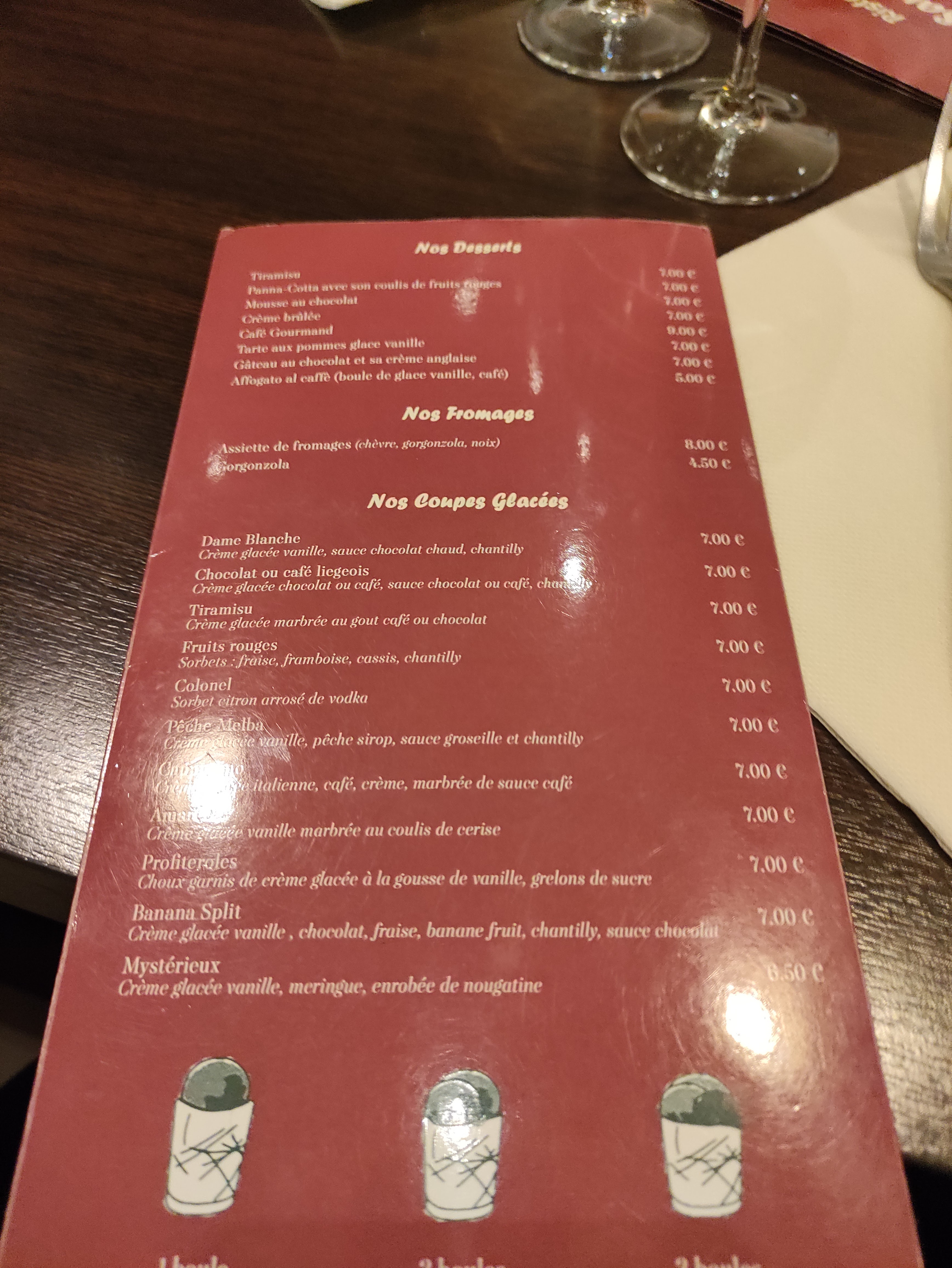Je ne recommanderai pas ce restaurant. Le prix est un peu élevé pour un menu à 24€ sans grande qualité particulière tout y est basique ni plus ni moins. Les glaces sont arrivées à moitiée givrée et pour couronner le tout, des cafards ce sont invité à notre table ce soir. Mon dieu que ne fut pas la terreur des enfants... Les patrons semblent au courant du problème lorsqu'on se permet de les informer des petits visiteurs malvenus. Un conseil, gardez votre argent et allez ailleurs.